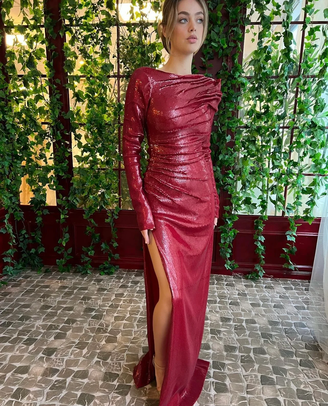 Step into the spotlight with this stunning deep ruby red gown, a masterpiece designed for those unforgettable moments. Crafted from luxurious glossy sequined fabric, this dress glimmers with every movement, while the soft Lycra tulle under-layer ensures comfort and grace. The mermaid silhouette perfectly hugs your figure, accentuating curves with an elegant, draped design. A side invisible zipper maintains the seamless allure, leading to a tasteful side leg slit that adds just the right touch of allure. Structured shoulder pads create a poised, sophisticated profile. But it's the back of the dress that truly captivates: an open oval cut offers a surprise element of elegance, balancing the long sleeves finished with unique v-cut cuffs. This exquisite gown is the ideal choice for galas, red-carpet events, or any special occasion where making a memorable entrance is not just desired, but essential.