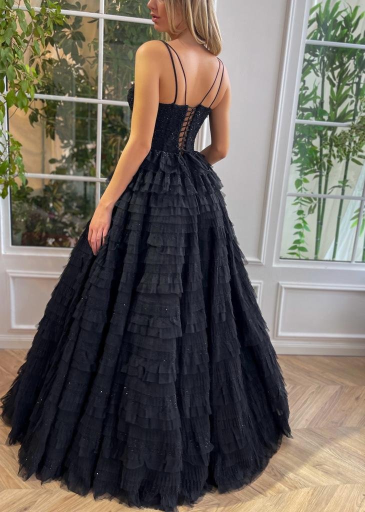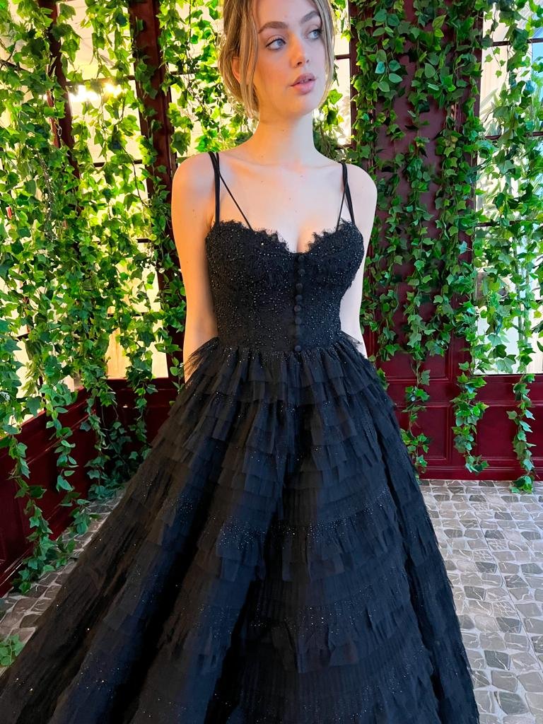 This stunning evening dress, a true fusion of contemporary sophistication and timeless allure, promises to make your night unforgettable. Designed with a form-fitting bodice, it sparkles brilliantly with an array of black sequins that create a captivating, textured shimmer. The sweetheart neckline, accented with a subtle bust cup detail, offers a hint of romance, while the delicate, double spaghetti straps add a touch of finesse. A line of covered buttons trails elegantly down the front, enhancing its refined charm. The dress then unfolds into a magnificent, full-tiered skirt. Each layer of tulle, ruffled to perfection, contributes to a voluminous, dramatically sweeping silhouette that gracefully cascades to the floor. Completing this exquisite gown is the lace-up back, which not only ensures a perfect fit but also adds a vintage touch, making this dress an impeccable choice for any evening event where making a grand impression is a must.