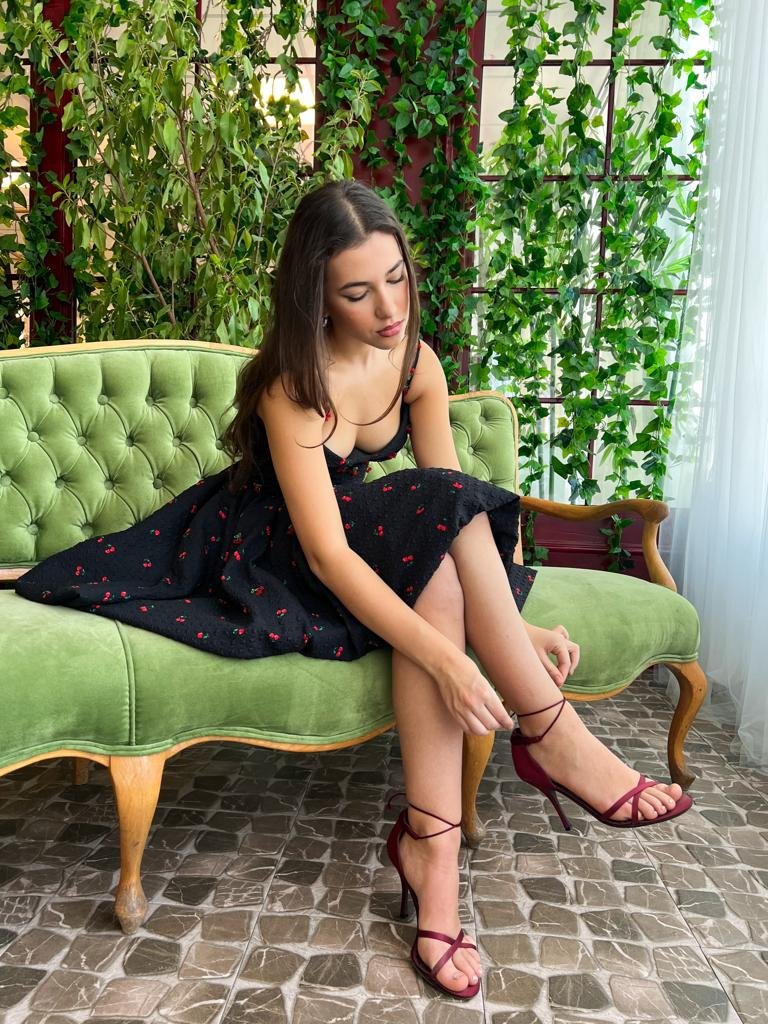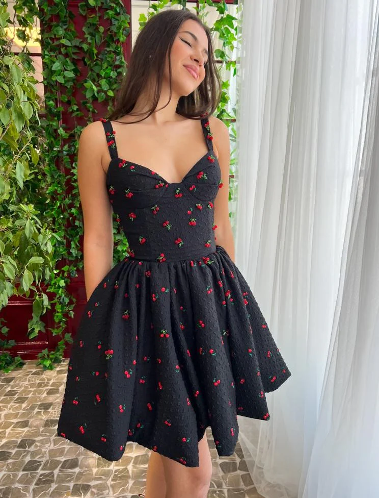 Discover elegance and playfulness intertwined in our exquisite mini-length dress, crafted from luxurious brocade with a rich, dark base adorned with a textured pattern of red cherries and leaves, highlighted by crystal cherry embroidery. The design features a flattering sweetheart neckline, a bustier corset with built-in pads and boning for perfect fit, and slim, supportive shoulder straps. The cinched waist flows into a flared and pleated skirt, adding a delightful fullness thanks to the underneath black lining paired with a stiff netted tulle layer. Functional yet stylish, it includes inseam pockets and a charming lace-up back, combining practicality with a touch of whimsy, perfect for making a memorable fashion statement.