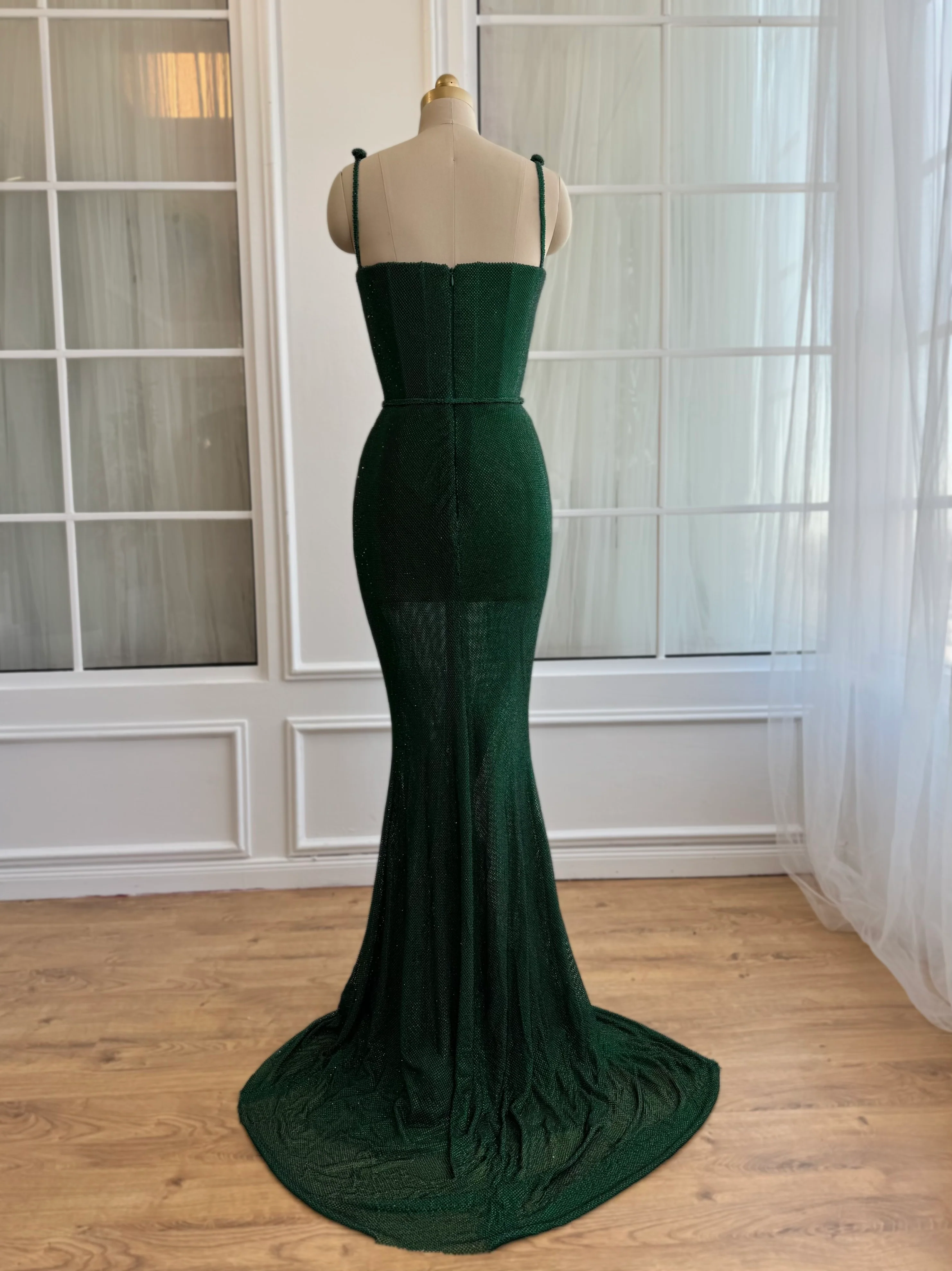 Embrace the essence of elegance with this captivating emerald green gown, a masterpiece designed for high-end, formal events where making a statement is indispensable. This dress features a mesmerizing speckle of glinting embellishments throughout, creating a starlit effect that's bound to turn heads. The sweetheart neckline, paired with a bustier corset complete with built-in pads and boning, offers a flattering, sculpted fit. The mermaid-style silhouette, hugging the body and flaring out gracefully at the knees, is both classic and enchanting. Delicate shoulder straps provide subtle yet effective support, enhancing comfort without compromising on style. A decorative bow detail on the bust adds a touch of whimsy, while the zippered back ensures a seamless fit. Beneath the transparent, floor-length overlay lies a sleek Lycra mini dress, adding a modern twist to this timelessly sophisticated ensemble. This gown is not just a dress, but a statement of luxury and style, perfect for those moments when you want to leave an unforgettable impression.