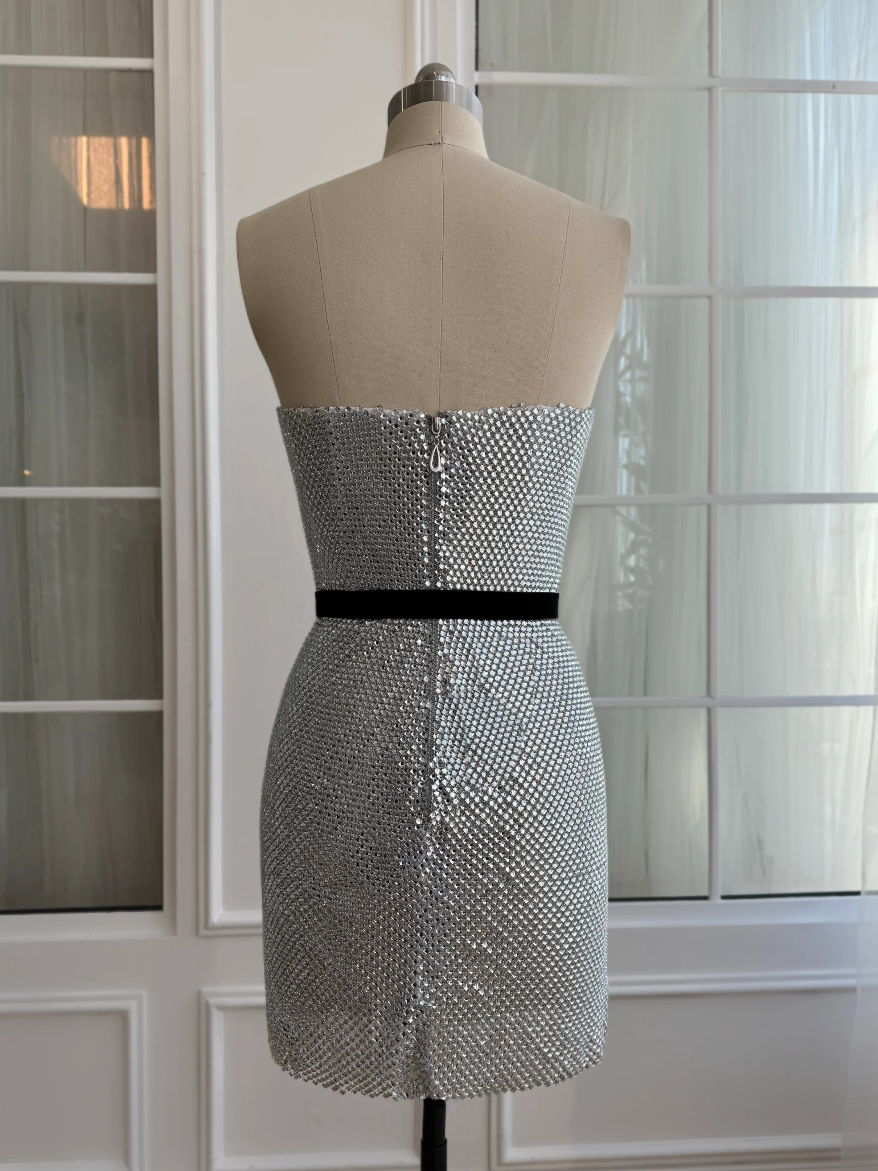 Dazzle the night away in this stunning silver sequined mini dress, designed for those who love to shine at gala events, proms, or any formal evening occasion. The glittery surface of the dress catches the light with every move, making you the center of attention. Its strapless silhouette and bustier with built-in pads and boning beautifully accentuate your figure, offering both support and a slimming effect. The dress is intricately fitted and structured, ensuring a sleek and elegant look. Adding a touch of sophisticated contrast, the black velvet belt ties into a graceful bow, enhancing the waistline. For comfort and ease of movement, it features an underlying lycra layer. The metallic zippered back adds a modern edge to this timeless piece, making it a must-have for your wardrobe.