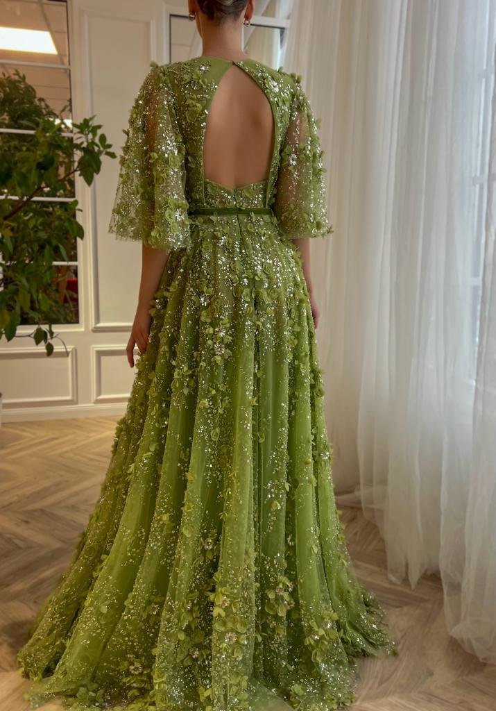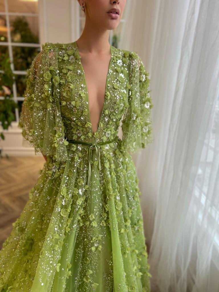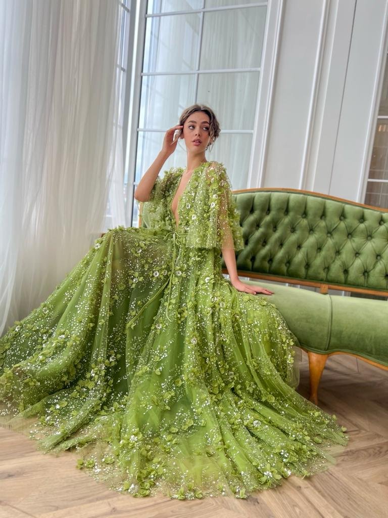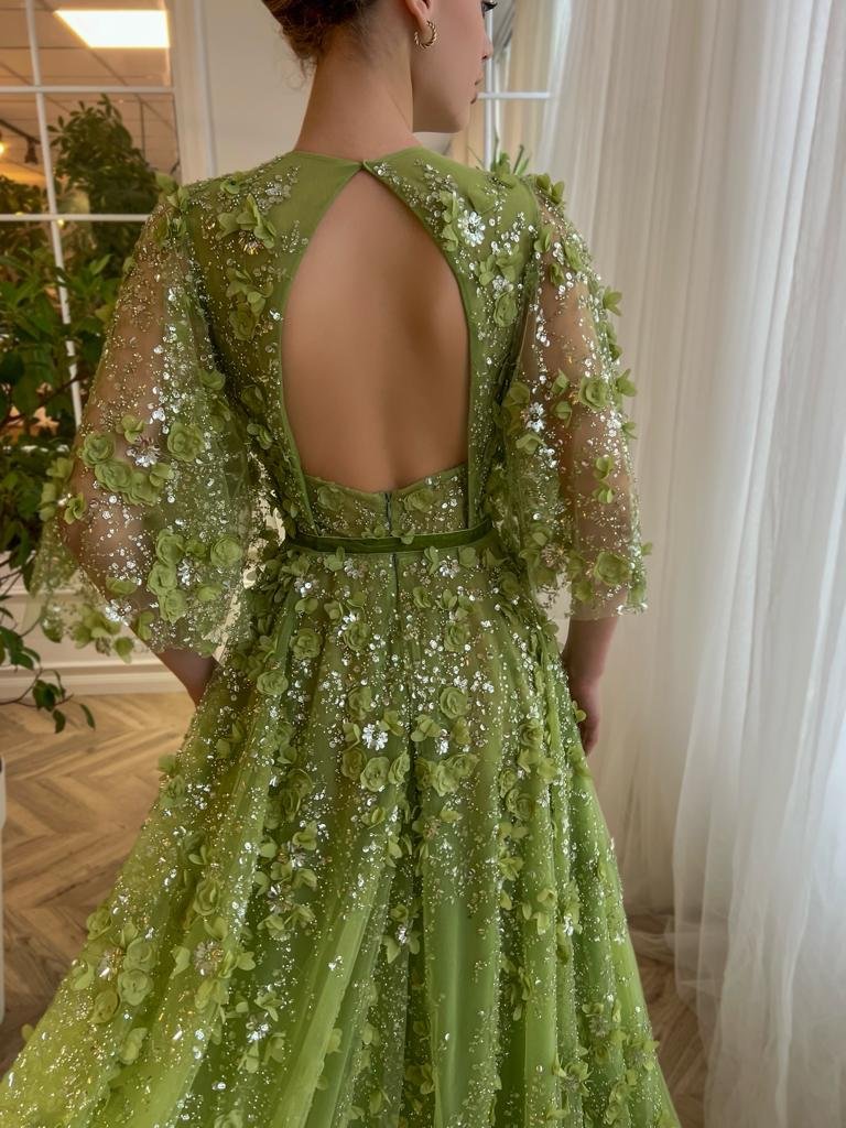 Embrace the essence of nature's artistry with this beautifully crafted dress, a fusion of earthy allure and winter chic. The soft green lace fabric is a garden of intricately embroidered flowers, complemented by a hand-applied array of delicate embellishments. Its plunging V-neckline and cinched waist accentuate your figure, flowing into an A-line silhouette that flutters with every step. The flared short bell sleeves add a touch of whimsy, while the decorative velvet bow belt cinches the look with a graceful finish. Designed with an open back for a hint of allure, this dress is underpinned with tulle layers that add volume and movement, making it a perfect piece for those who admire nature's beauty and seek to mirror it in their wardrobe.
