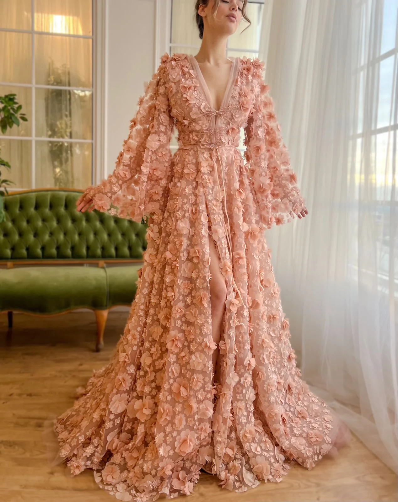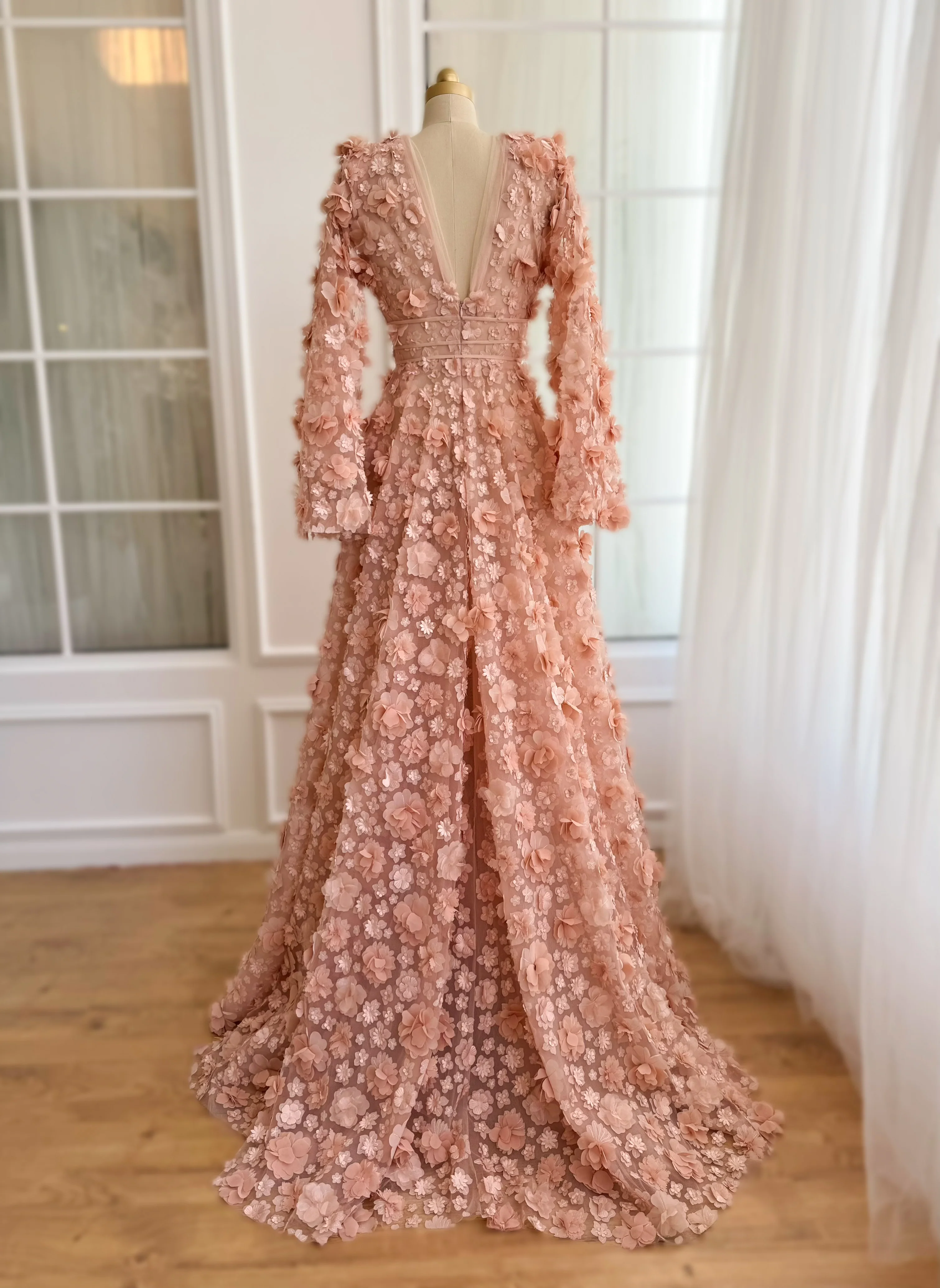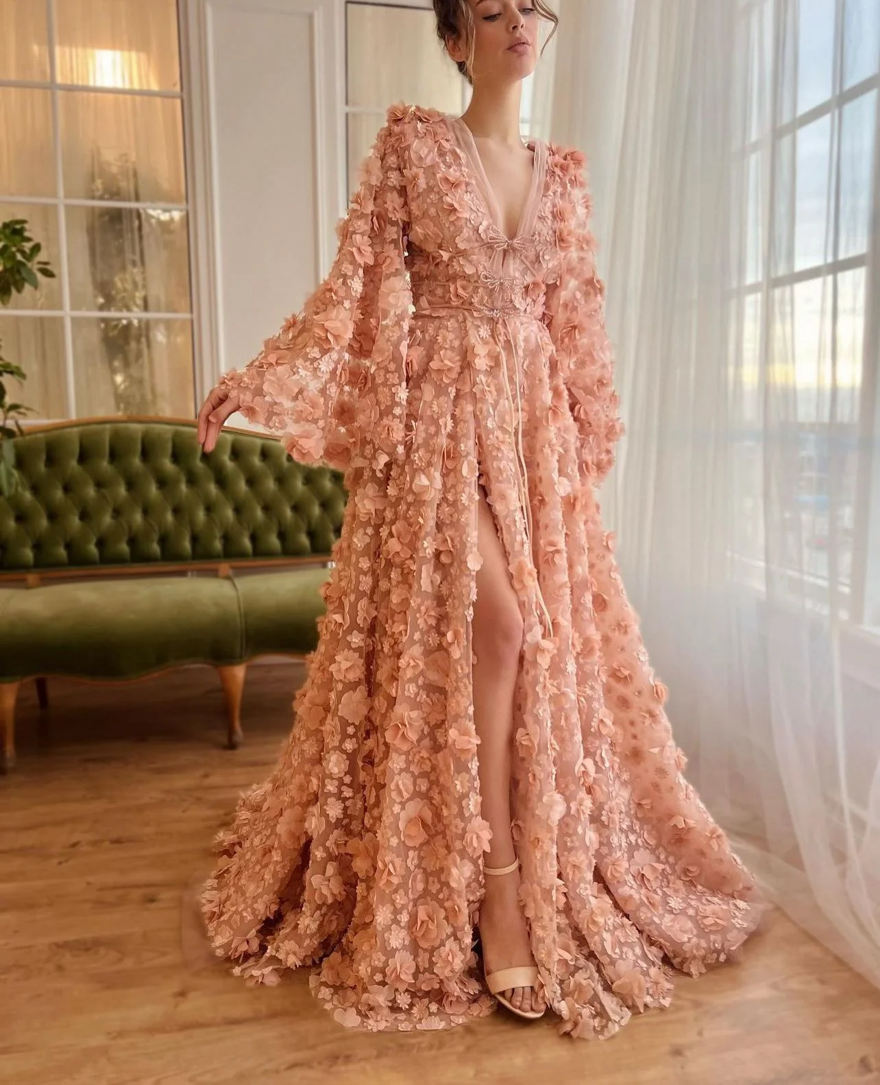 Embrace the romance of spring in our blush peach-pink gown, adorned with meticulously embroidered blooms lace fabric. The dress features stunning floral appliqués that lend a captivating three-dimensional texture, enhancing its ethereal allure. Designed with an illusion plunging V-neckline, the gown is intricately detailed with delicate beadwork and charming bow embellishments. The long, sheer bell sleeves add a touch of whimsical grace, complementing the cinched waist that gracefully transitions into an A-line silhouette with a daring thigh-high slit. This floor-length masterpiece culminates in a breathtaking sweeping train, perfect for making a statement. The dress is elegantly finished with a V-shaped opening at the back, a practical zipper closure, and is thoughtfully lined with layers of tulle and a discreet pair of shorts for comfort and poise.