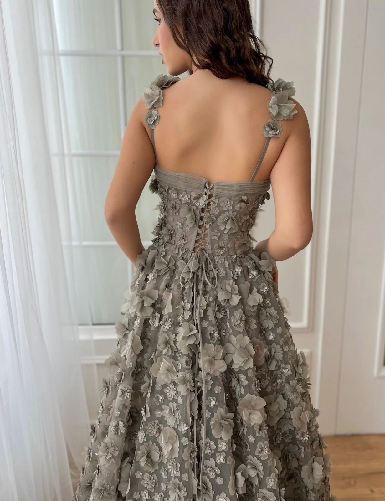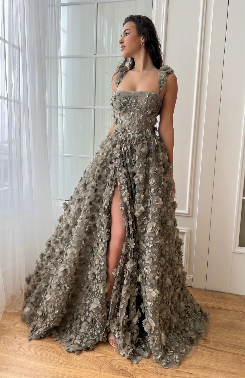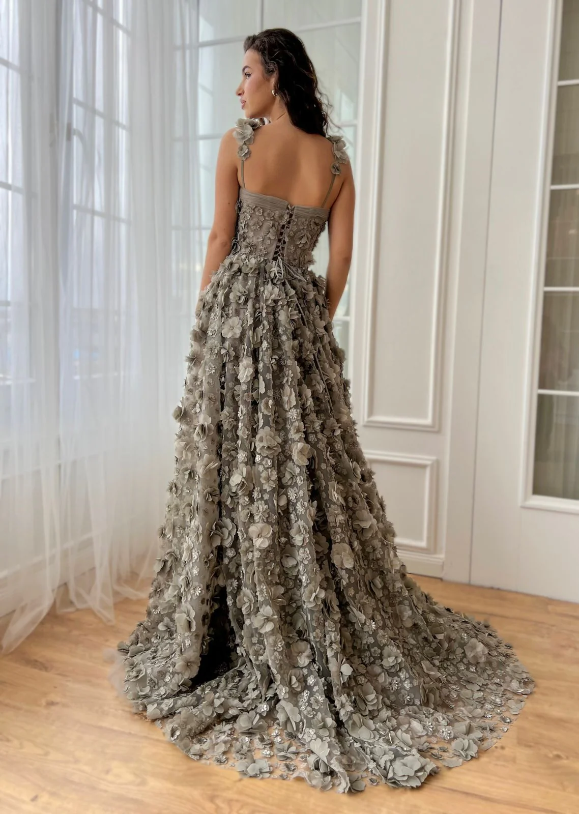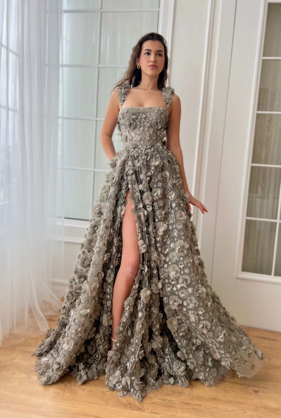 Step into a world of refined sophistication with this exquisite gray dress, designed to make you feel captivating on your special day. Featuring intricate 3D flower embroidery lace fabric, this gown boasts a classic square neckline and an A-line silhouette that gracefully sweeps the floor, culminating in a delicate train. The dress is expertly crafted with a bustier corset, complete with built-in pads and boning, ensuring a flawless fit. Adorned with embellished blossom-designed straps and a lace-up back, it offers both support and style. Unique touches like inseam pockets and a daring leg slit add a modern twist, while the clear tear-drop shape crystal embroidery injects a hint of glamour. Underneath, layers of tulle paired with a chic pair of shorts offer both comfort and elegance, making this dress a perfect fusion of fashion and function for your momentous occasion.