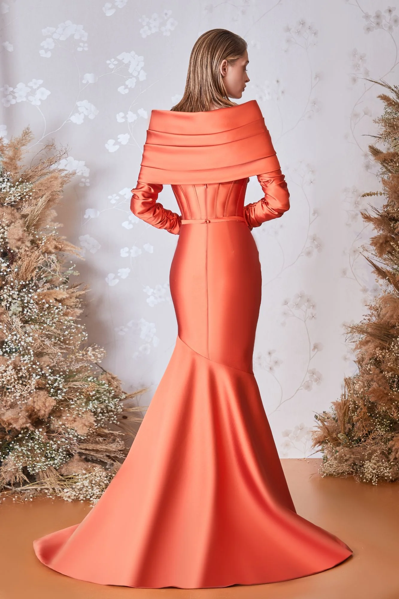 Wide shoulders with beaded boning bodice and pleated back cuff with rushed long fitted sleeves, banded waist and mermaid cut out skirt.