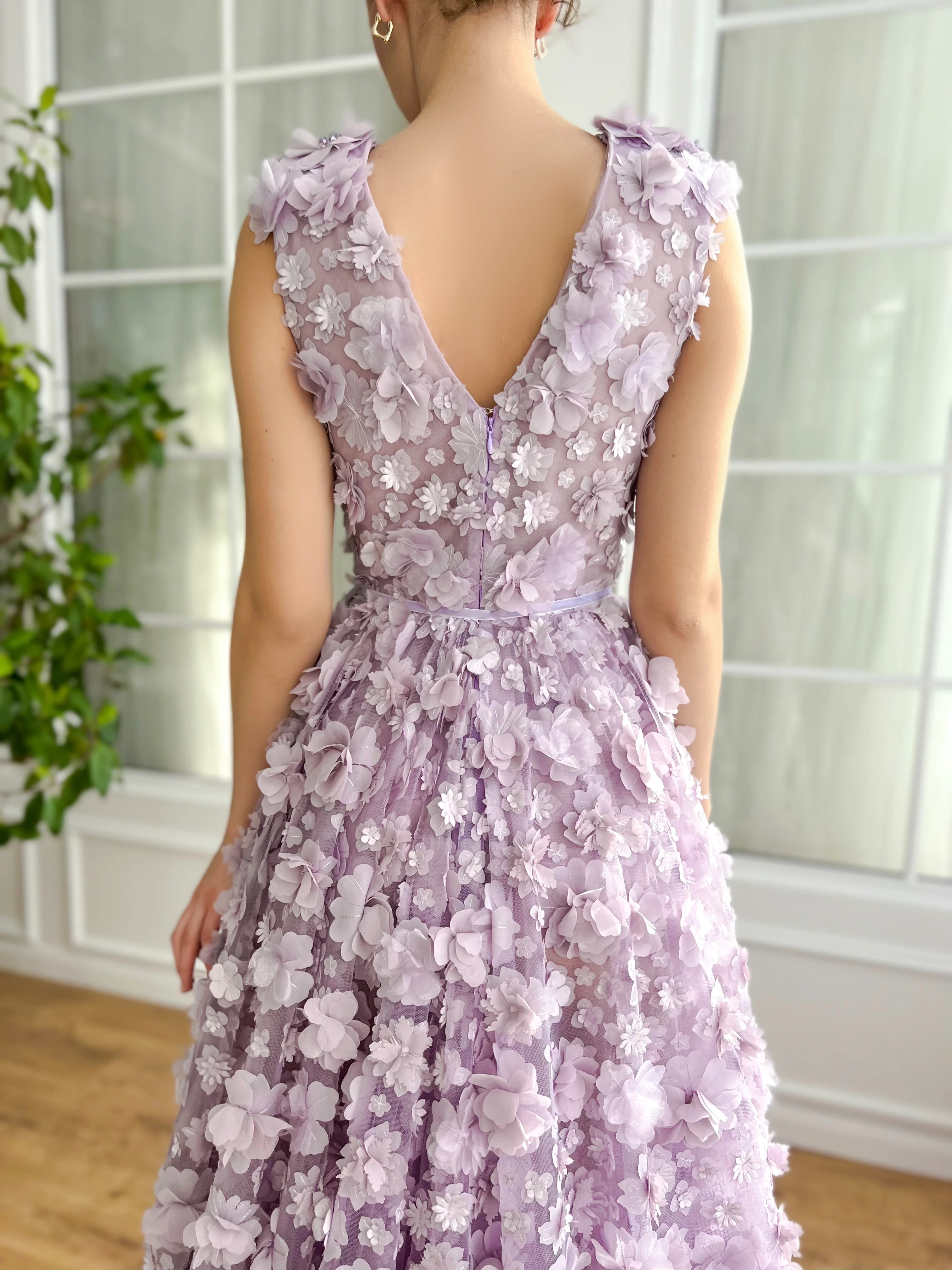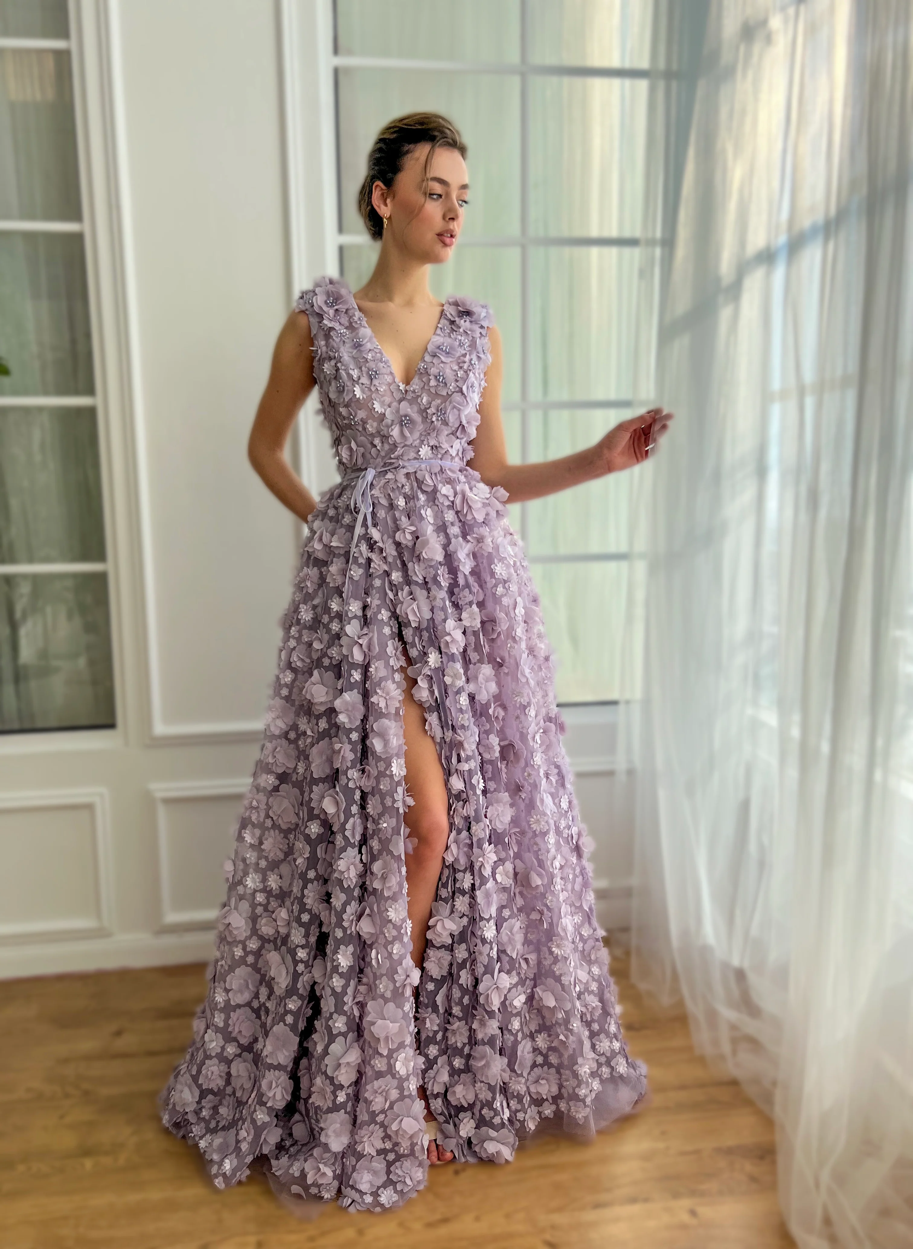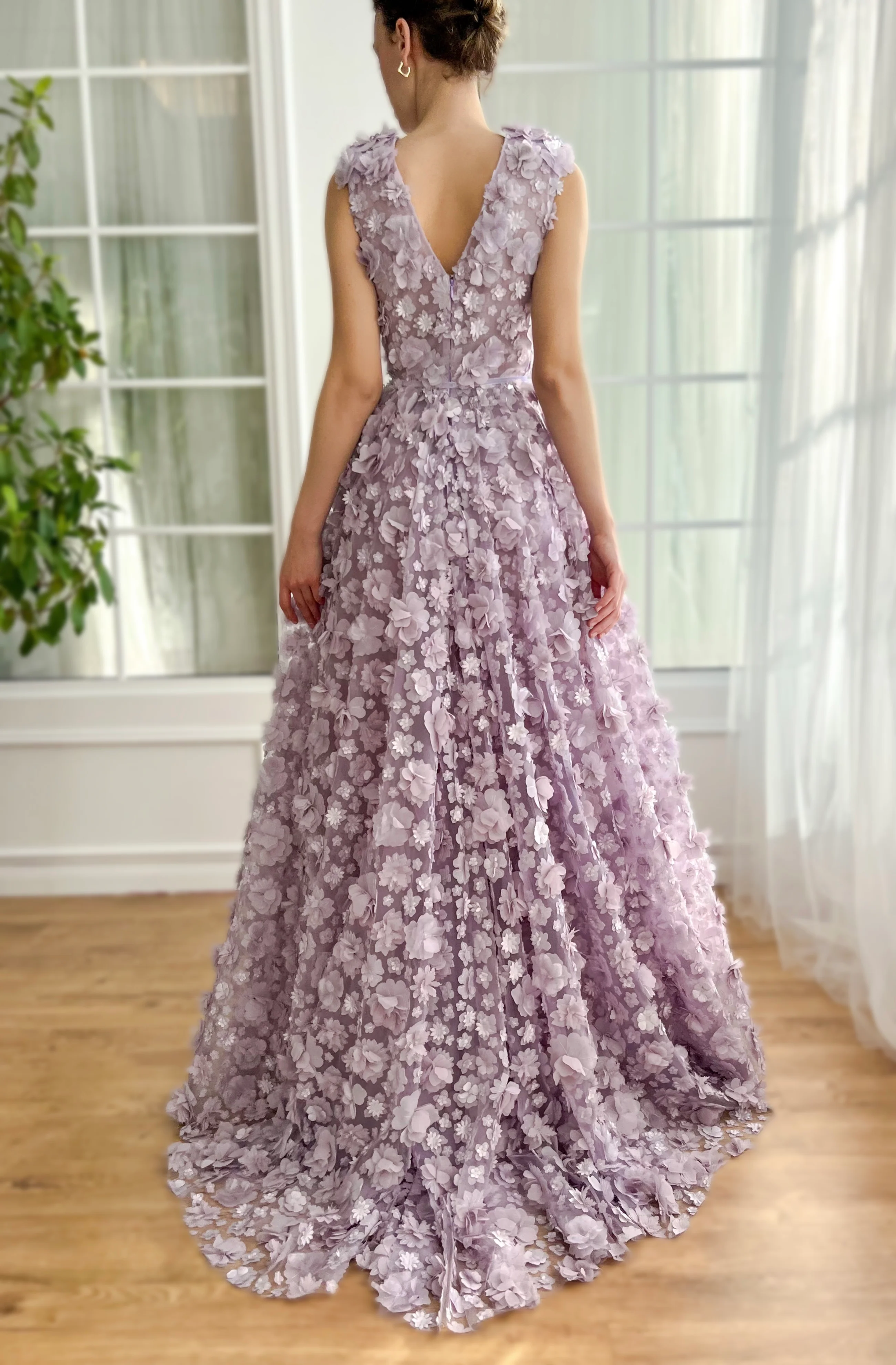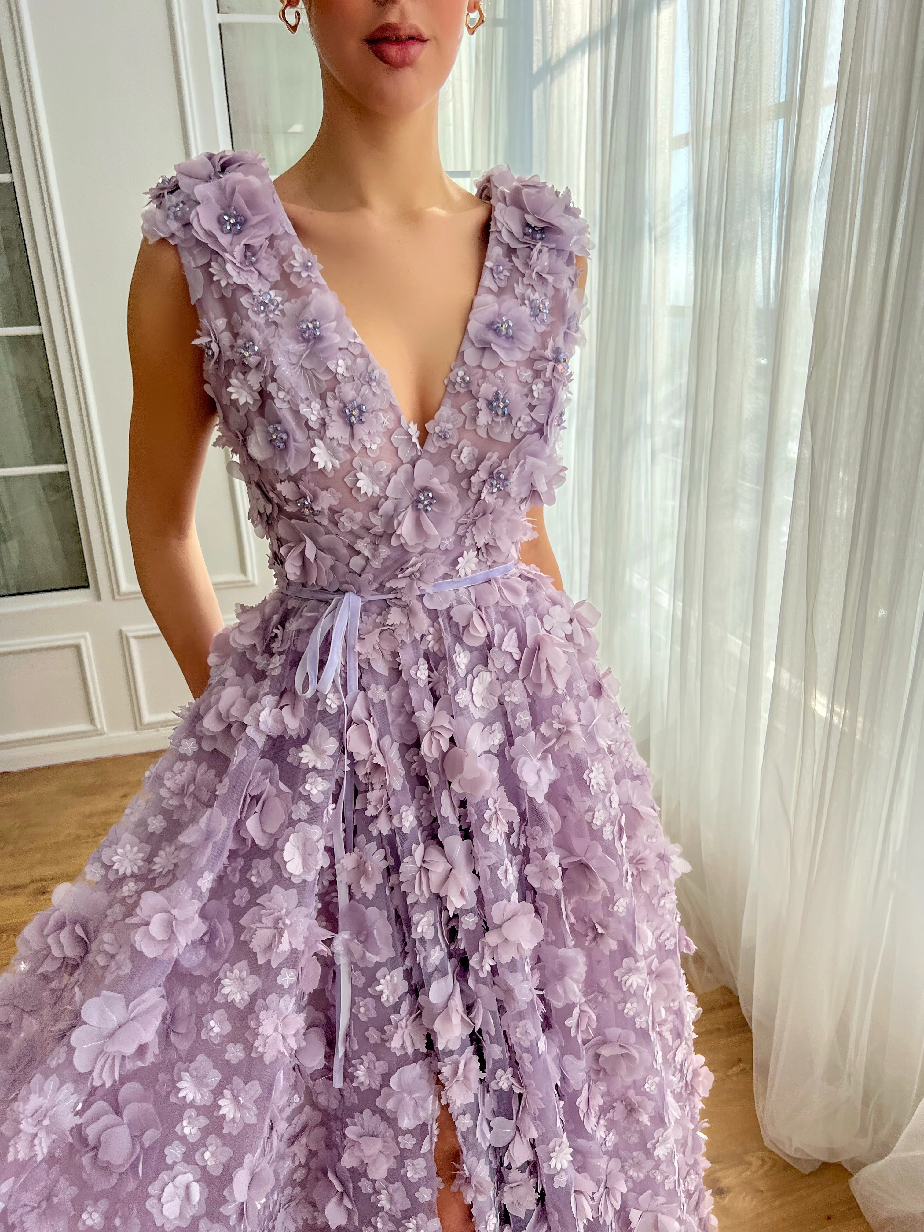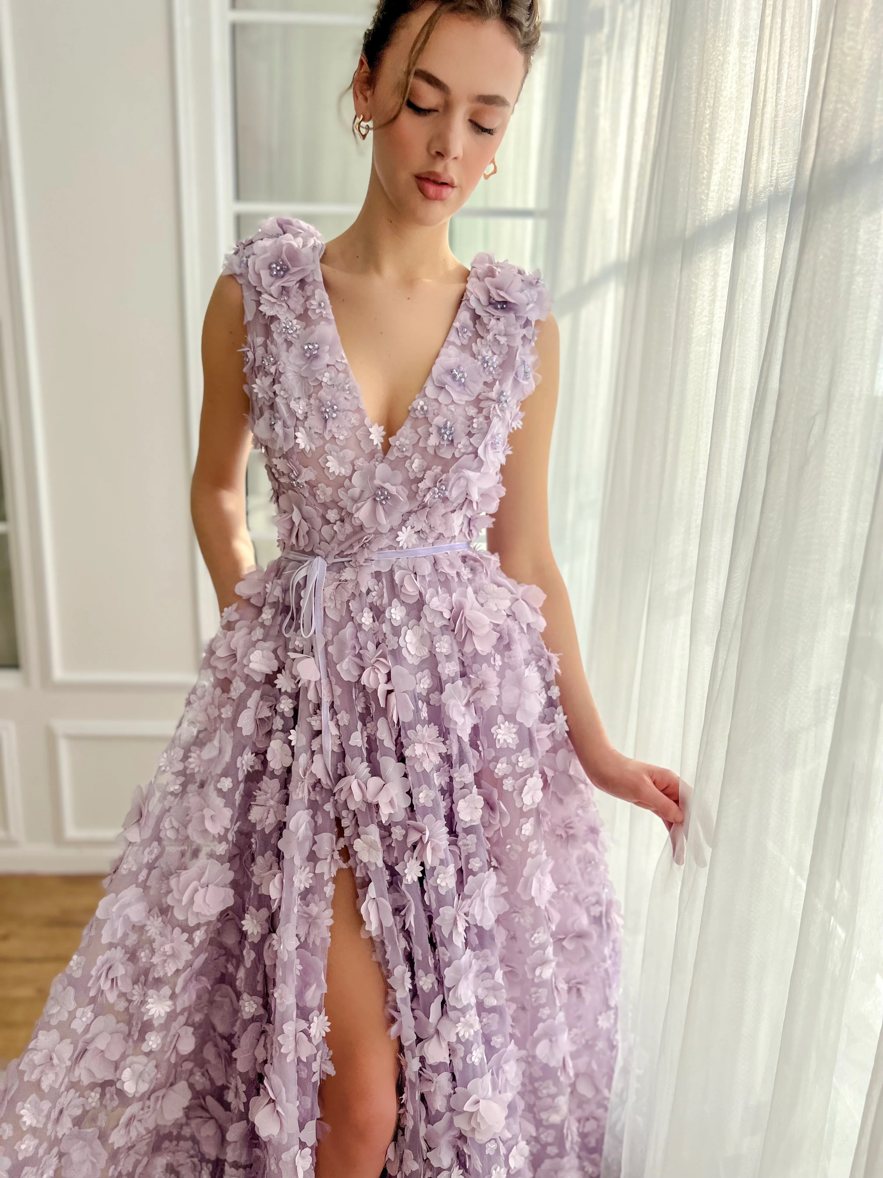 Discover elegance redefined with our enchanting floor-length dress, designed to captivate and charm at every turn. Bathed in a soft lavender hue, this masterpiece is crafted from high-quality, embroidered lace fabric that boasts a luxurious three-dimensional texture, inviting blooming lace patterns to dance across its surface. The dress features a flattering V-neckline, complemented by a wrap top that gently hugs your figure, leading down to a cinched waist and flowing into a graceful A-line silhouette. Thoughtfully designed with inseam pockets and a leg slit, it merges convenience with allure. A decorative bow ribbon belt cinches the waist, while the addition of shoulder pads adds a touch of structure. The dress cascades down to a sweep train, creating a breathtaking silhouette that moves with you. Hidden underneath, layers of tulle add volume and a whimsical touch, paired with a practical pair of shorts for comfort and ease. A zippered back ensures a seamless fit. This dress is not just an outfit; it's a statement of sophistication and timeless beauty, perfect for making lasting memories.