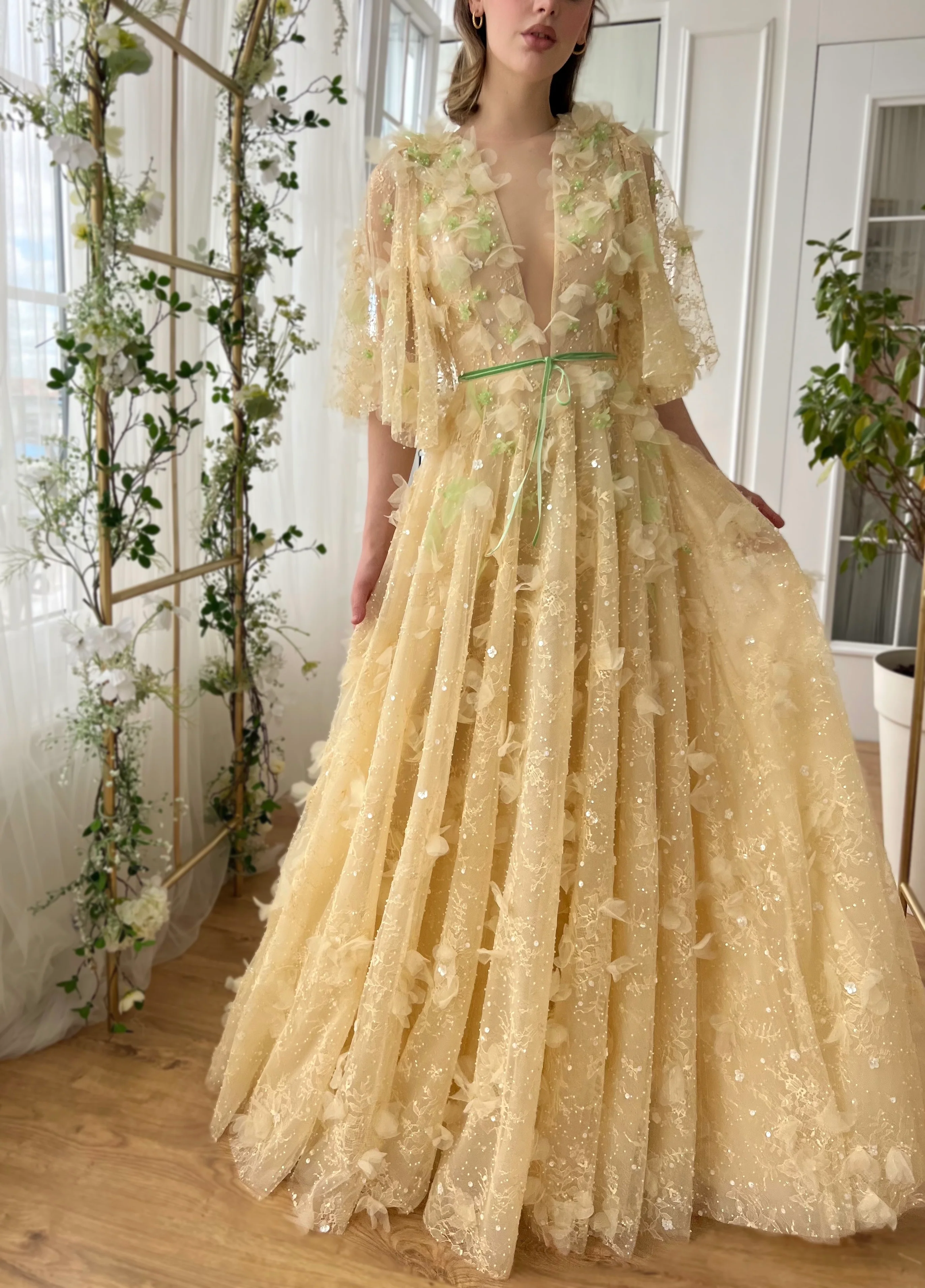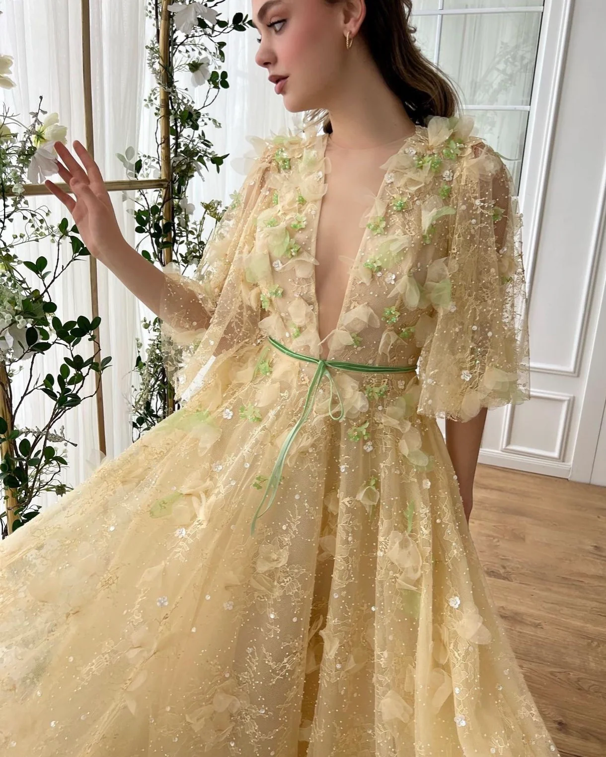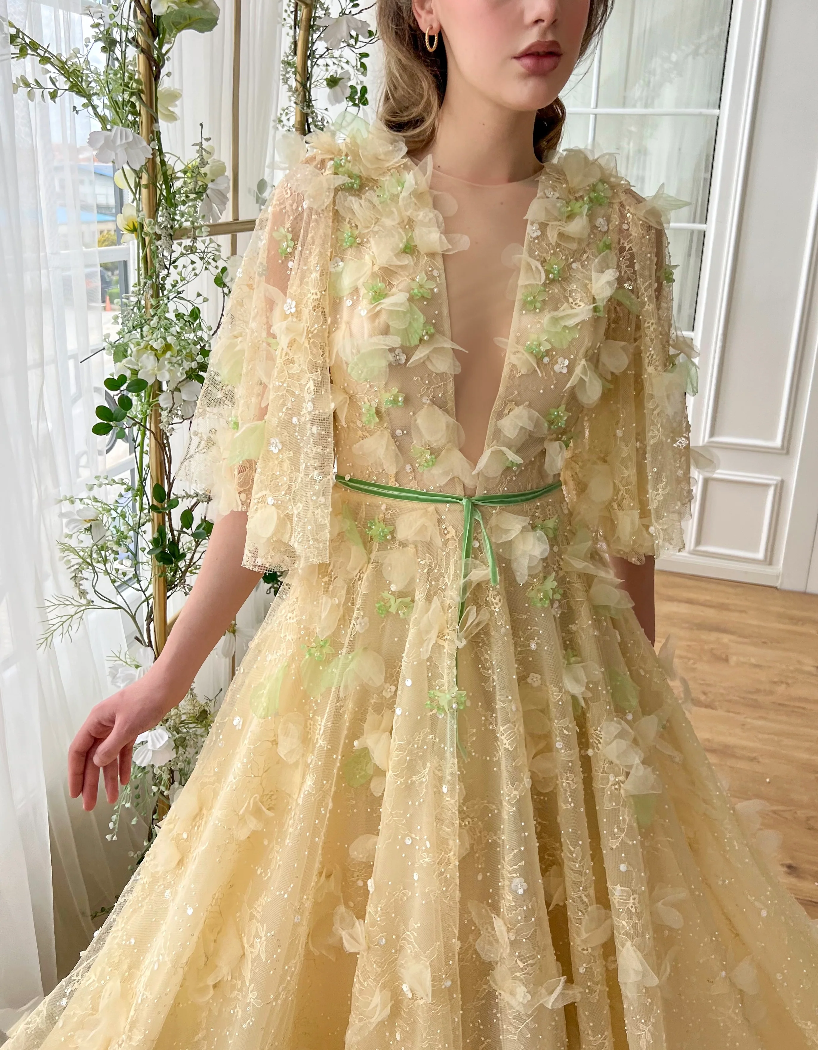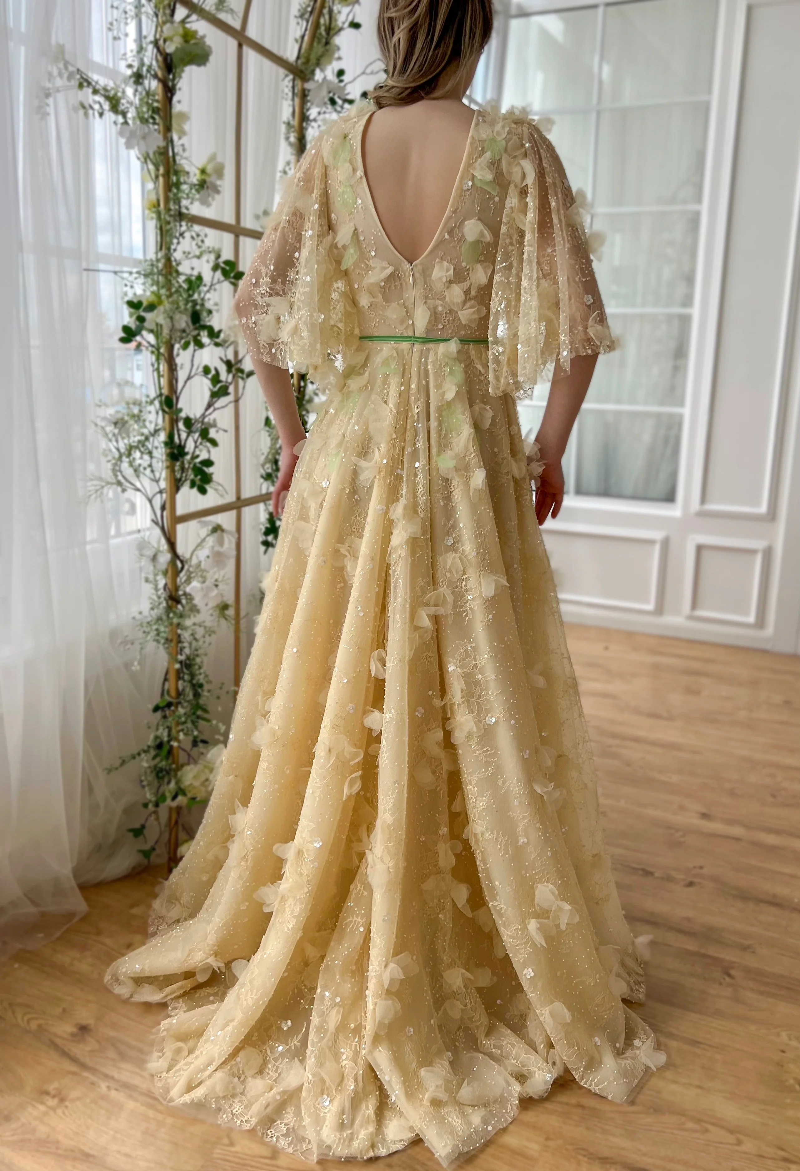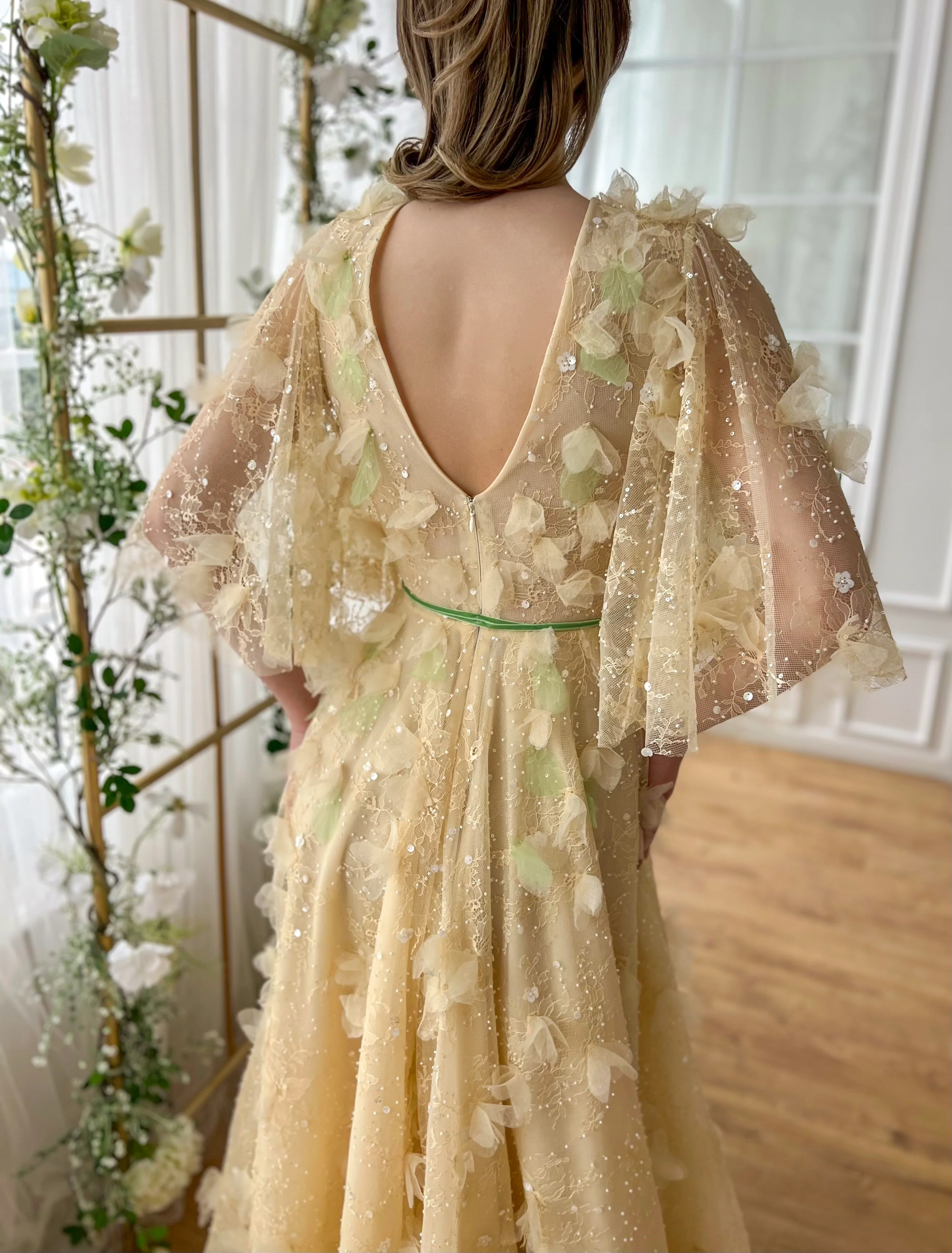 Discover the elegance of our Sage Mystique Gown, where classic charm meets modern sophistication. This dress features a delicate lace fabric in a rich champagne cream, adorned with vibrant green floral appliqués, sequins, and bead details that capture the light and enchant the eye. The illusion plunging V-neckline adds a touch of allure, while the cinched waist and voluminous ball gown silhouette create a stunning, regal profile. Flared short bell sleeves and a decorative green velvet bow belt enhance the garment’s graceful aesthetic. A unique V-shaped opening at the back and a convenient zipper closure ensure a seamless fit. Plus, the practical inseam pockets add a modern twist, marrying functionality with fashion in this breathtaking design. Perfect for any grand occasion, this gown promises to be the centerpiece of your wardrobe.