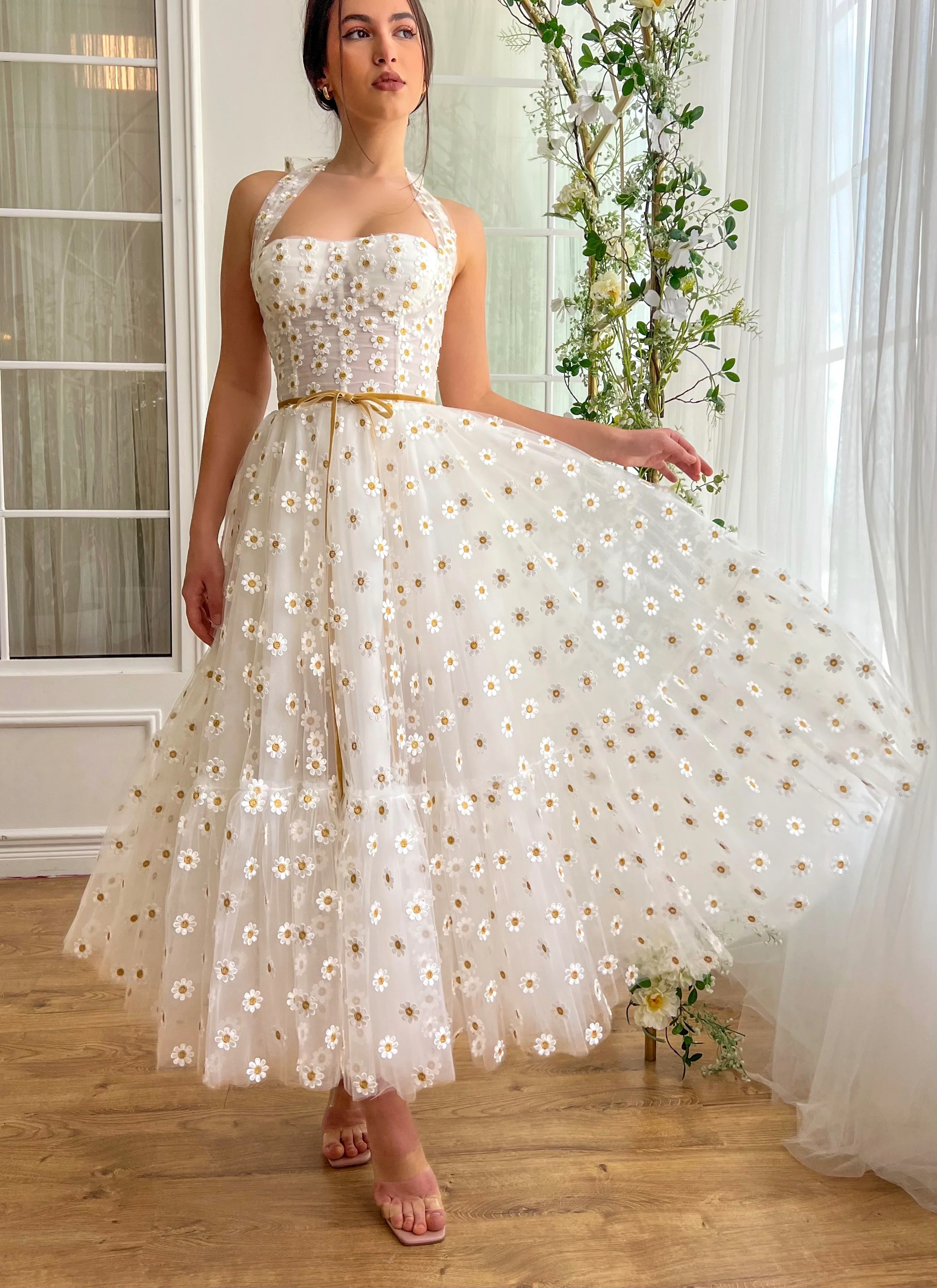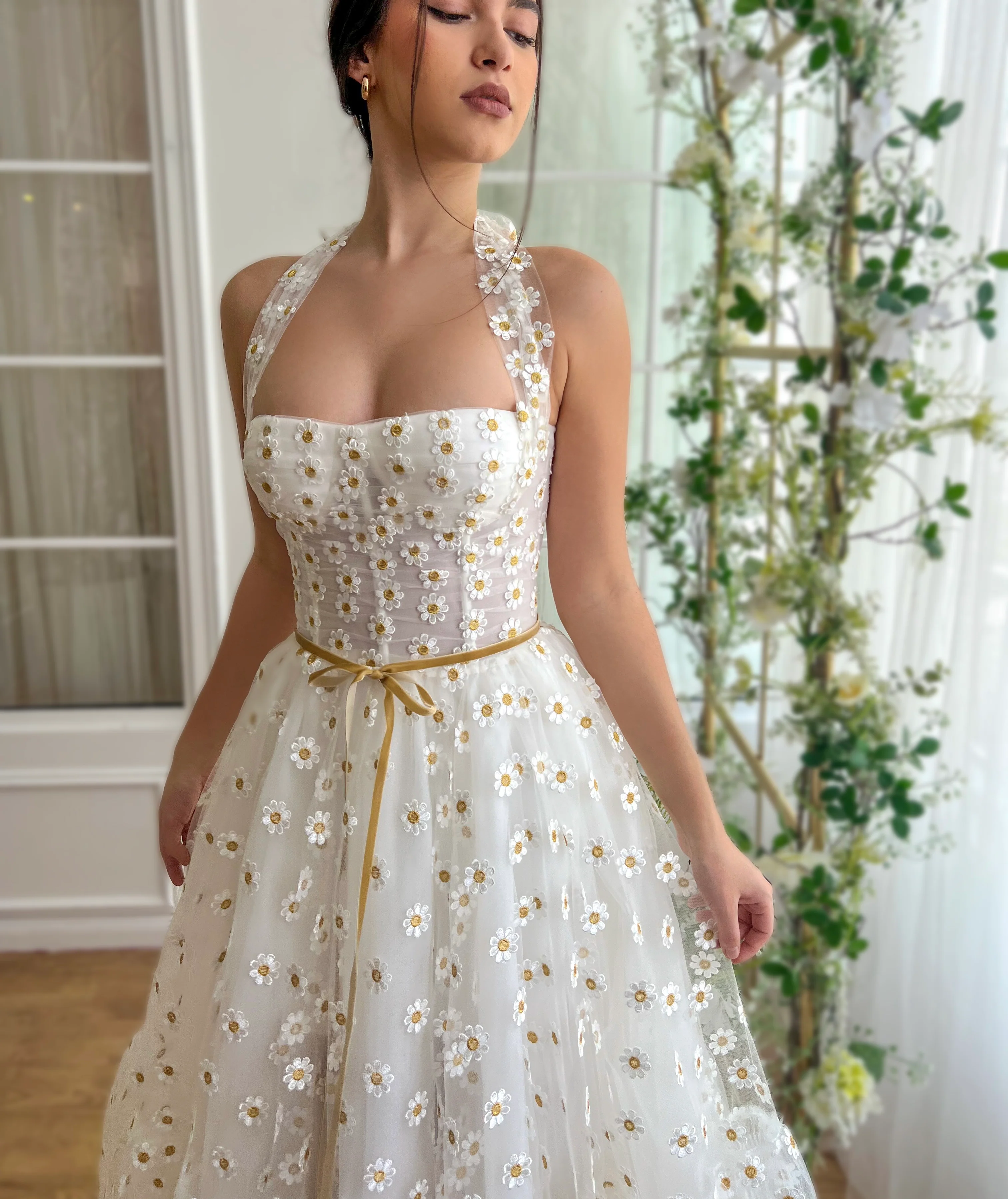 Step into timeless elegance with our midi-length dress, expertly tailored in ivory and embellished with delicate yellow and white embroidered daisies. This enchanting garment is designed with a supportive corset featuring built-in pads and boning, providing both structure and comfort. The dress showcases a charming halter neckline that ties with a bow at the nape, adding a sophisticated flair. It cinches at the waist with a honey velvet belt, accentuating its classic silhouette, while the gathered hem introduces a playful touch. Practical yet chic, the inseam pockets offer convenience, and the lace-up back closure ensures a perfect fit. Ideal for any occasion that calls for a splash of charm and elegance.