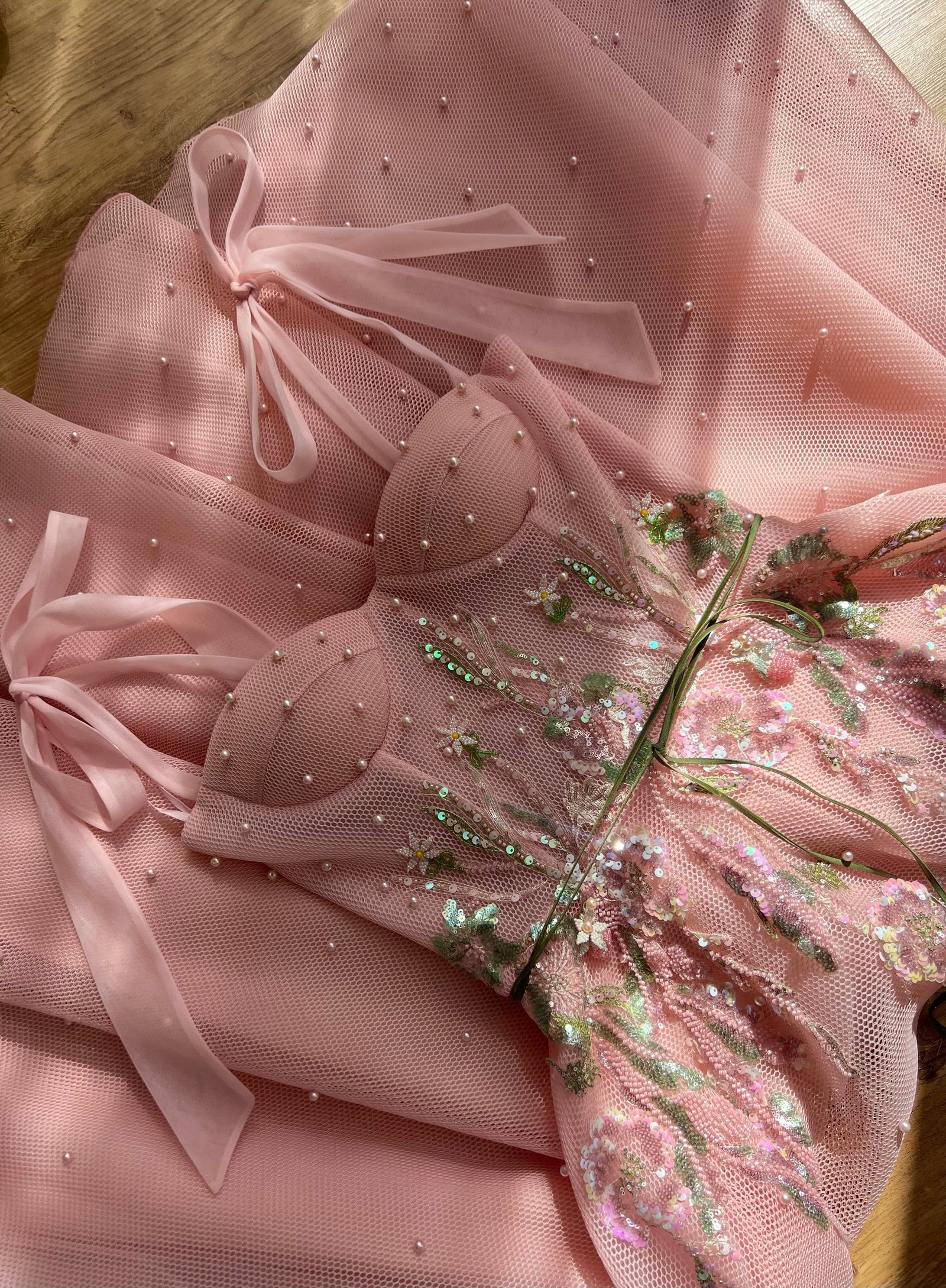 Dress to impress in this enchanting rose pink midi dress, tailored from luxurious mesh/net fabric punctuated with delicate pearls. Featuring a sweetheart neckline and a structured bodice with built-in pads and boning, this piece offers both support and sleek contouring. The cinched waist flows into a graceful skirt adorned with handmade 3D flowers in vivid greens and pinks, each embellished with crystal pink strawberries, adding a touch of whimsy. Inseam pockets lend a practical touch, while the decorative ribbon belt enhances its elegant silhouette. Ideal for proms, evening events, and any occasion where making a memorable entrance is a must.