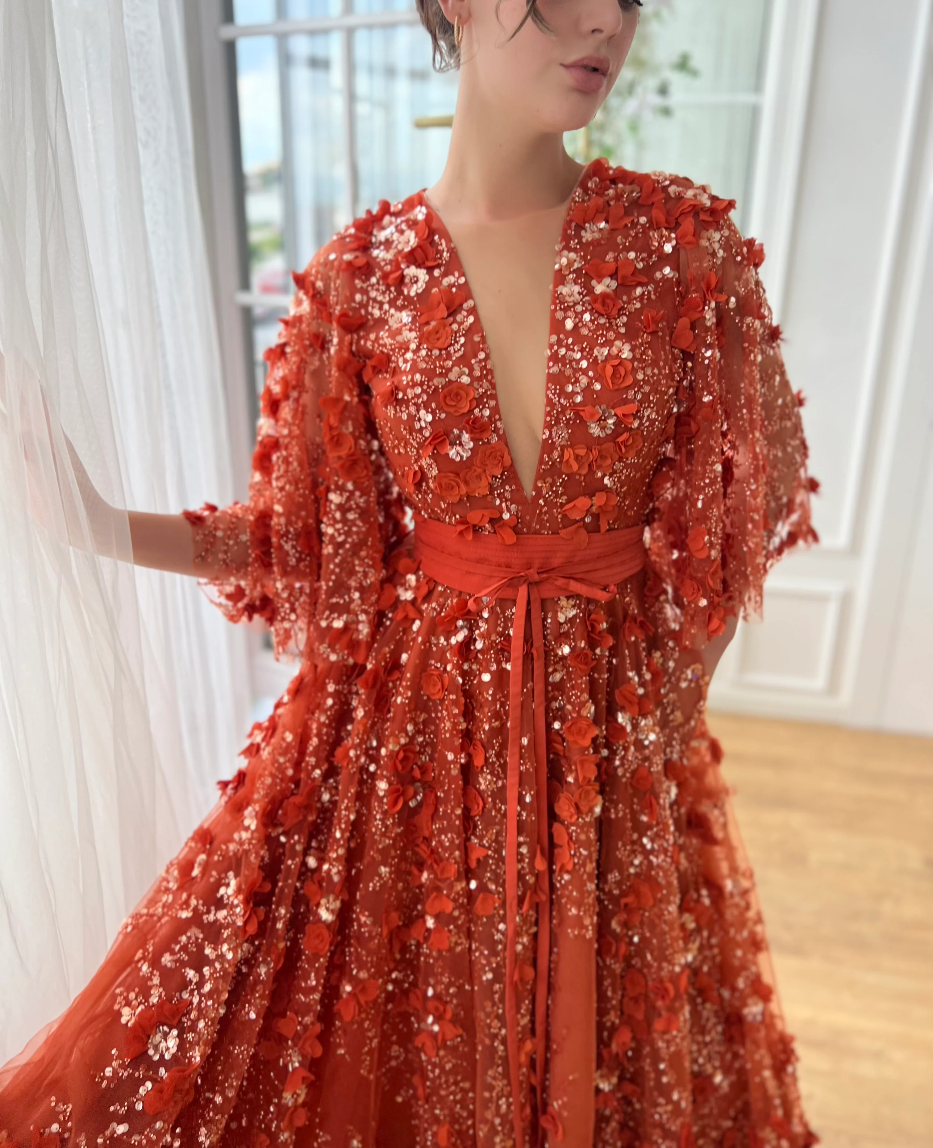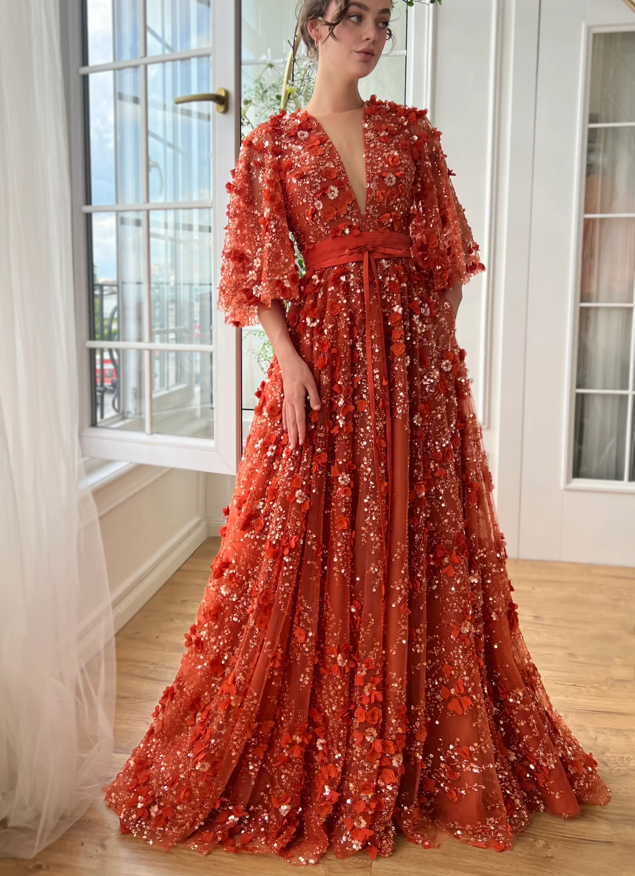 Radiate glamour in this stunning vibrant orange ball gown, designed to captivate and charm at any upscale gathering. This A-line dress features a daring illusion plunging V-neckline and is richly adorned with floral appliqués, sequins, and bead embellishments that catch the light with every movement. The waist is elegantly defined by a matching ribbon bow belt, enhancing the voluminous silhouette. Flared short bell sleeves add a touch of whimsy, while the layered tulle and smooth lining ensure a graceful flow. Finished with a convenient zipper back, this gown is an ideal choice for evening galas, weddings, and any red-carpet event.