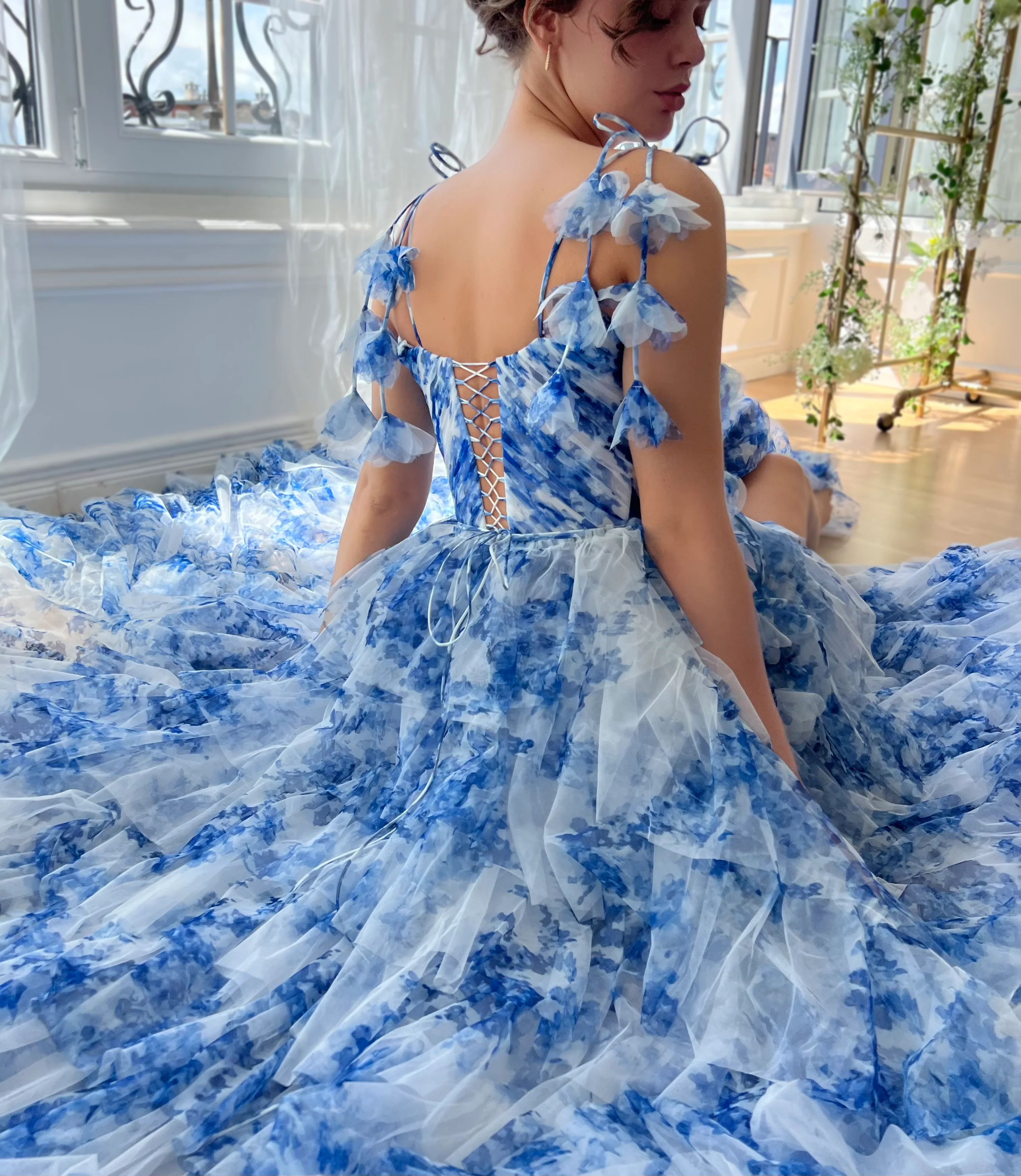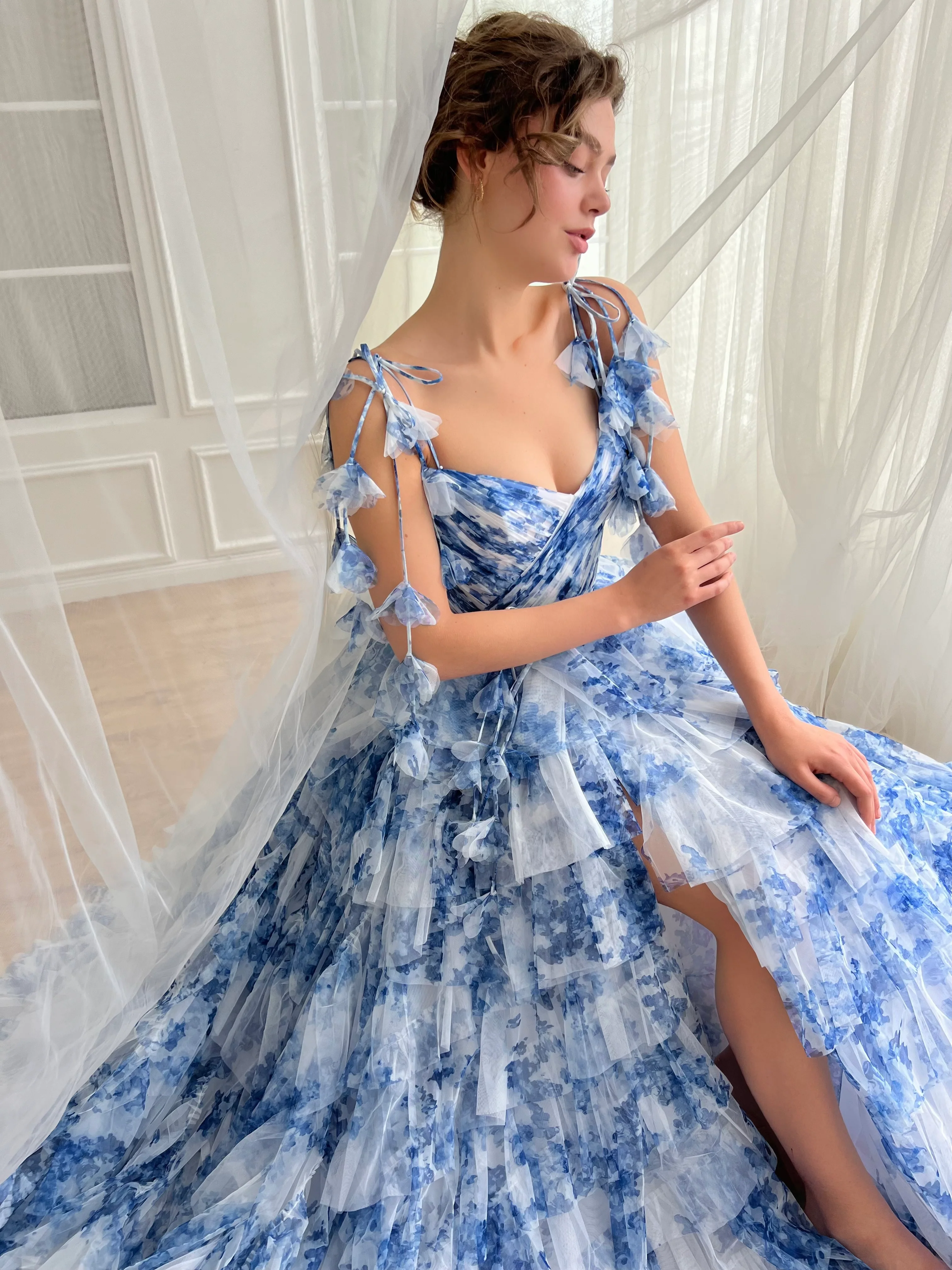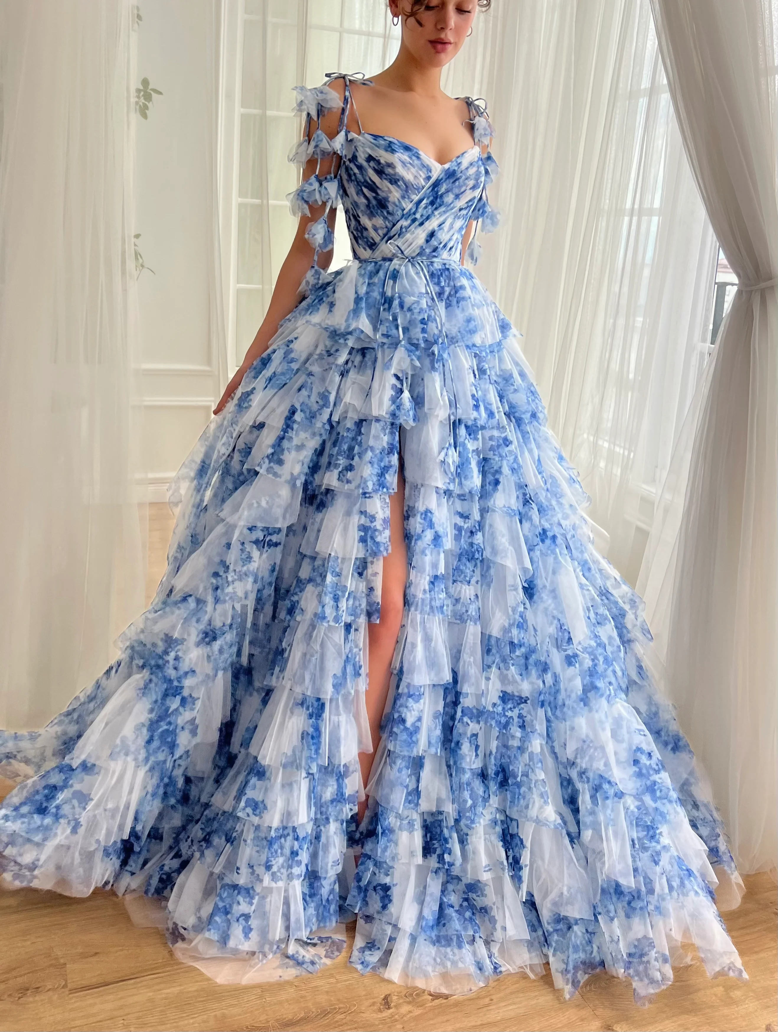 Discover the enchanting allure of our Indigo Sky Gown, meticulously crafted from premium tulle adorned with a delicate blue and white floral print. This dress features a beautifully fitted bodice enhanced by precise boning and elegant draping, designed to highlight the silhouette. The cinched waist leads into a breathtaking ball-gown style tiered skirt that gracefully sweeps the floor. A tasteful leg slit adds a touch of allure, while the lace-up back ensures a perfect fit. The gown is accentuated with a decorative ribbon belt, adding a refined touch. Customize your look with either medium off-shoulder sleeves or charming bow floral straps, tailoring the gown to your personal style. Perfect for galas, weddings, or any moment you want to feel truly special.