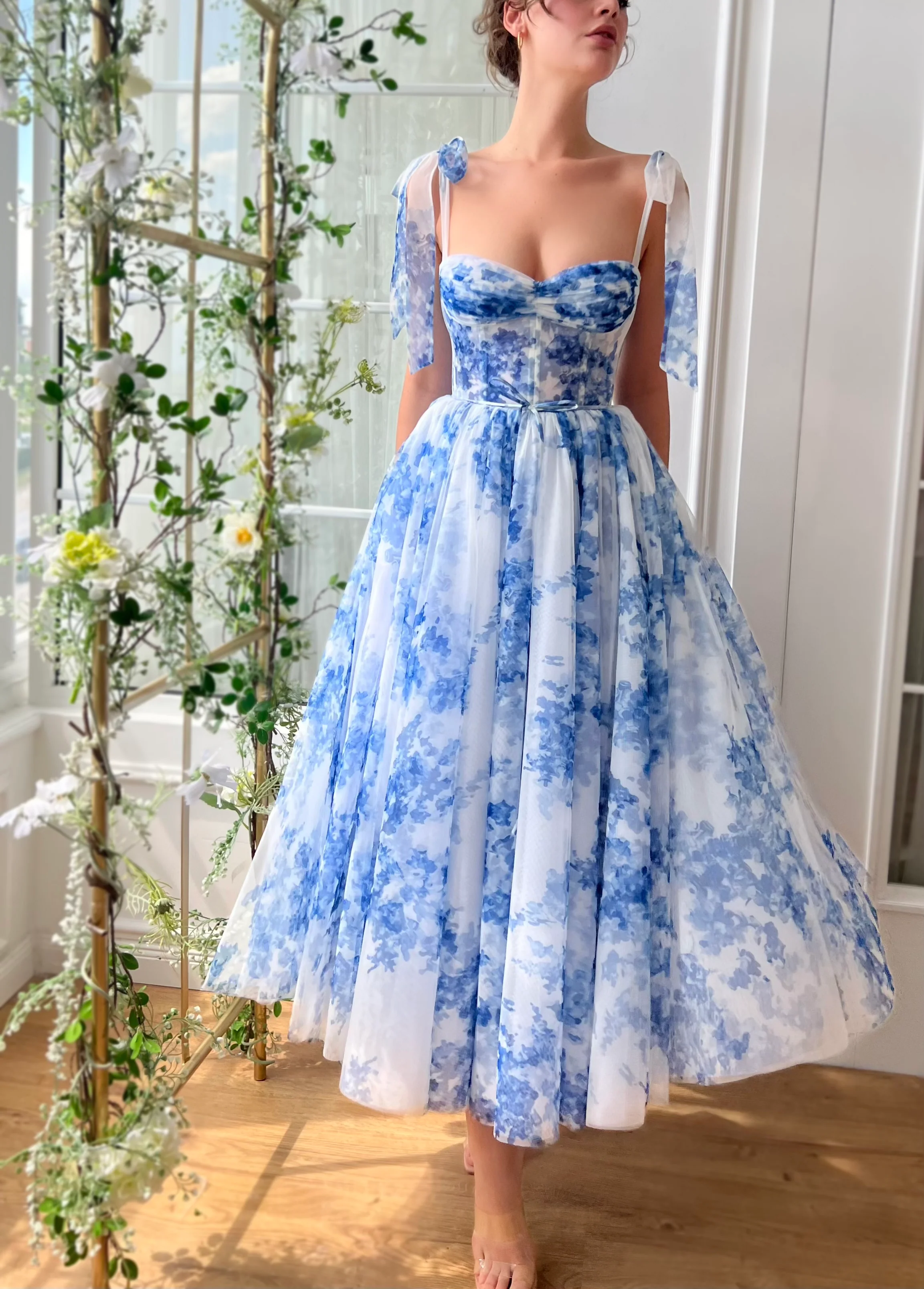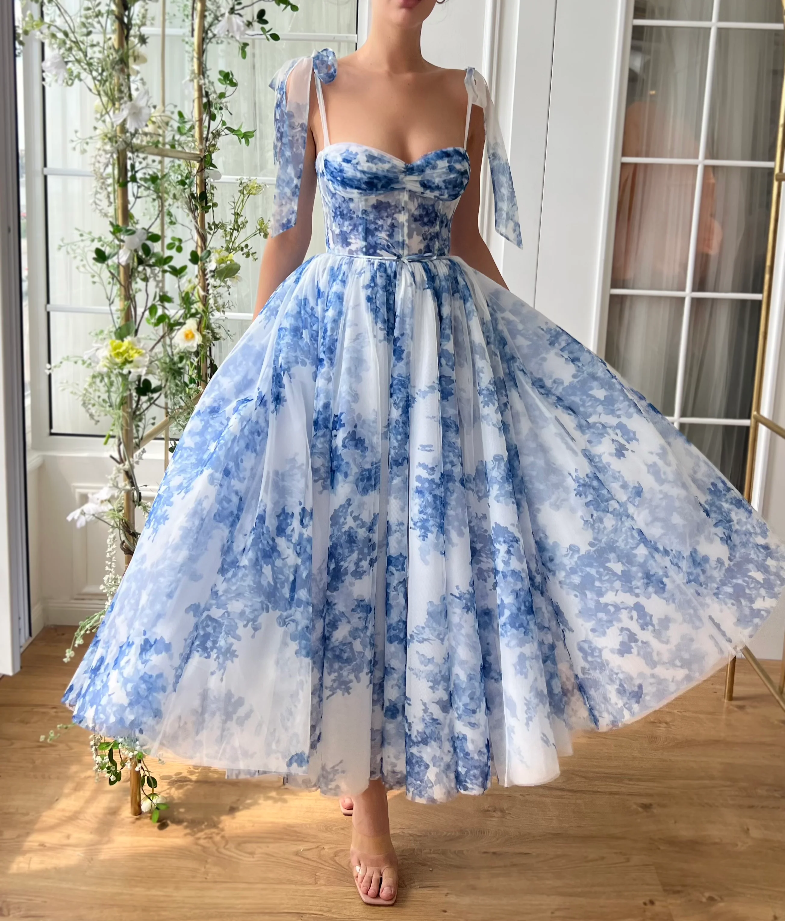 Step out in style with our blue and white tulle dress, exquisitely crafted to capture the essence of sophistication and freshness. The high-quality tulle is adorned with a lively blue and white pattern, making it perfect for various upscale events. The dress boasts a well-structured bodice with built-in pads and boning, designed to flatter your form. A draped bust and cinched waist enhance your silhouette, complemented by a lace-up back that adds a touch of allure. With inseam pockets for convenience and bow tie straps along with a decorative ribbon bow belt for added flair, this dress combines elegance with practicality, ensuring you look and feel fabulous.
