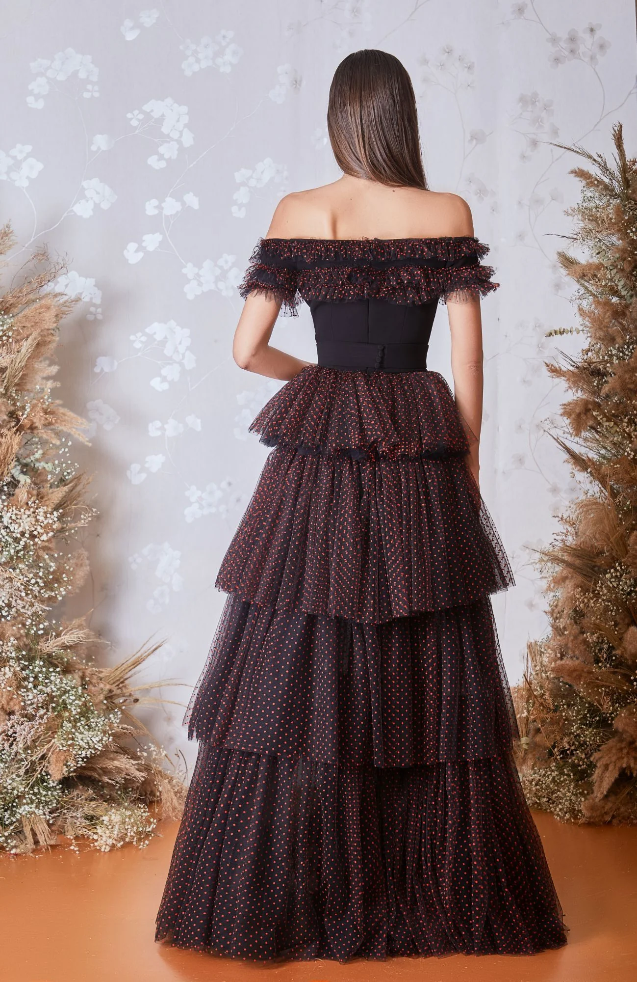 Off-shoulders and ruffled, fitted bodice with A-line tiered ruffled skirt.