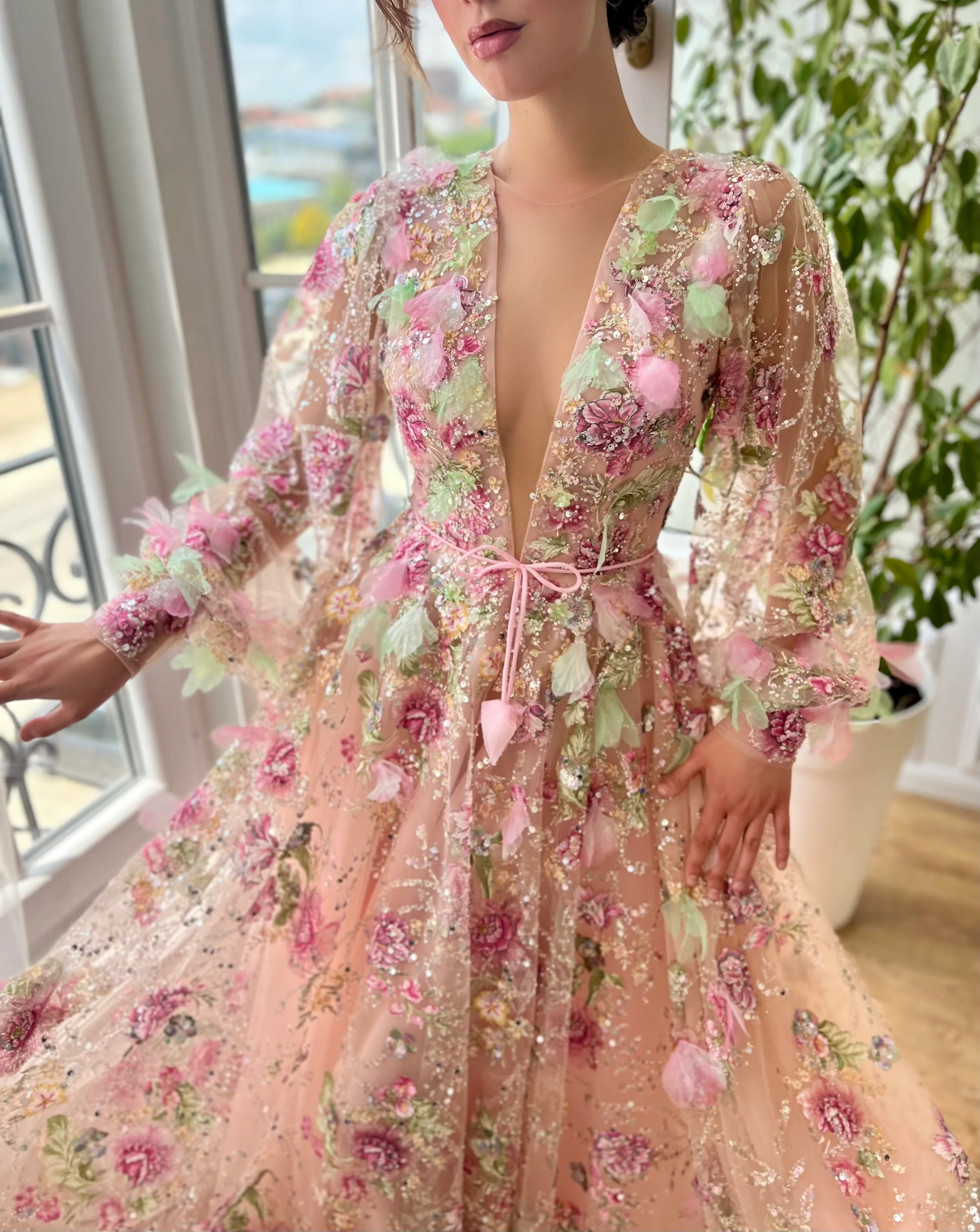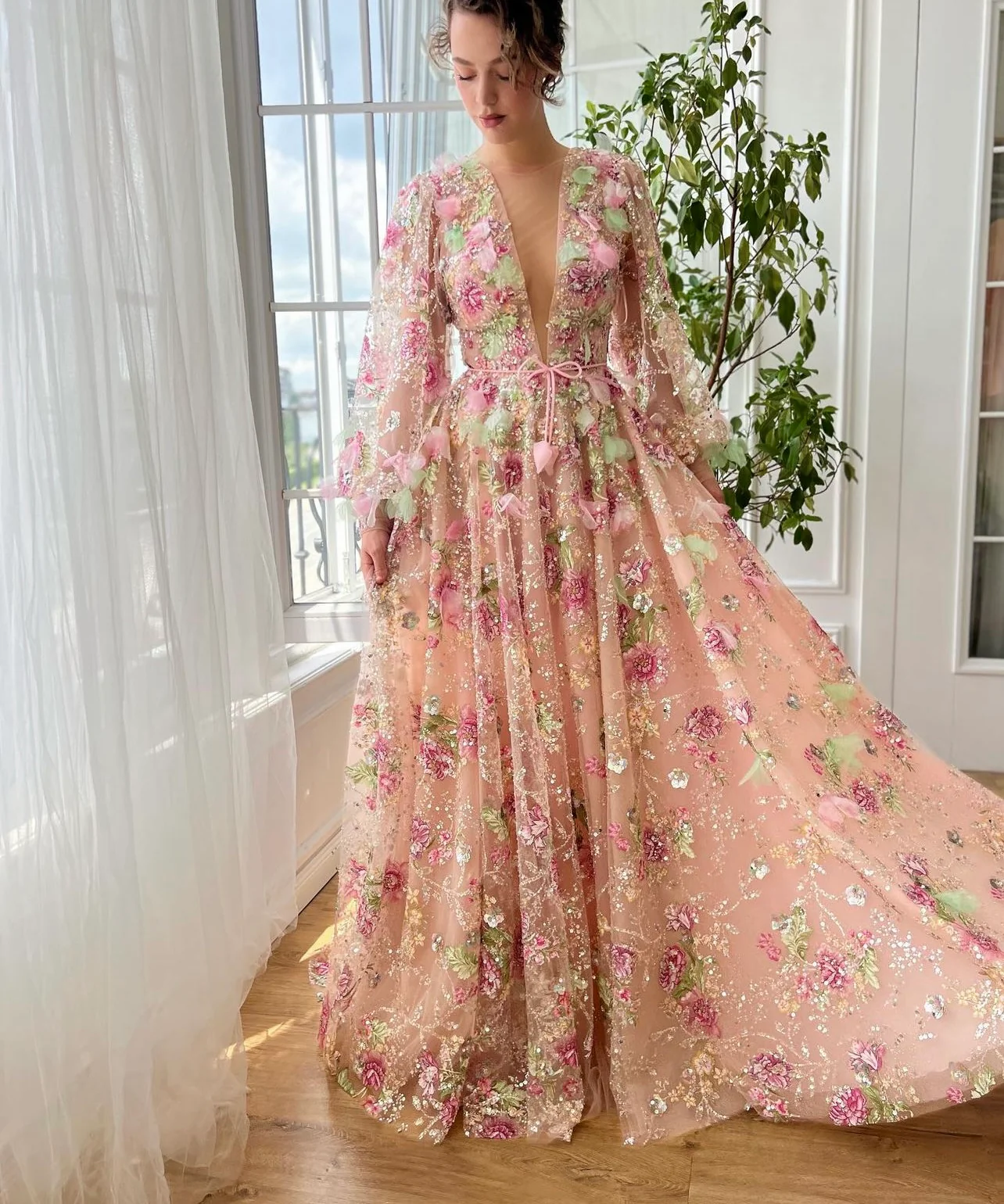 Introducing elegance and enchantment with our blush pink dress, adorned with an array of vibrant pink and green floral motifs. This exquisite piece features intricate floral embroidery, beautifully highlighted by delicate sequin accents, creating a truly captivating visual. The illusion plunging V-neckline and cinched waist enhance the figure, while the A-line silhouette gracefully flows to complement every movement. Long, puffy sleeves with elegant cuffs add a touch of classic sophistication, further accentuated by a decorative bow belt. Crafted with a chic V-shaped opening at the back and a convenient zipper closure, this dress also includes inseam pockets for a blend of style and functionality. Perfect for any special occasion, this dress promises to turn heads and capture hearts.