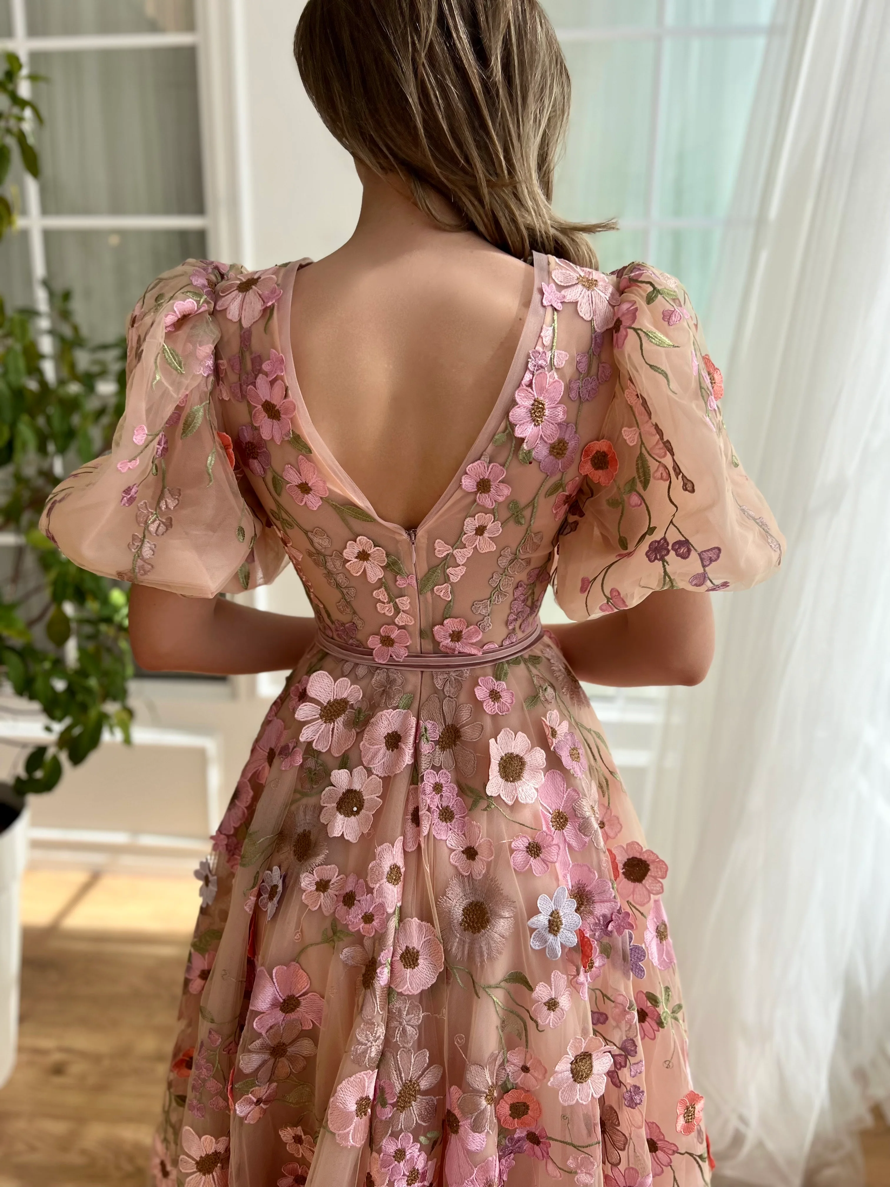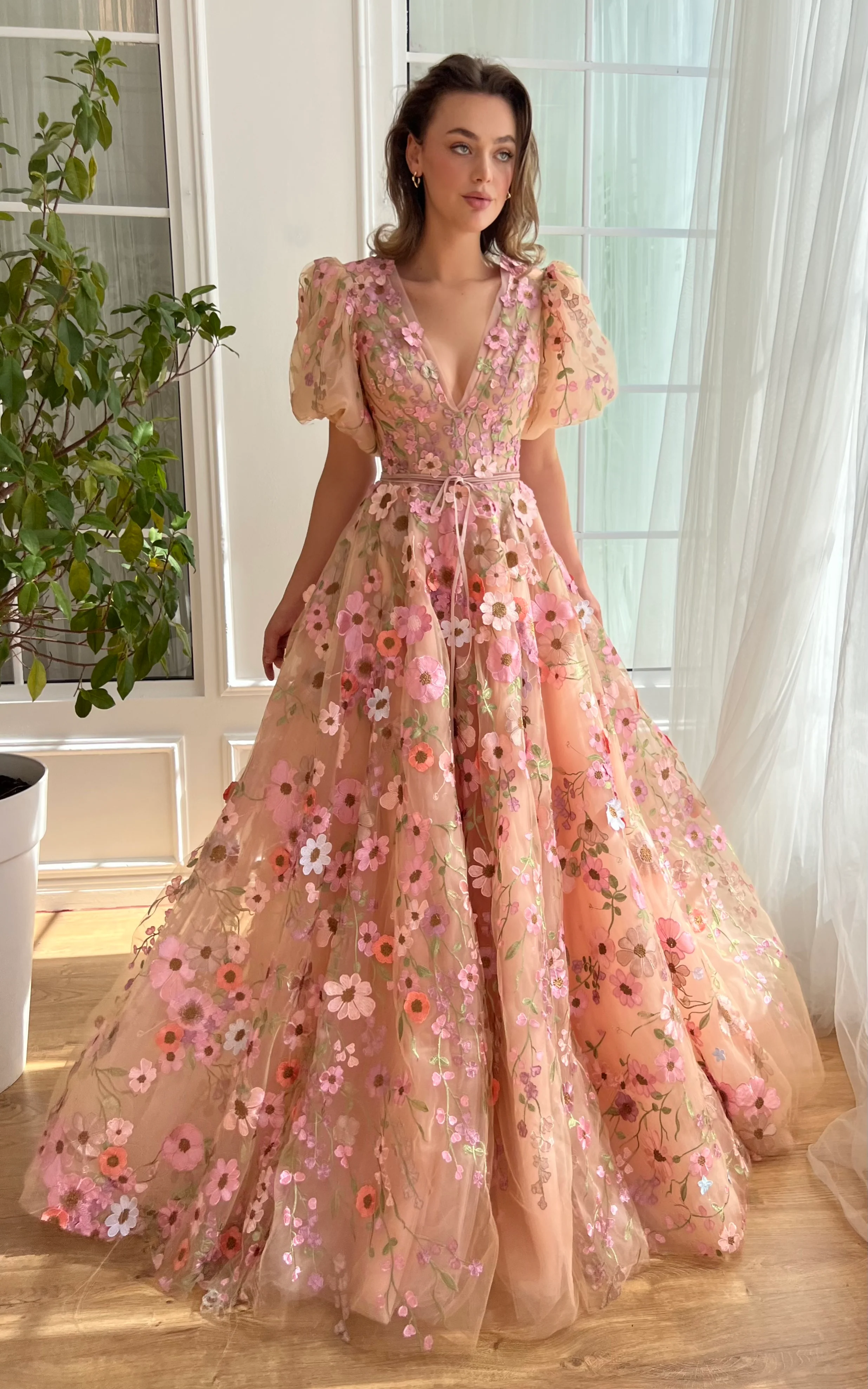 Discover timeless beauty with our exquisite creation. Crafted from blush pink tulle adorned with intricate blooming wildflower lace, this dress features a deep V-neckline that flatters and enhances your feminine allure. The cinched waist and decorative double bow belt create a graceful silhouette, while medium puffy sleeves add a touch of romance. The A-line design flows into a floor-length skirt with a court train, complete with inseam pockets for practicality. Perfect for weddings, garden parties, or any special occasion, this dress captures the essence of charm and sophistication.