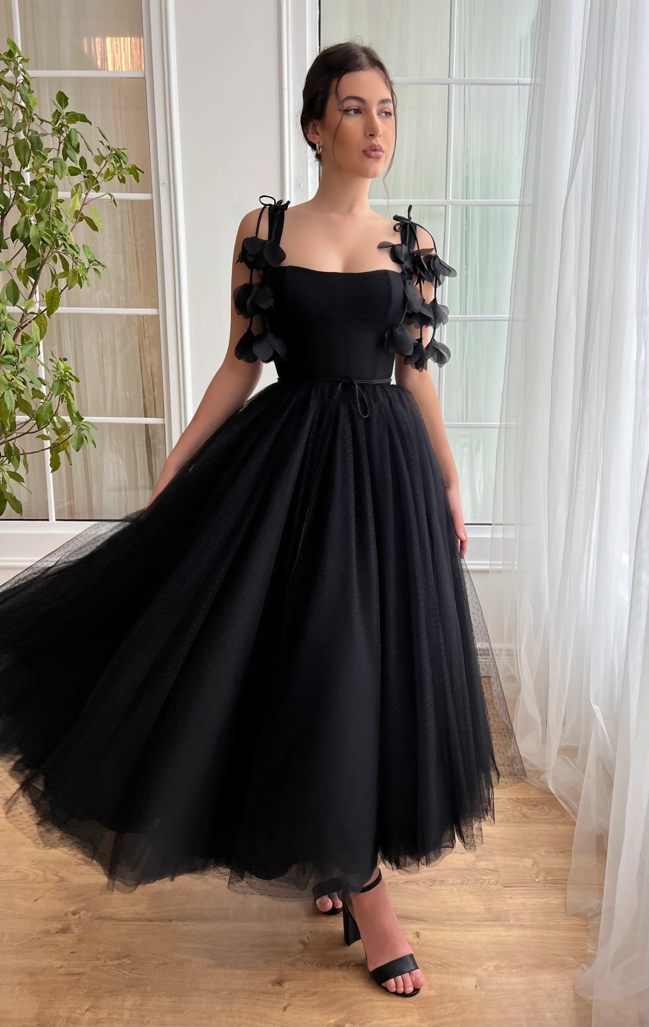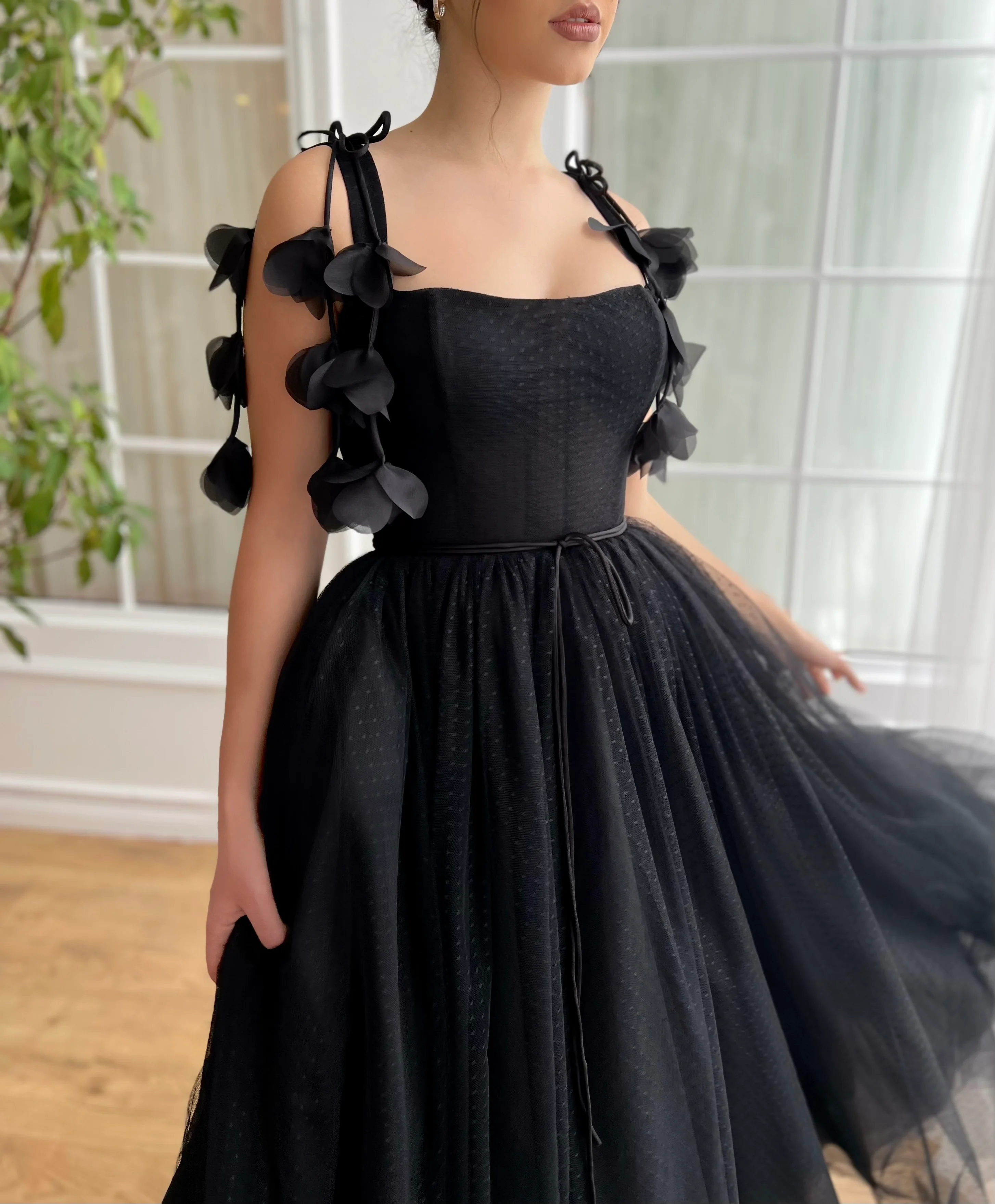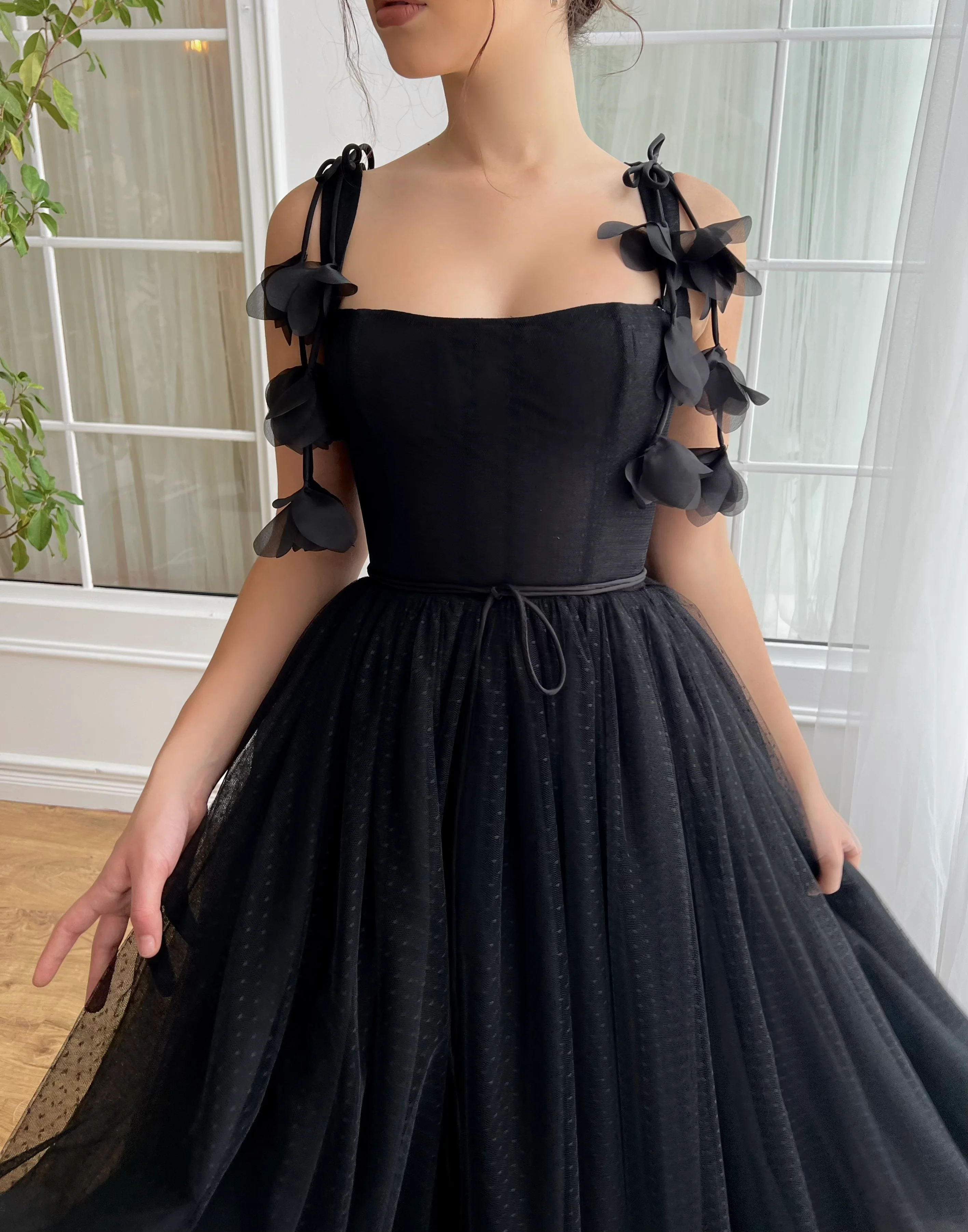 Discover the epitome of timeless elegance with this stunning black tulle midi dress, perfect for weddings, garden parties, and any formal occasion. Crafted from high-quality tulle fabric adorned with delicate tiny dot detailing, this dress boasts a beautifully fitted bodice with structured boning that contours and flatters your figure. The floral appliqué straps add a touch of romance, while the decorative ribbon bow belt cinches the waist, enhancing its graceful silhouette. With its practical inseam pockets and flowing midi-length style, this dress combines functionality with sophistication, ensuring you look effortlessly chic and feel comfortable throughout your special event.