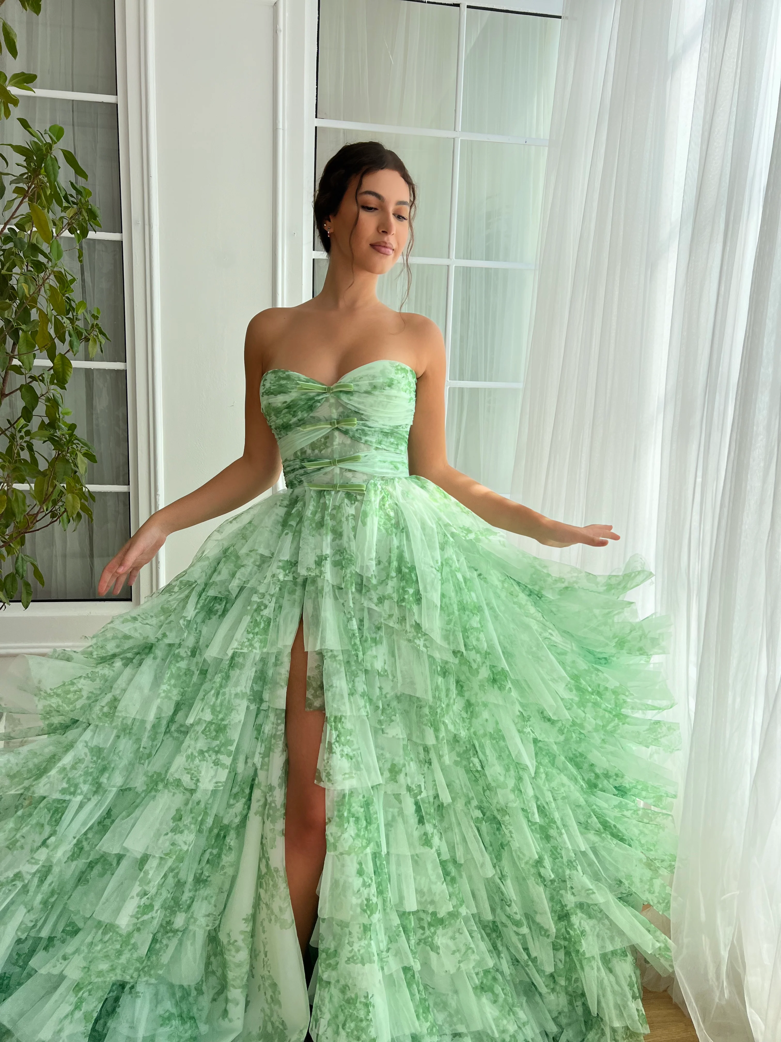 This vibrant mint green gown is crafted for those unforgettable moments. The sheer tulle fabric, detailed with floral appliqué, pairs beautifully with the strapless sweetheart neckline and gathered bodice, creating a flattering silhouette. The tiered ruffle skirt flows gracefully, revealing a high leg slit that adds a hint of allure. With a cinched waistline and laced-up back closure, this A-line gown is ideal for evening galas, formal events, and outdoor weddings, offering a perfect blend of sophistication and charm.