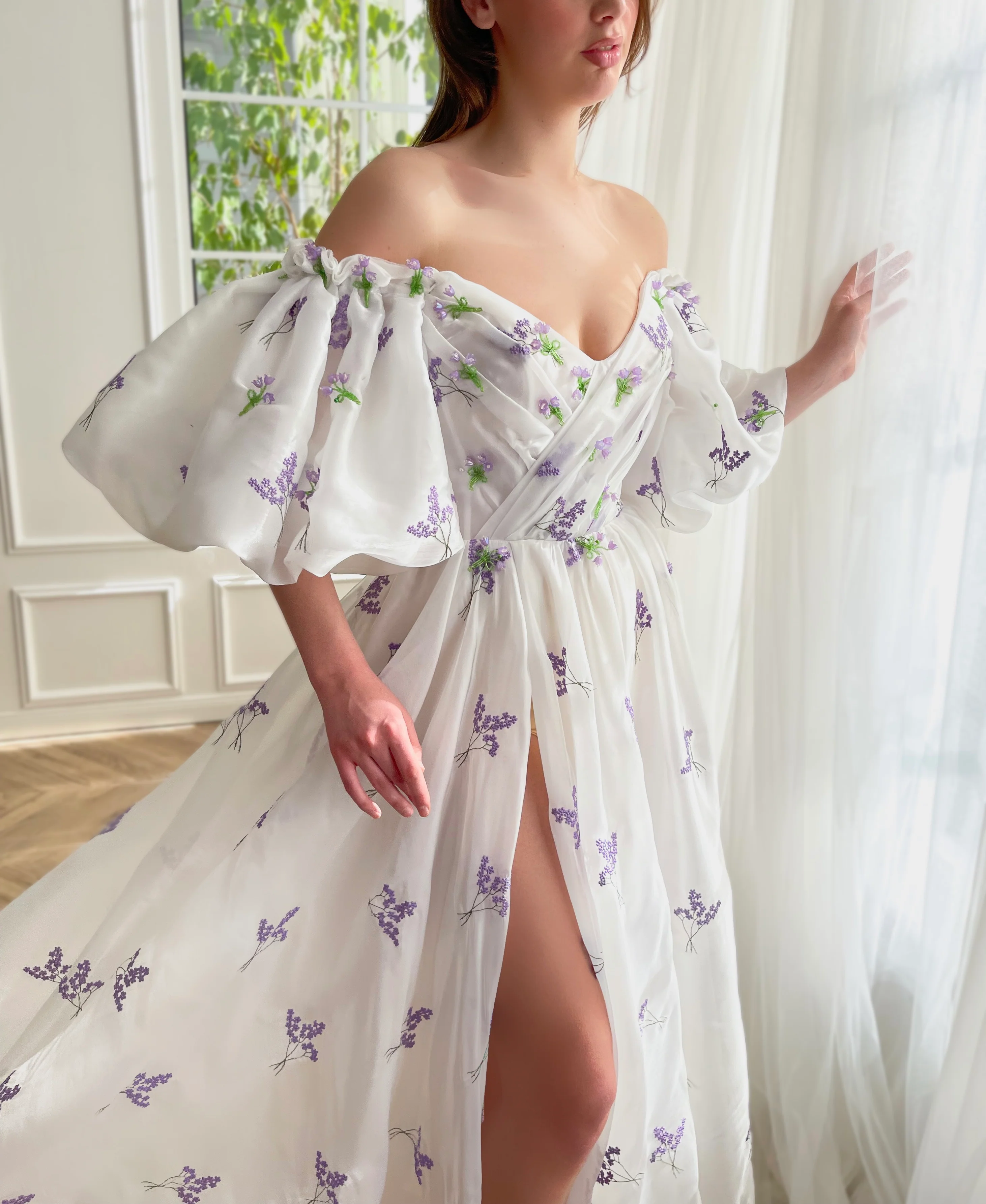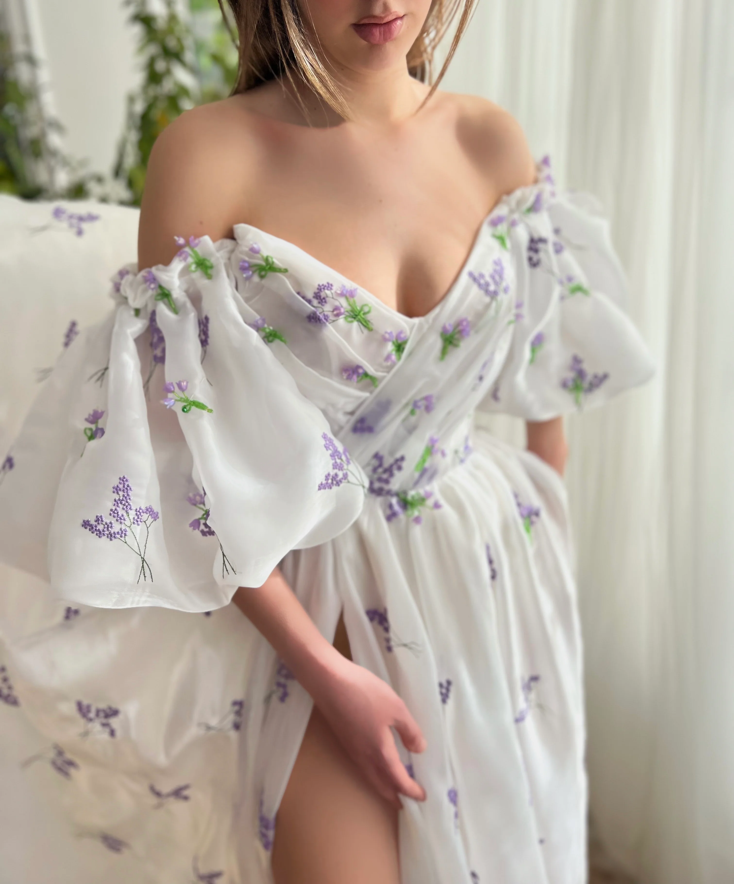 Discover the epitome of elegance with our Timeless Ivory Organza Gown, masterfully crafted with intricate embroidered crystal lavender flowers that cascade down the sumptuous fabric. The off-shoulder neckline gracefully reveals your décolletage, while the draped bodice and boning provide structured support to create an alluring silhouette. A cinched waist accentuates your curves, effortlessly transitioning to a skirt that boasts the modern convenience of inseam pockets. A daring leg slit adds a touch of sensuality and movement to this enchanting design. Medium puffy sleeves bring a romantic air to the overall aesthetic, and the gown's undeniable allure is finalized by an exquisite sweep train that elegantly trails behind you, capturing the essence of true sophistication. Embrace the captivating charm of this lavish creation, designed to make you feel like a timeless beauty on your special day.