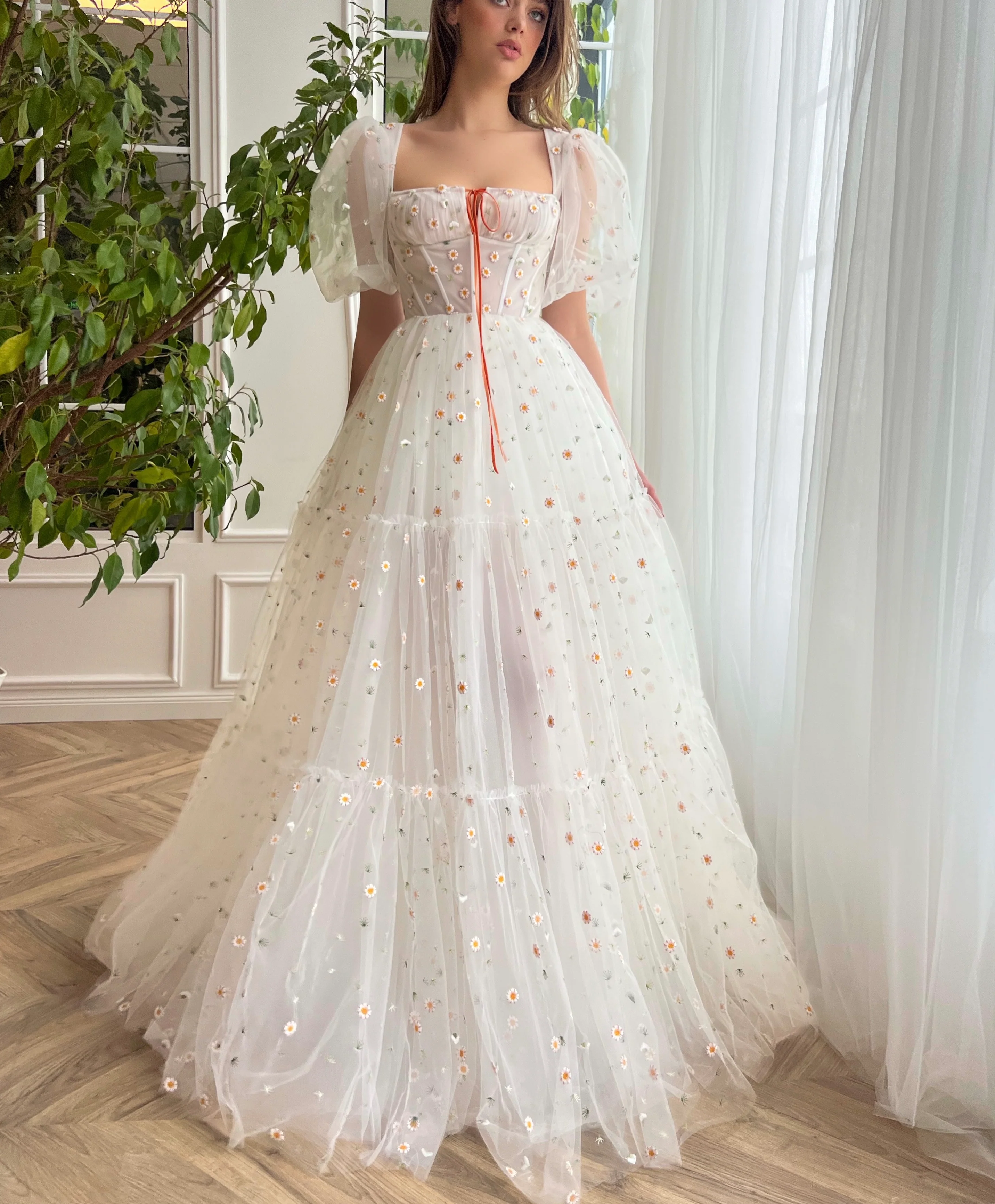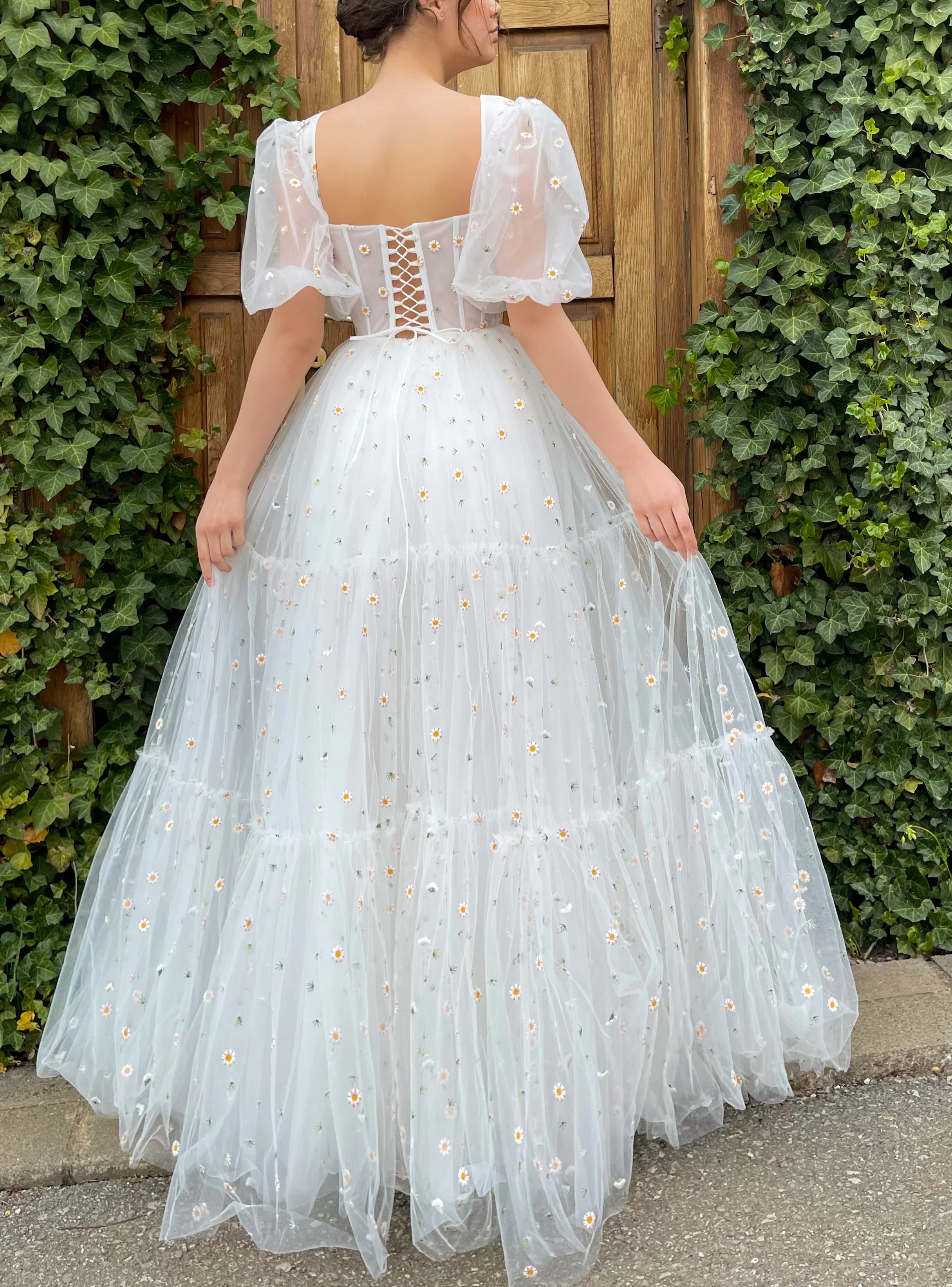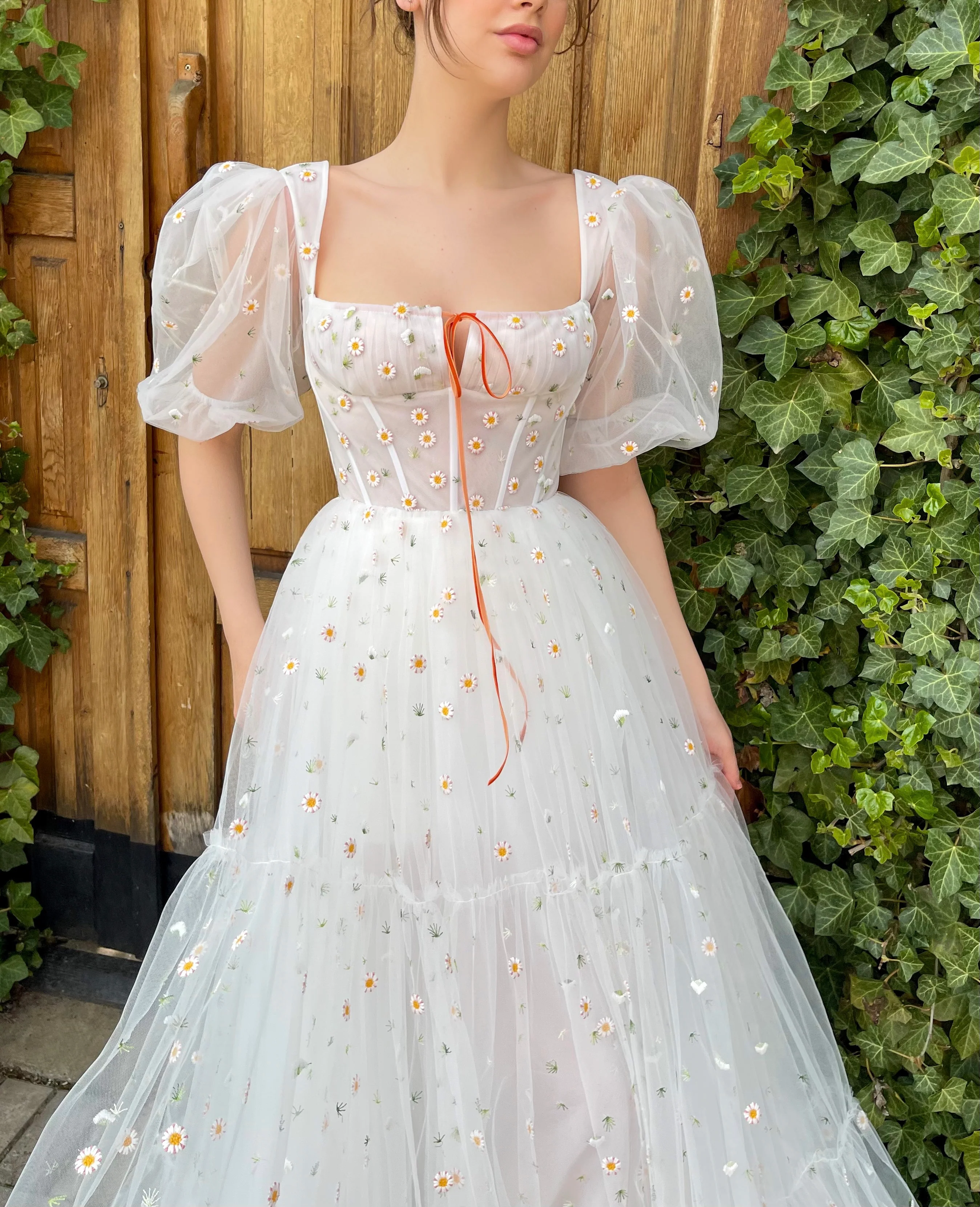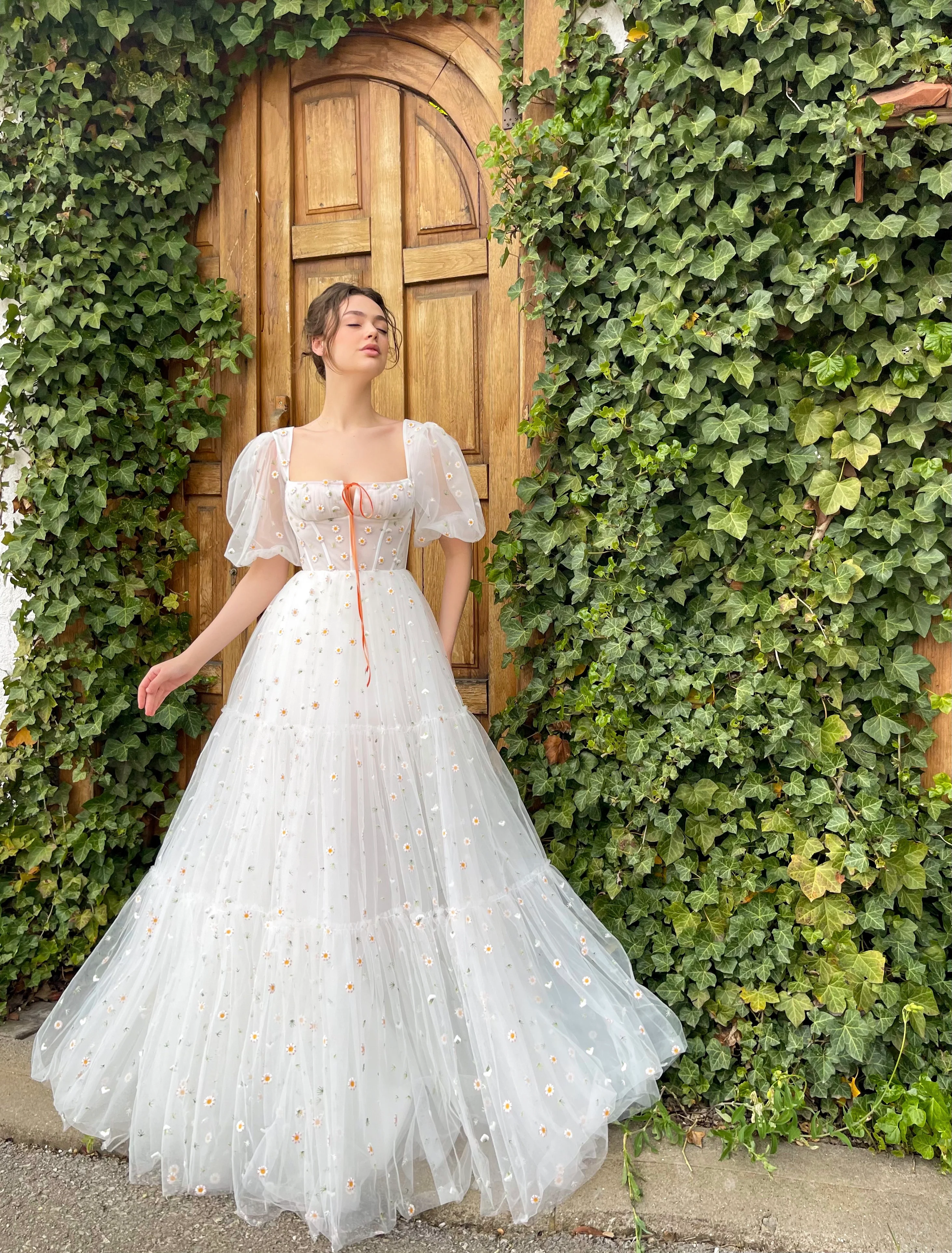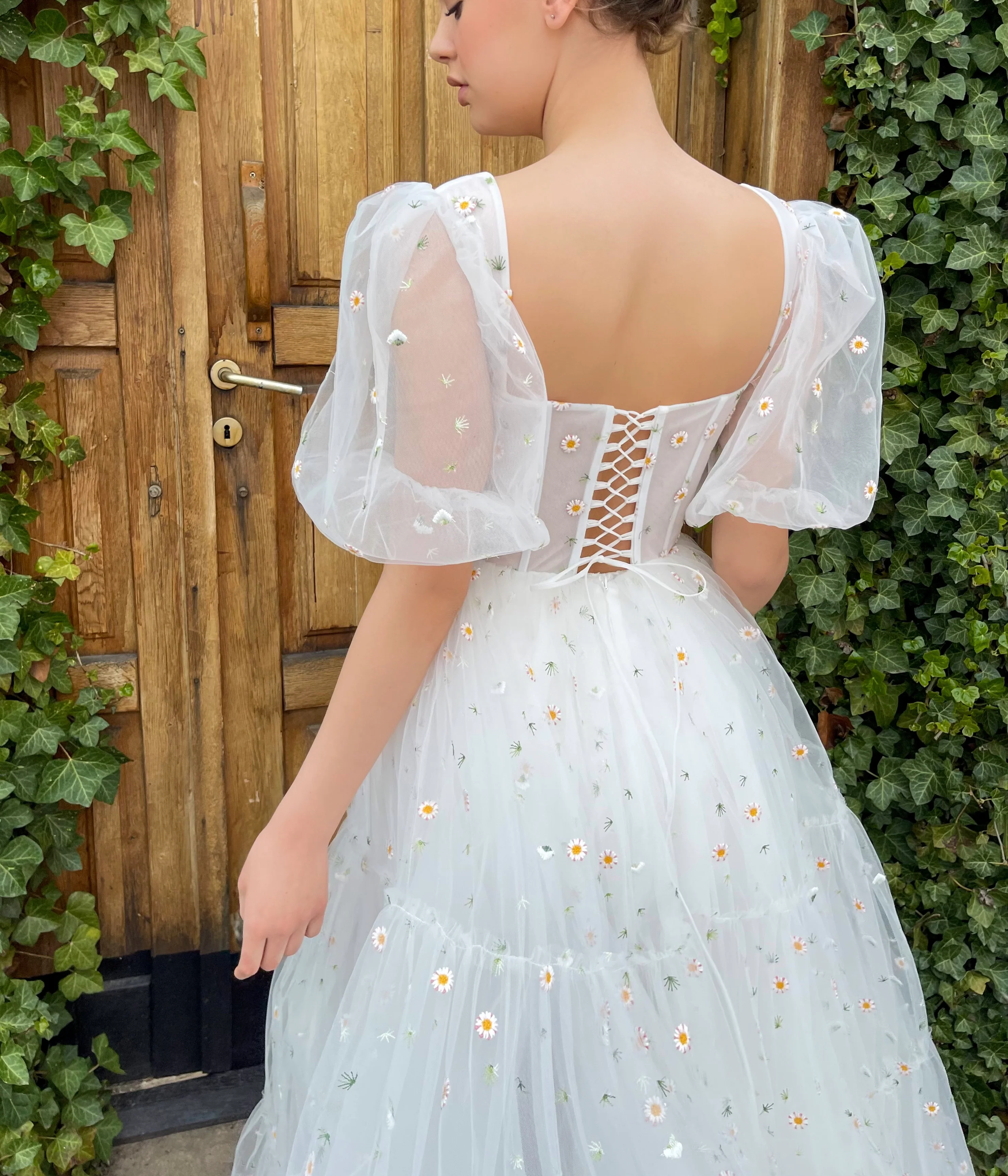 This dress is a delicate masterpiece, finely crafted from soft, white tulle that has been meticulously adorned with exquisitely embroidered daisies. Its design draws attention to the elegantly defined square neckline that seamlessly transitions into a cinched waist, accentuating the feminine silhouette. Adding an enchanting touch of nostalgia are the wide, medium-length sleeves, puffed to perfection, which hint at timeless elegance and charm. The cinched waist leads your gaze to a beautifully tiered gathered skirt, a playful yet sophisticated feature designed to cascade with grace and movement. The unique lace-up back detail ensures the perfect fit while adding an unexpected edge, juxtaposing traditional charm with contemporary elegance. The final flourish is the decorative bust-ribbon bow, a whimsical embellishment that provides the perfect finishing touch to this enchanting dress.