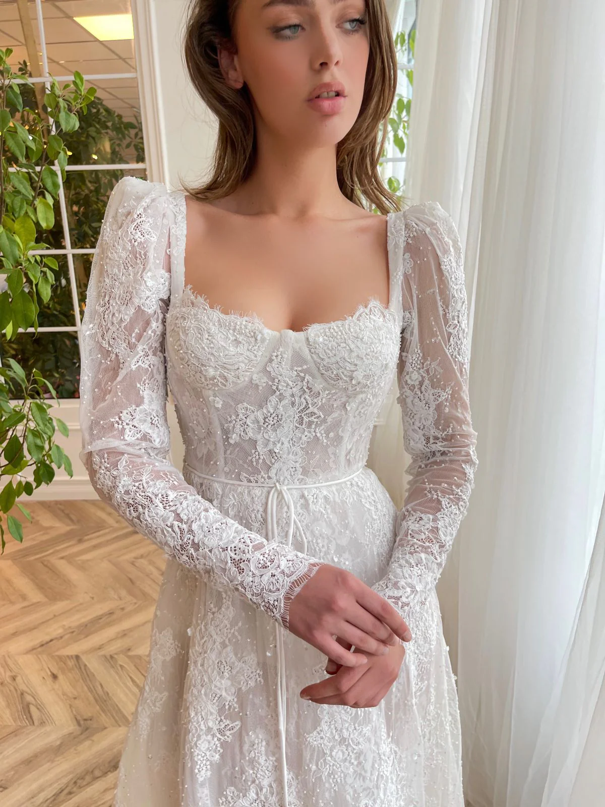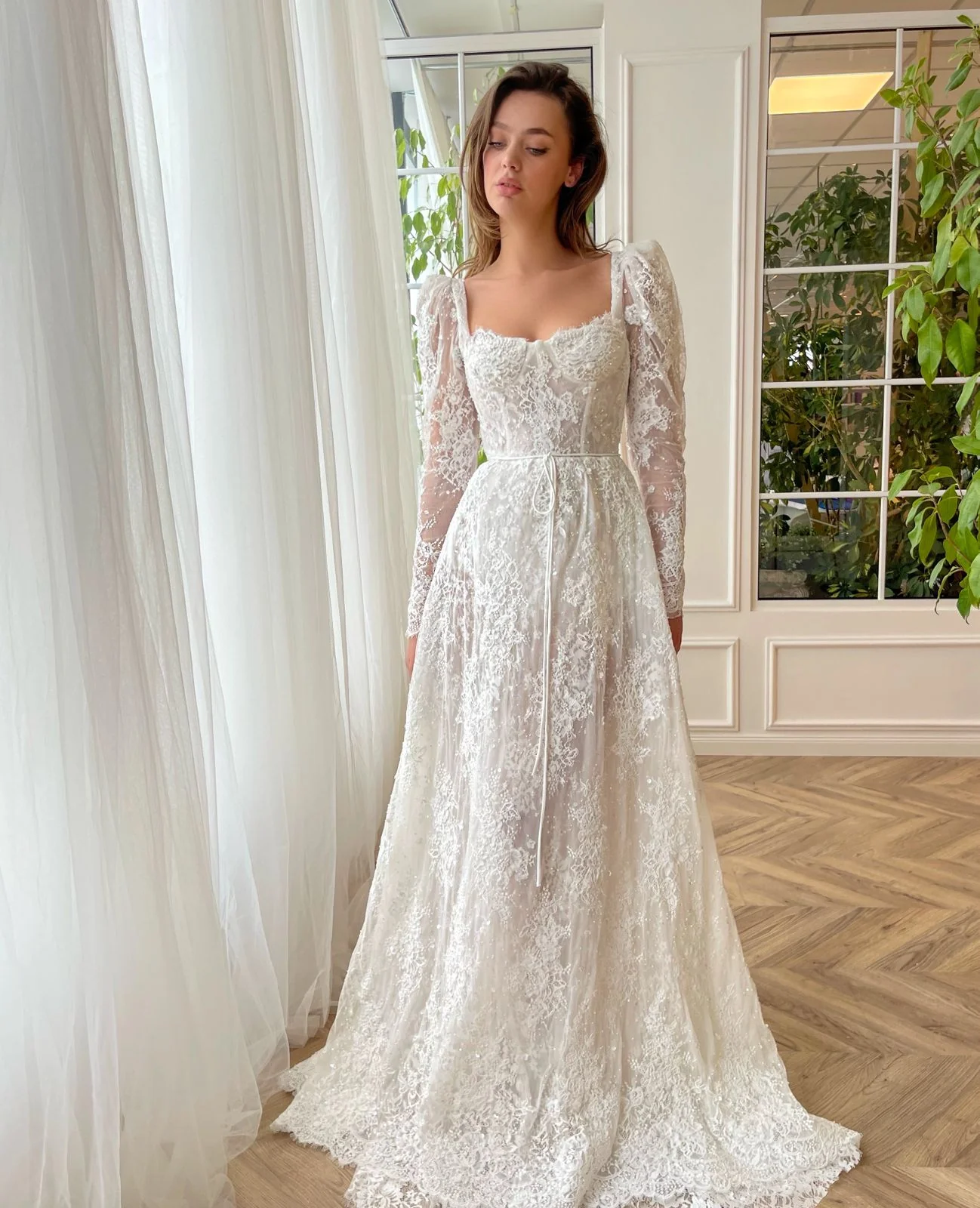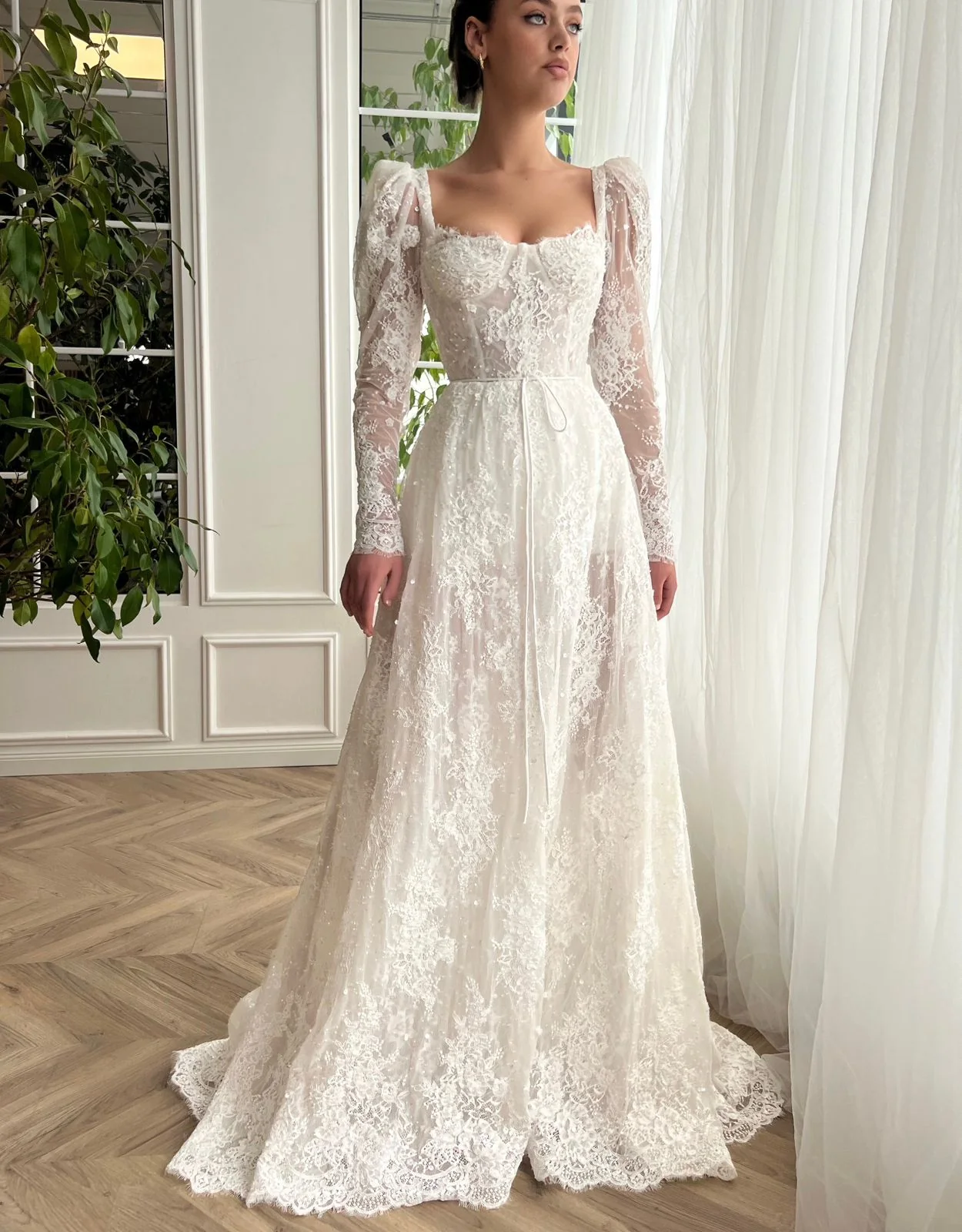This breathtaking dress is an expression of sublime elegance, crafted from ethereal white embroidered floral lace that exudes an air of timeless grace. The bodice, intelligently designed with boning and built-in pads, offers the perfect balance of comfort and support, while also enhancing the natural lines of the body. A romantic sweetheart neckline introduces a hint of softness and charm, leading effortlessly into a cinched waist that gracefully accentuates the feminine silhouette. The design flows into a floor-sweeping skirt, a grand statement that creates a sense of dynamic movement and romantic drama. Classic leg-of-mutton sleeves lend a touch of vintage elegance, artfully juxtaposed against a contemporary lace-up back that ensures the perfect fit while adding an unexpected twist. A decorative bow belt is the finishing touch, a whimsical detail that elevates the dress's aesthetic appeal. This dress is more than a piece of clothing; it's designed to make you feel elegant and gorgeous on your special day, a perfect companion for creating unforgettable memories.
