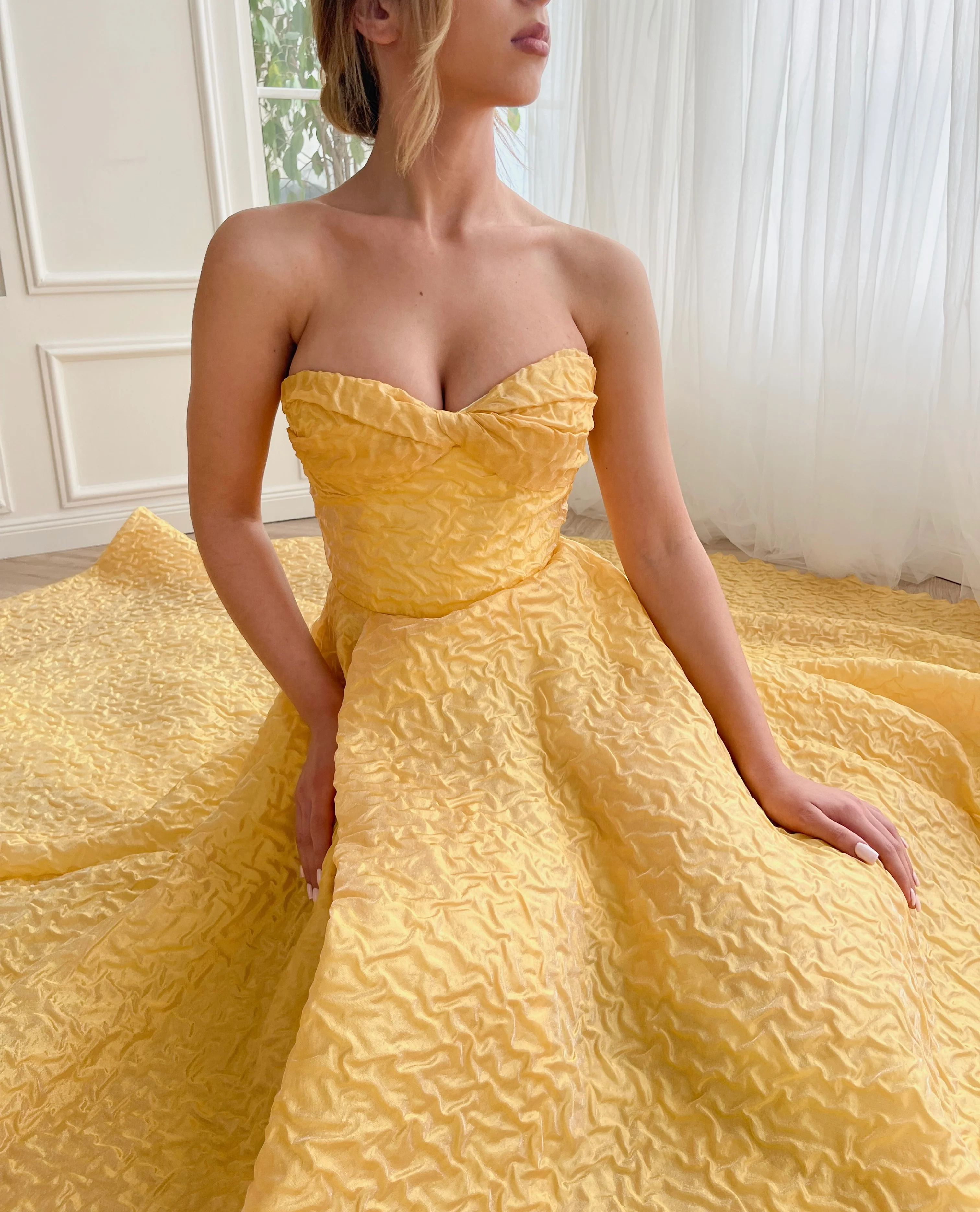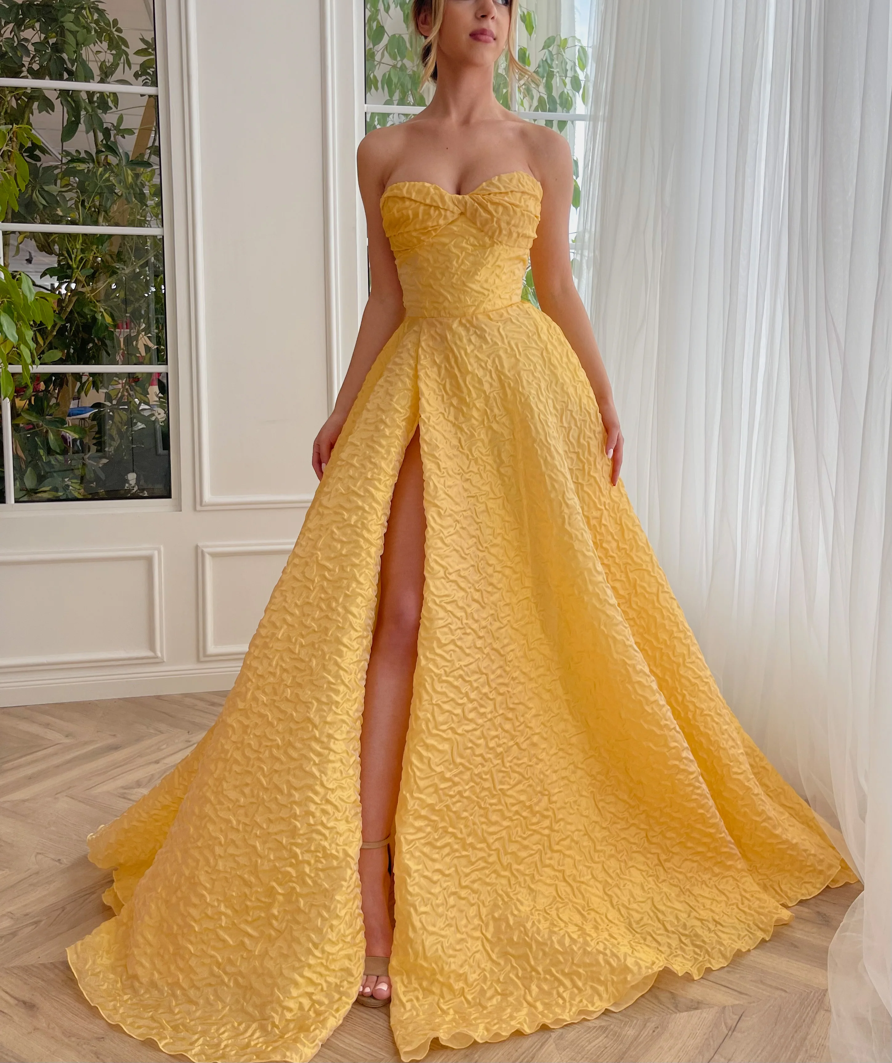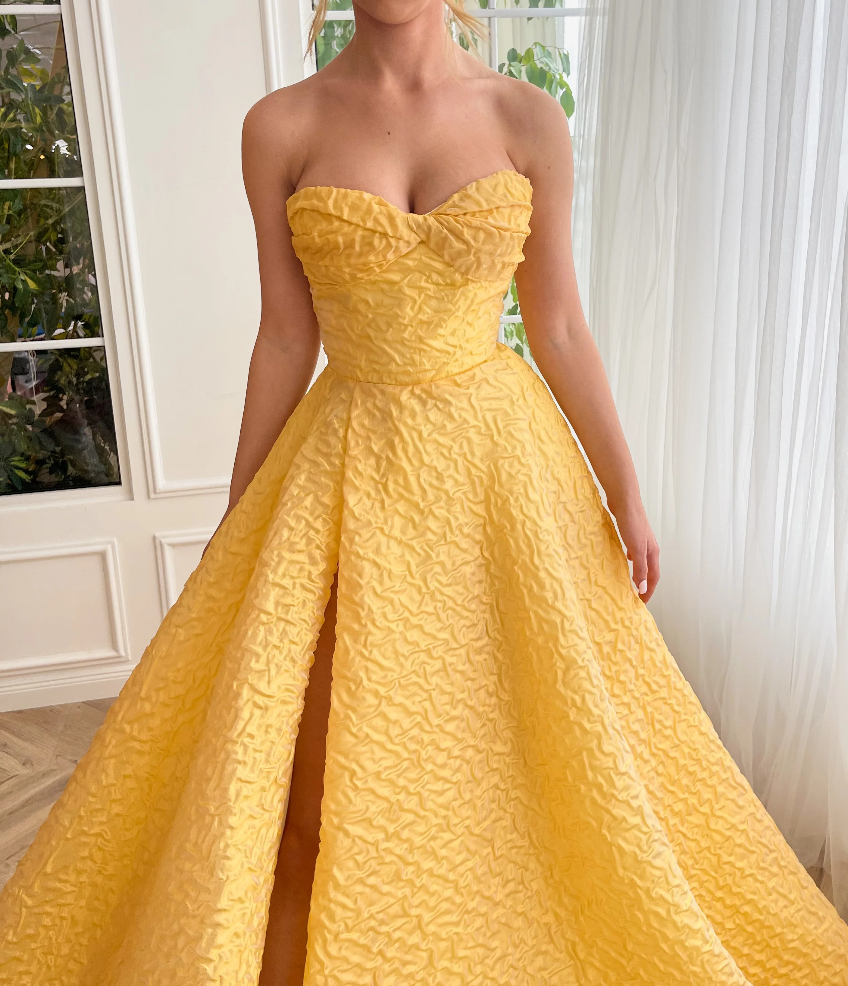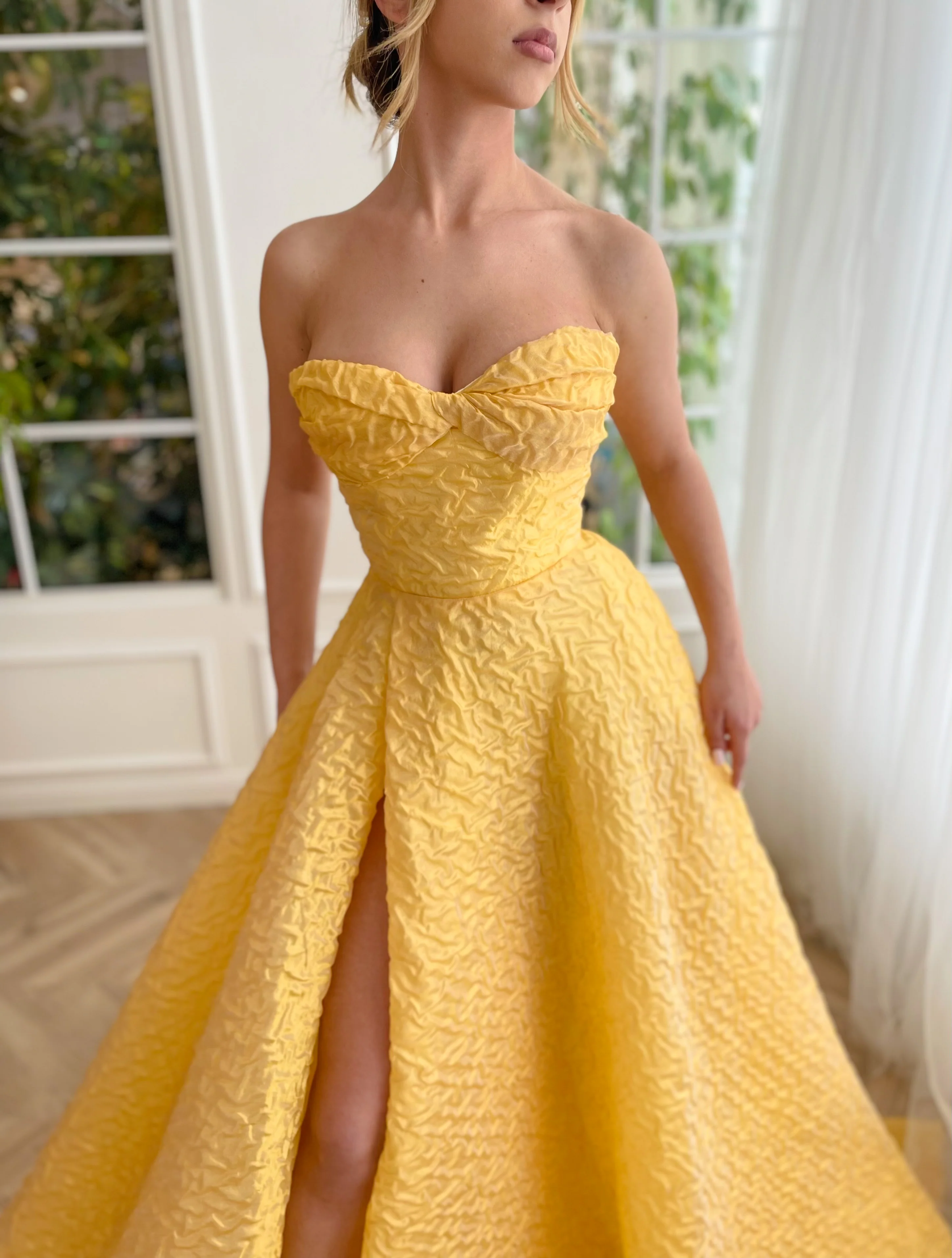 Presenting our stunning sunshine yellow gown, perfect for adding a touch of elegance and grace to your special occasions. This beautiful piece showcases a strapless neckline that elegantly highlights your collarbone, enhancing your natural allure. The draped bust, exquisitely crafted with a unique twisted technique, complements the structured bodice, which features built-in cups and boning to ensure a perfect fit. The waist is delicately cinched, leading to a graceful A-line silhouette. A bold leg slit introduces a hint of allure. Convenient inseam pockets are seamlessly integrated, adding practicality to this gorgeous design. The back of the gown is thoughtfully designed with a smooth zipper closure, ensuring a seamless and secure fit. This leads down to an impressive floor-length sweep train, guaranteeing a memorable entrance and a captivating evening. This gown embodies sophistication, promising to make your event truly unforgettable.