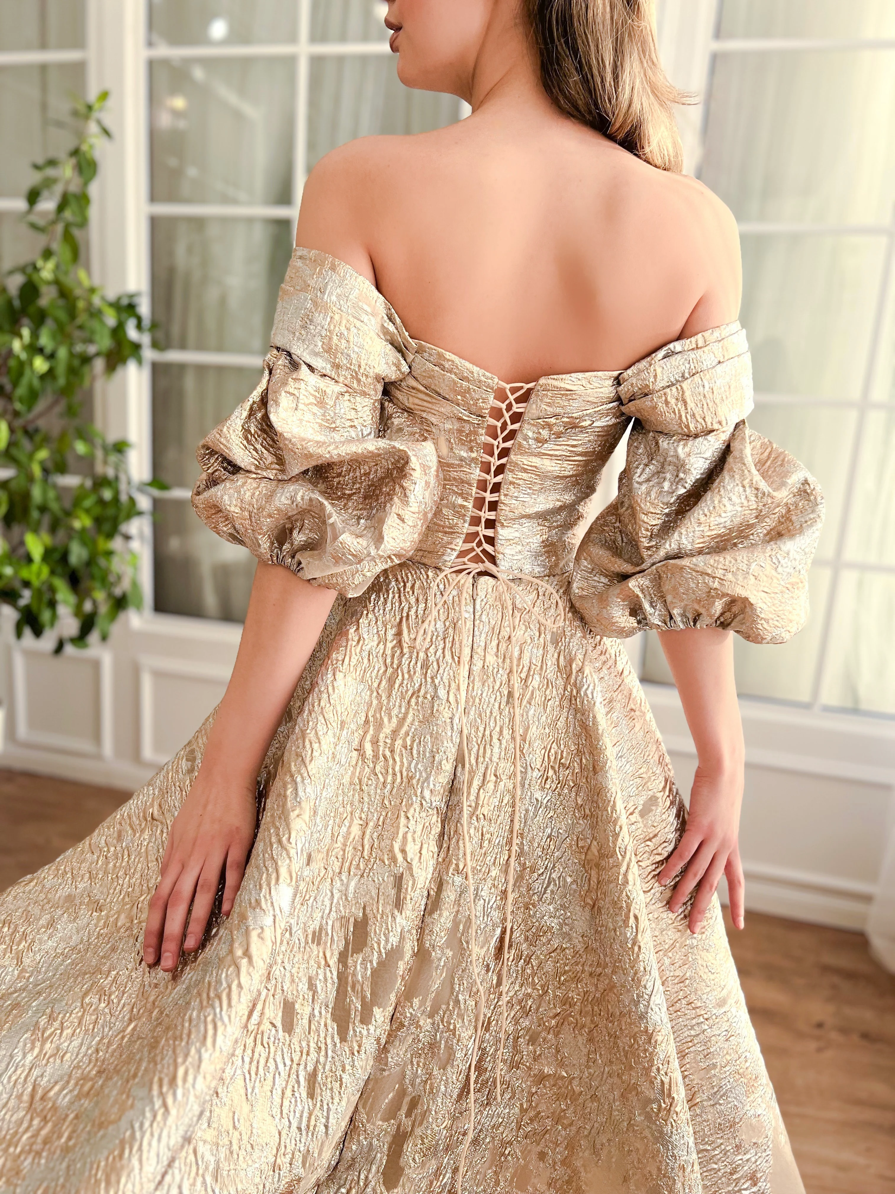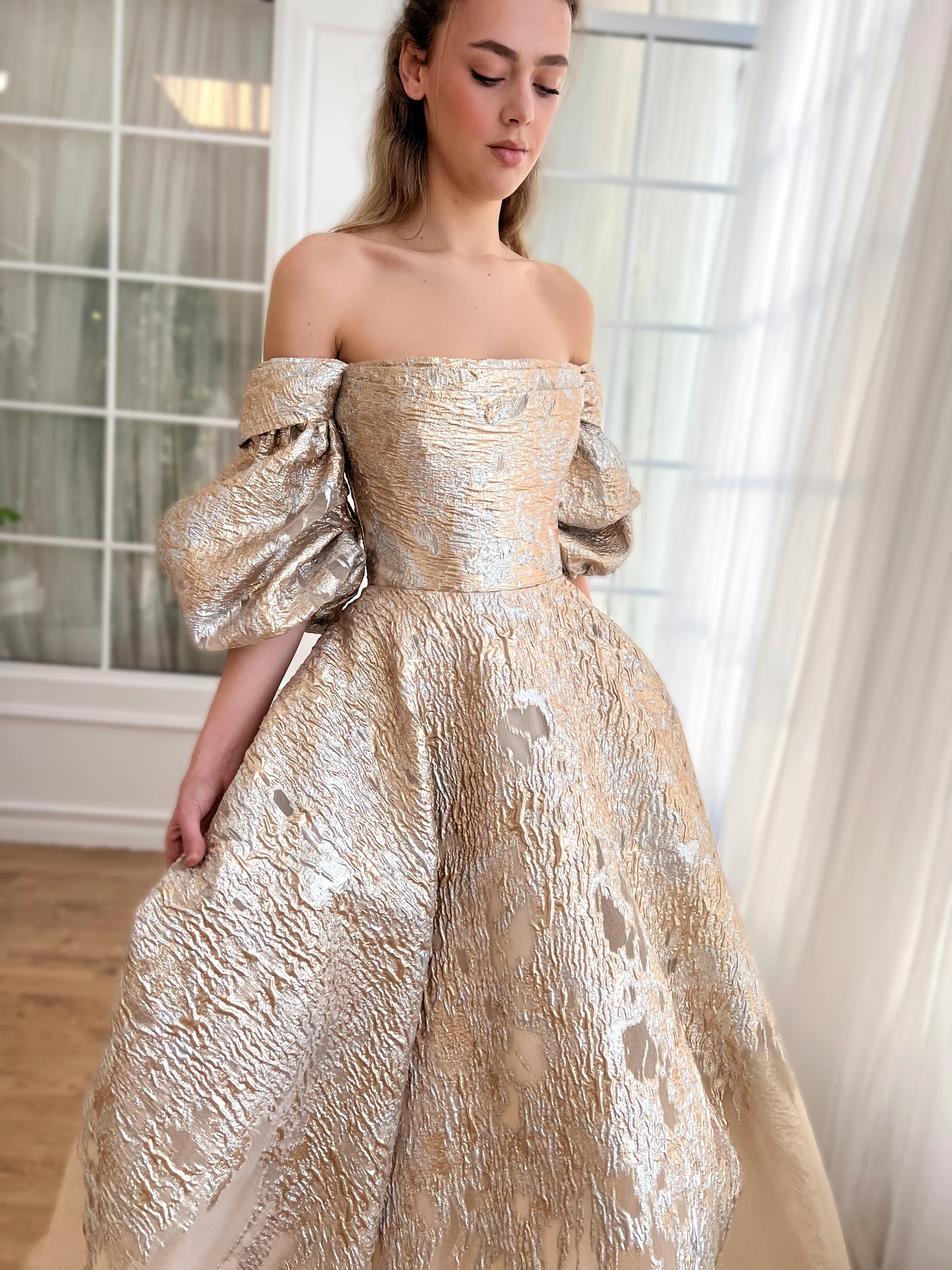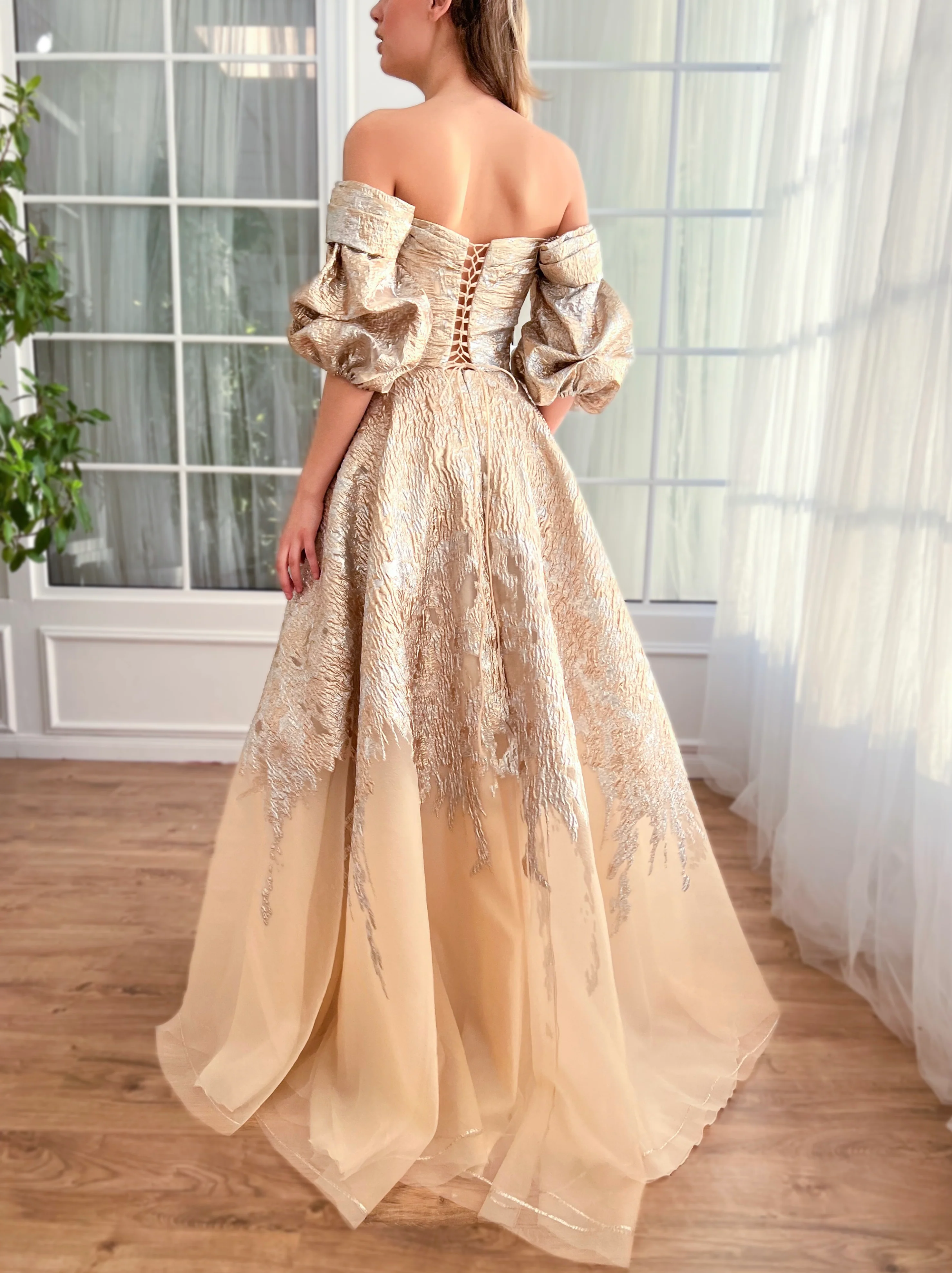 Discover elegance redefined with our exquisite floor-length dress, crafted from rich metallic beige brocade fabric that glistens with sophistication. Accented with delicate organza, this masterpiece features an intricately structured bodice, boasting boning and a pleated draped design that contours gracefully to highlight your silhouette. The cinched waist transitions seamlessly into an A-line silhouette, underscored by a thoughtful underlining and playful tulle layers that add volume and drama to the full skirt. Designed with modern functionality in mind, this dress also features discreet inseam pockets. The off-shoulder gathered puffy sleeves add a touch of romantic flair, perfectly complementing the dramatic, floor-sweeping skirt. A captivating lace-up back ensures a customizable, figure-flattering fit, making this dress a stunning choice for those who seek to blend timeless elegance with a touch of contemporary charm.