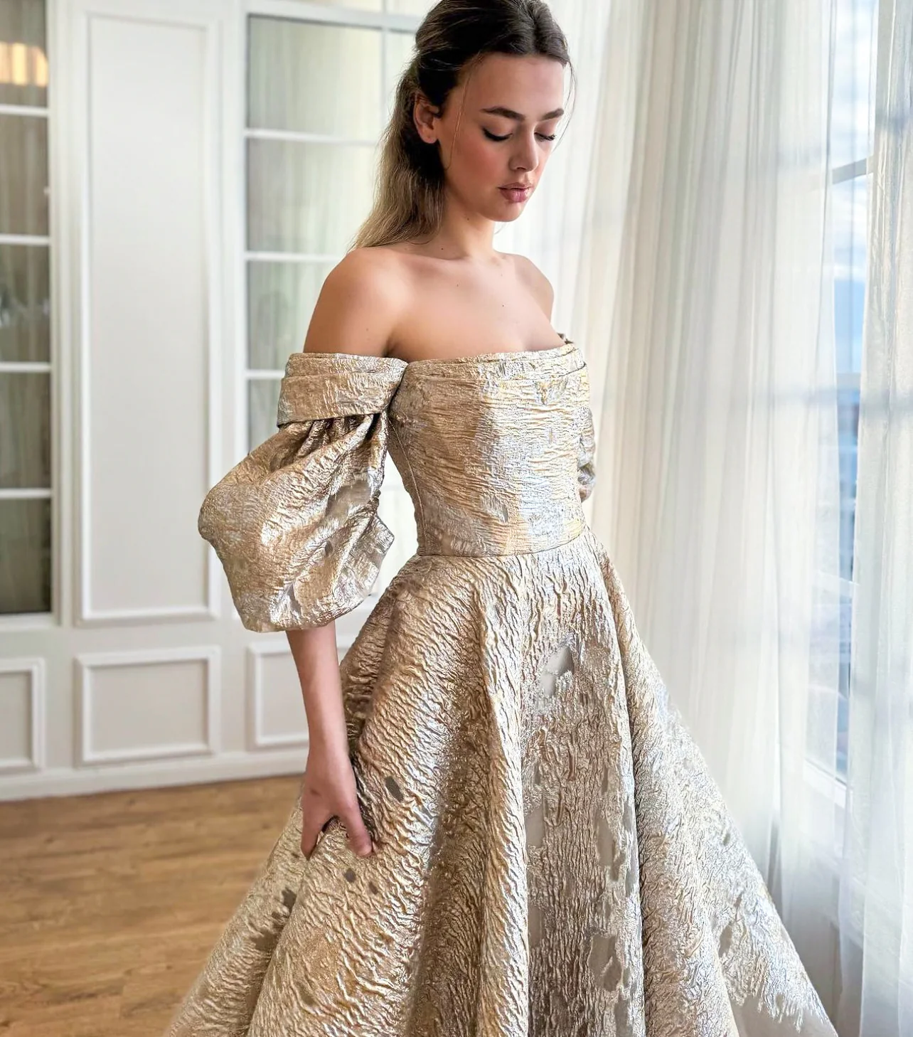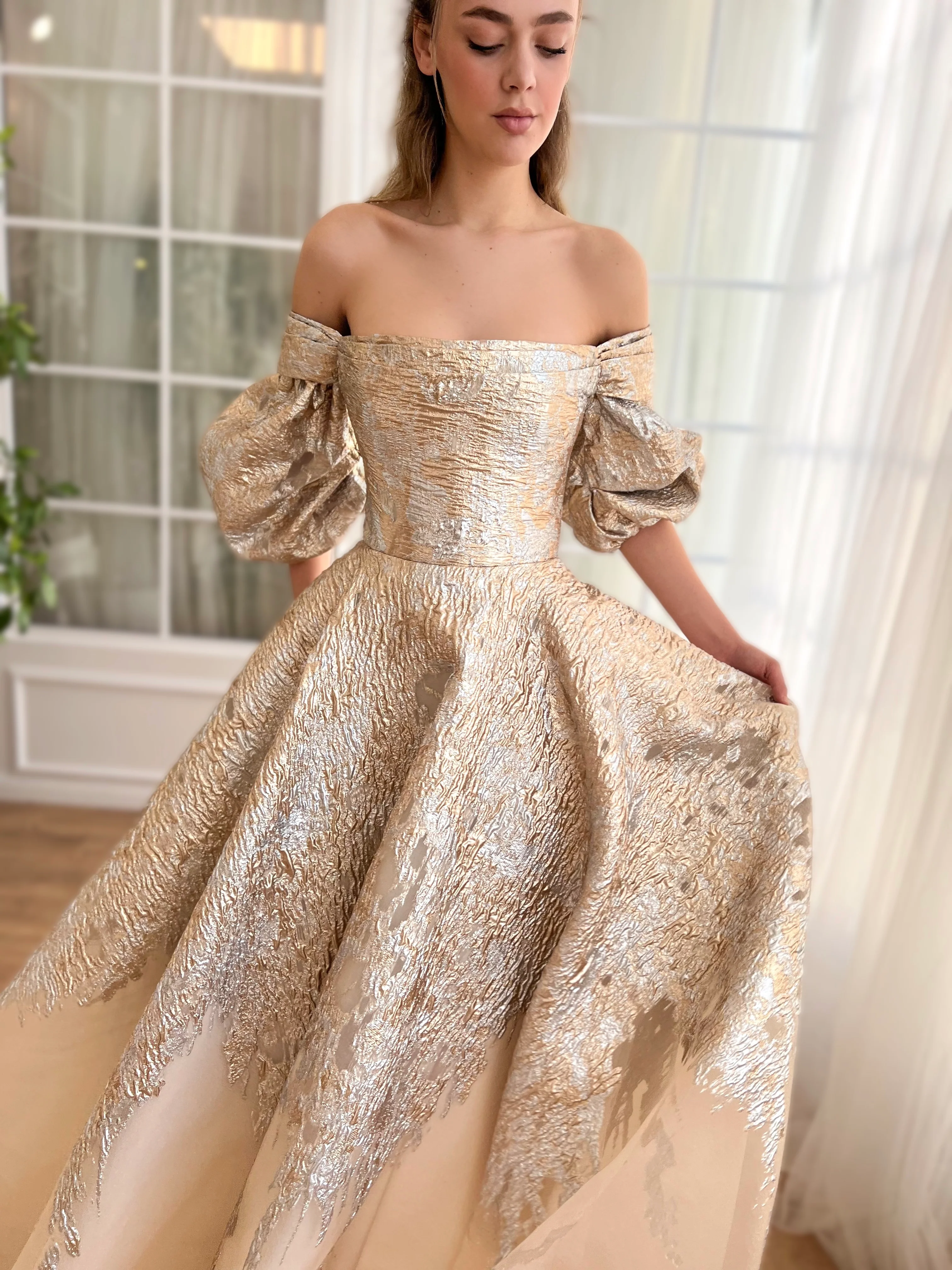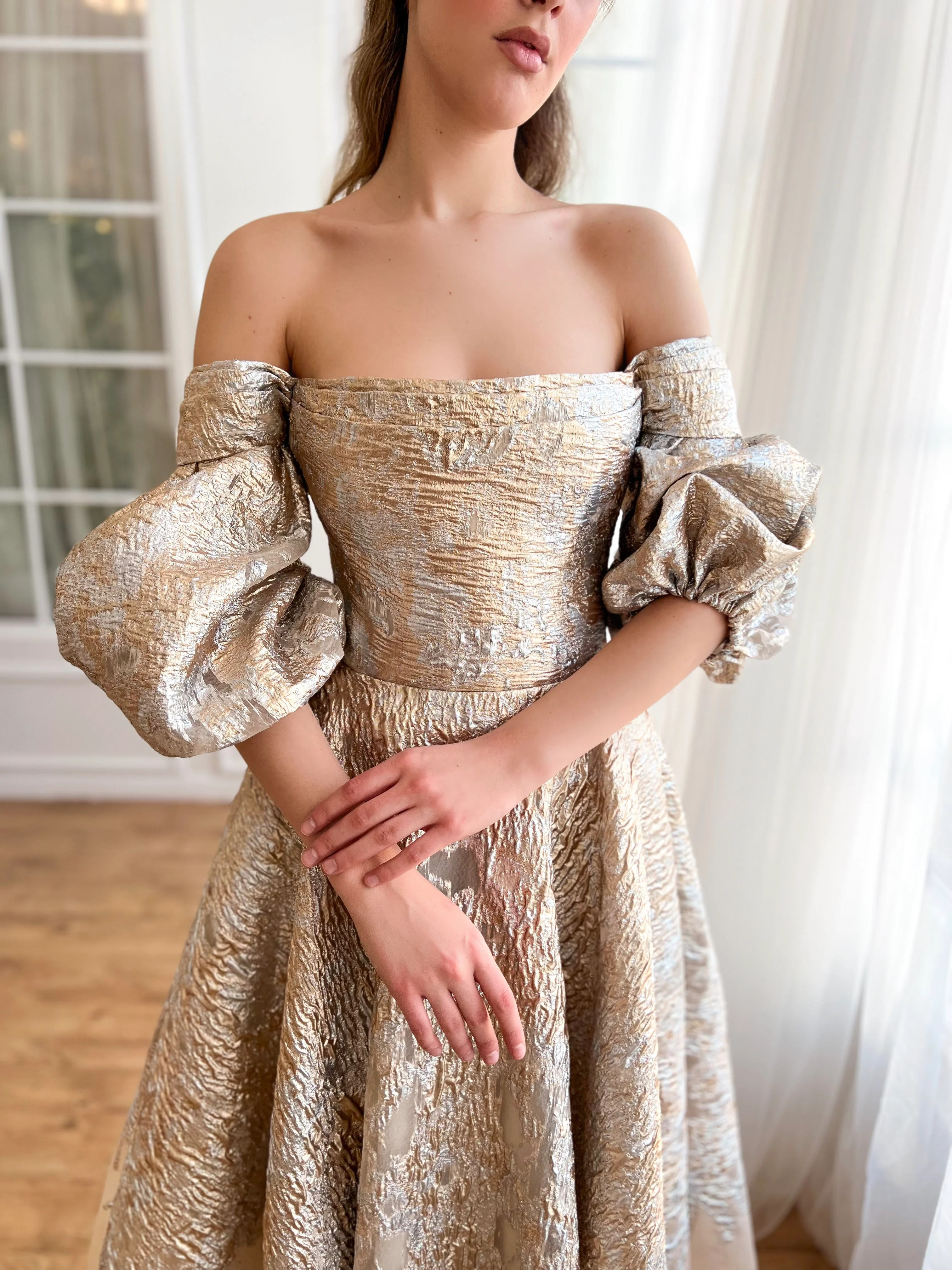 Discover elegance redefined with our exquisite floor-length dress, crafted from rich metallic beige brocade fabric that glistens with sophistication. Accented with delicate organza, this masterpiece features an intricately structured bodice, boasting boning and a pleated draped design that contours gracefully to highlight your silhouette. The cinched waist transitions seamlessly into an A-line silhouette, underscored by a thoughtful underlining and playful tulle layers that add volume and drama to the full skirt. Designed with modern functionality in mind, this dress also features discreet inseam pockets. The off-shoulder gathered puffy sleeves add a touch of romantic flair, perfectly complementing the dramatic, floor-sweeping skirt. A captivating lace-up back ensures a customizable, figure-flattering fit, making this dress a stunning choice for those who seek to blend timeless elegance with a touch of contemporary charm.