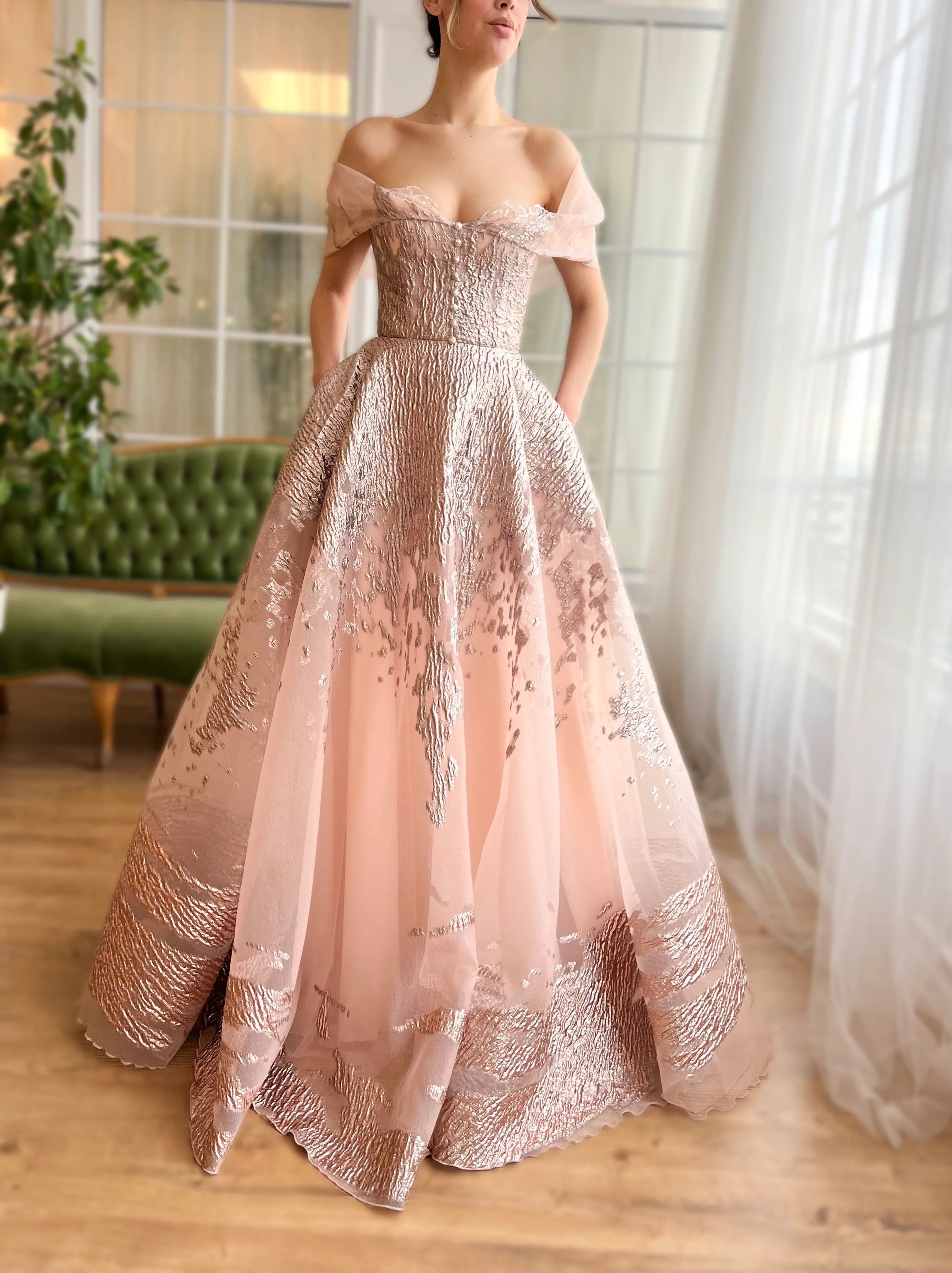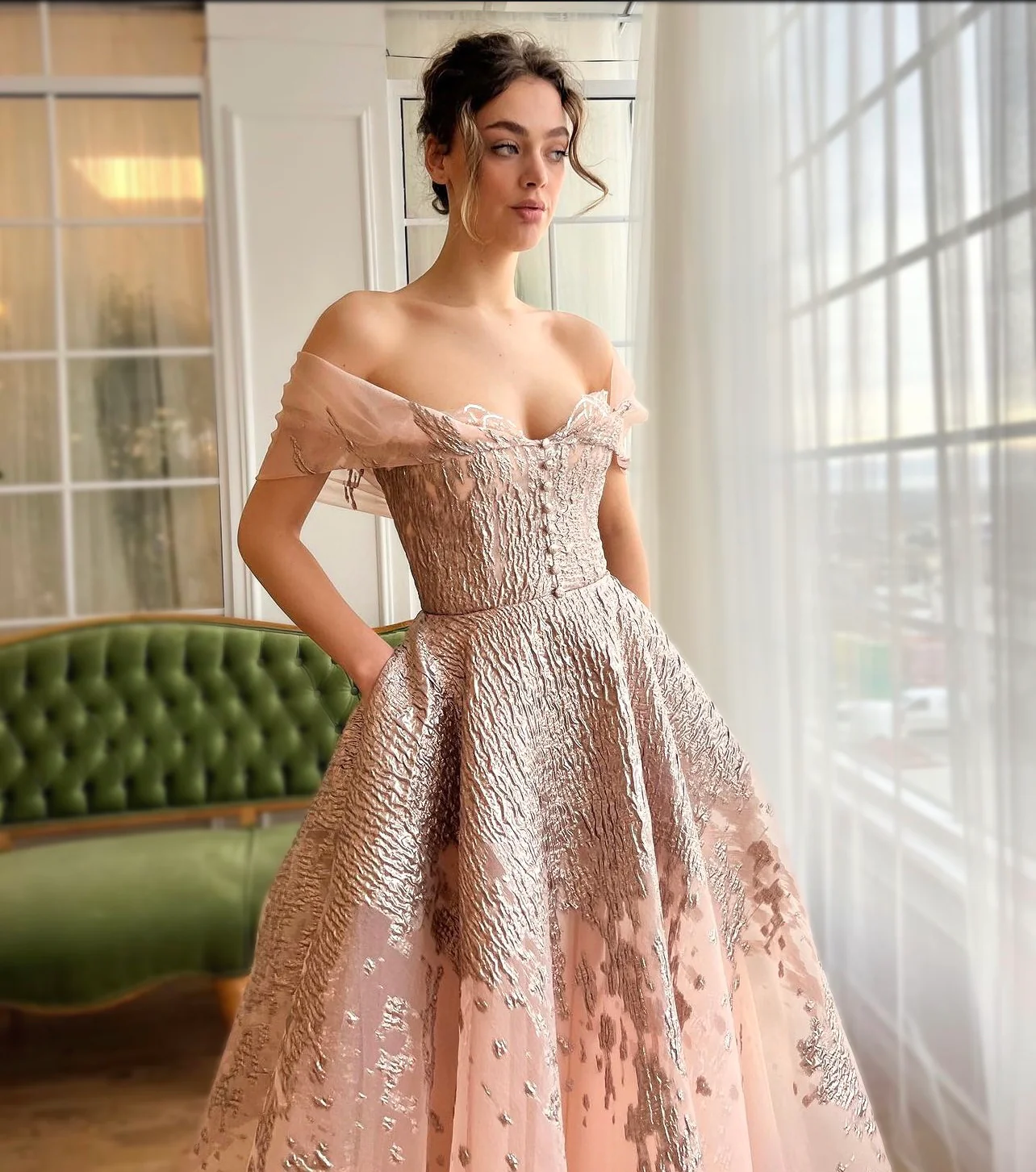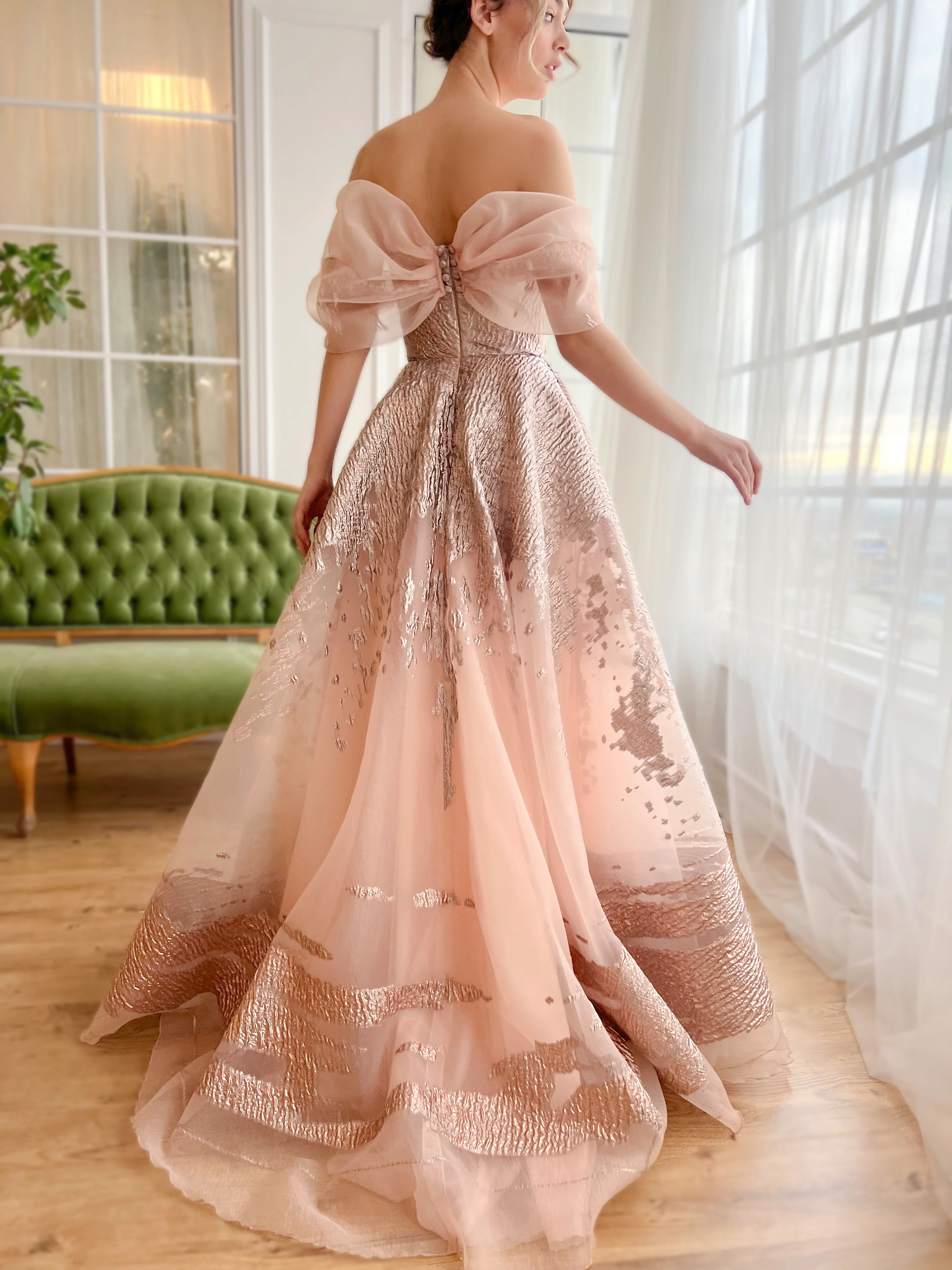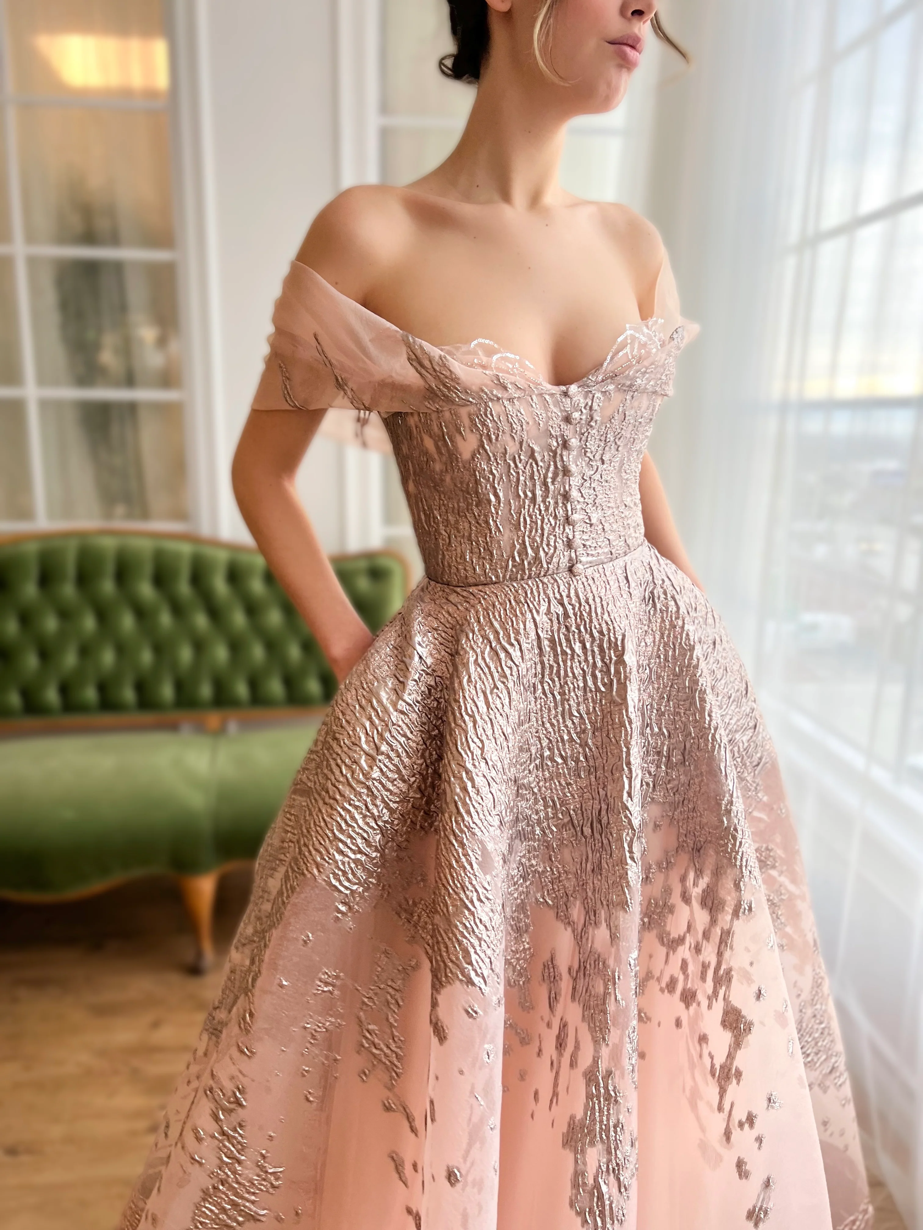 Step into a world of sophistication and enchantment with our Rose Champagne dress, a masterpiece that radiates elegance and a touch of whimsy. This exquisite creation is fashioned from metallic brocade fabric, beautifully accented with delicate organza, capturing the light and ensuring you shimmer with every step. The off-shoulder neckline exudes timeless grace, while the bodice, reinforced with built-in pads and boning, contours and flatters the figure with precision. Decorative placket buttons add a charming detail, leading down to a cinched waist that unfolds into a breathtaking A-line silhouette. Beneath the surface, an underlining and tulle layers combine to create a skirt that is both full and dramatic, offering movement and allure. Thoughtfully designed with inseam pockets for a blend of functionality and style, this floor-length gown is completed with a zipper-back closure, ensuring ease of wear without compromising on beauty. This dress is not just an outfit; it's a statement of elegance, perfect for making memorable moments at any grand occasion.
