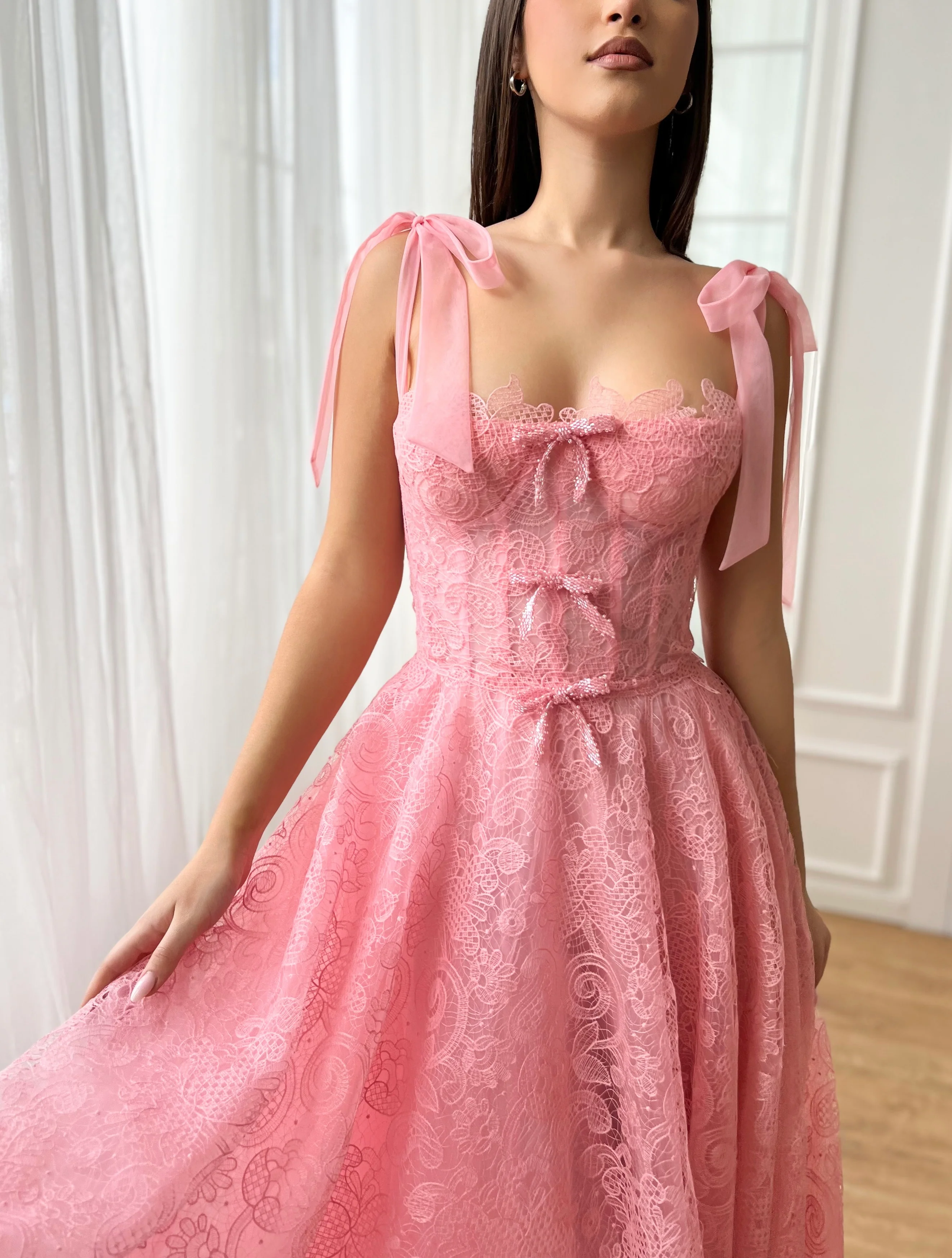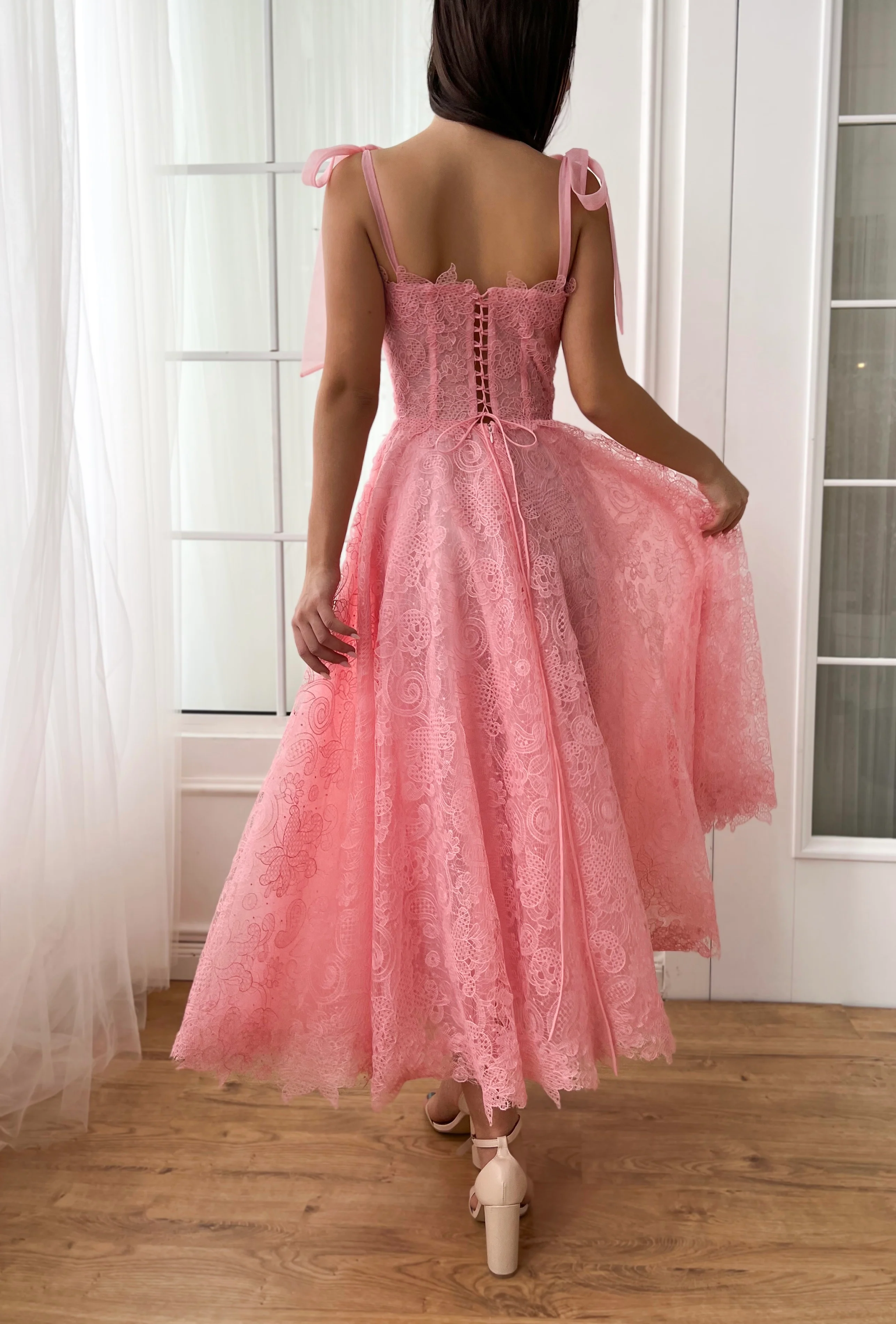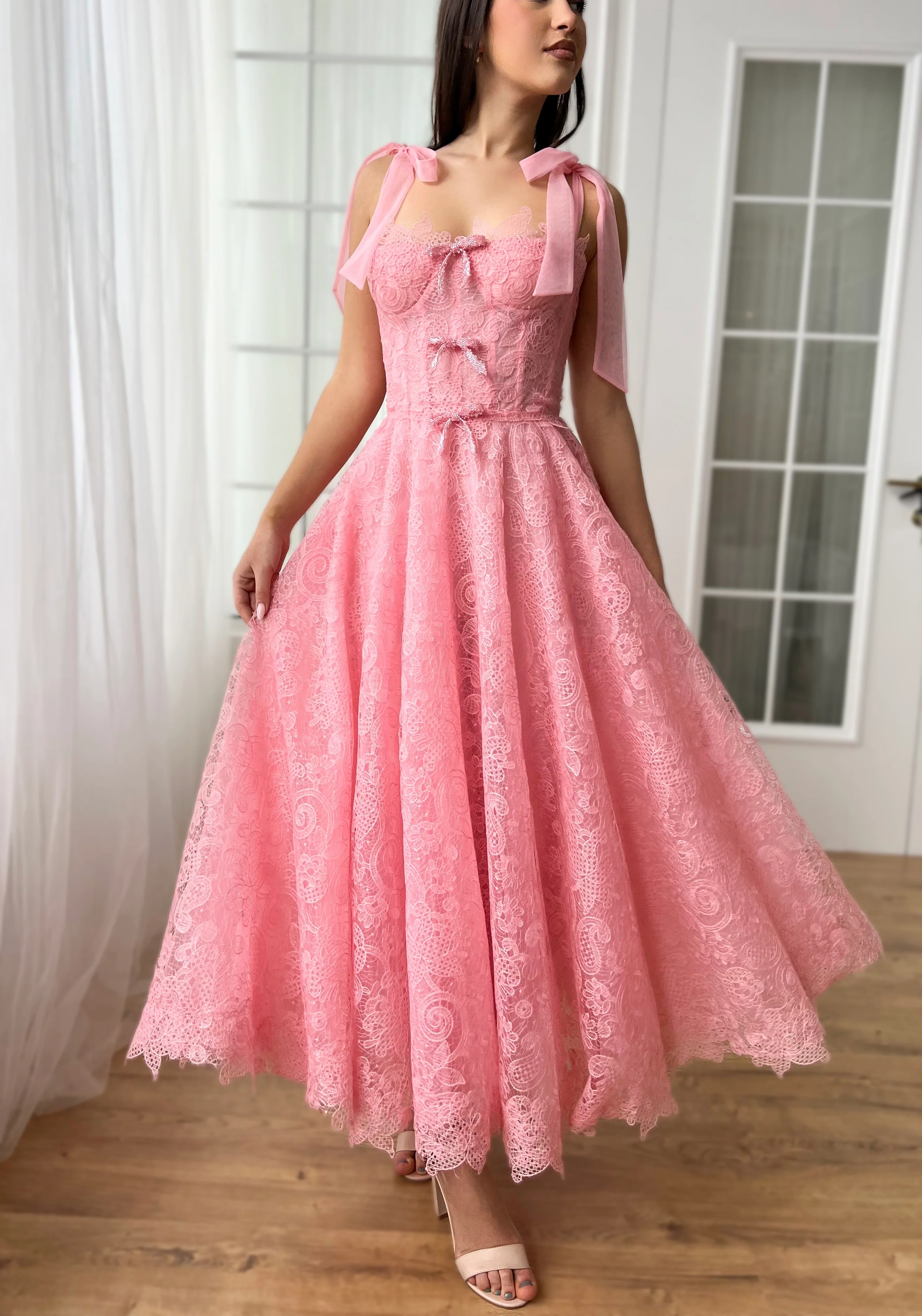 Step into spring celebrations with an air of enchantment in this exquisite midi-length dress, rendered in a delicate rose pink hue that whispers romance. Its bustier top, adorned with a trio of charming bow embellishments, features built-in pads and boning to sculpt and define your silhouette. Crafted from the finest Leavers lace and tulle fabric, it promises a touch of timeless elegance and texture. The dress cinches at the waist before flowing into a graceful midi-length style, complete with inseam pockets for a blend of beauty and practicality. Decorative, optional bow straps add a whimsical touch, while the lace-up back ensures a perfect fit, showcasing the dress's thoughtful design. Beneath its airy layers, a hidden mini-skirt lined with tulle peeks out, offering a playful surprise. Whether you're attending a garden party or a springtime soirée, this dress, with its perfect blend of charm and sophistication, guarantees you'll be the embodiment of spring's joyful essence.
