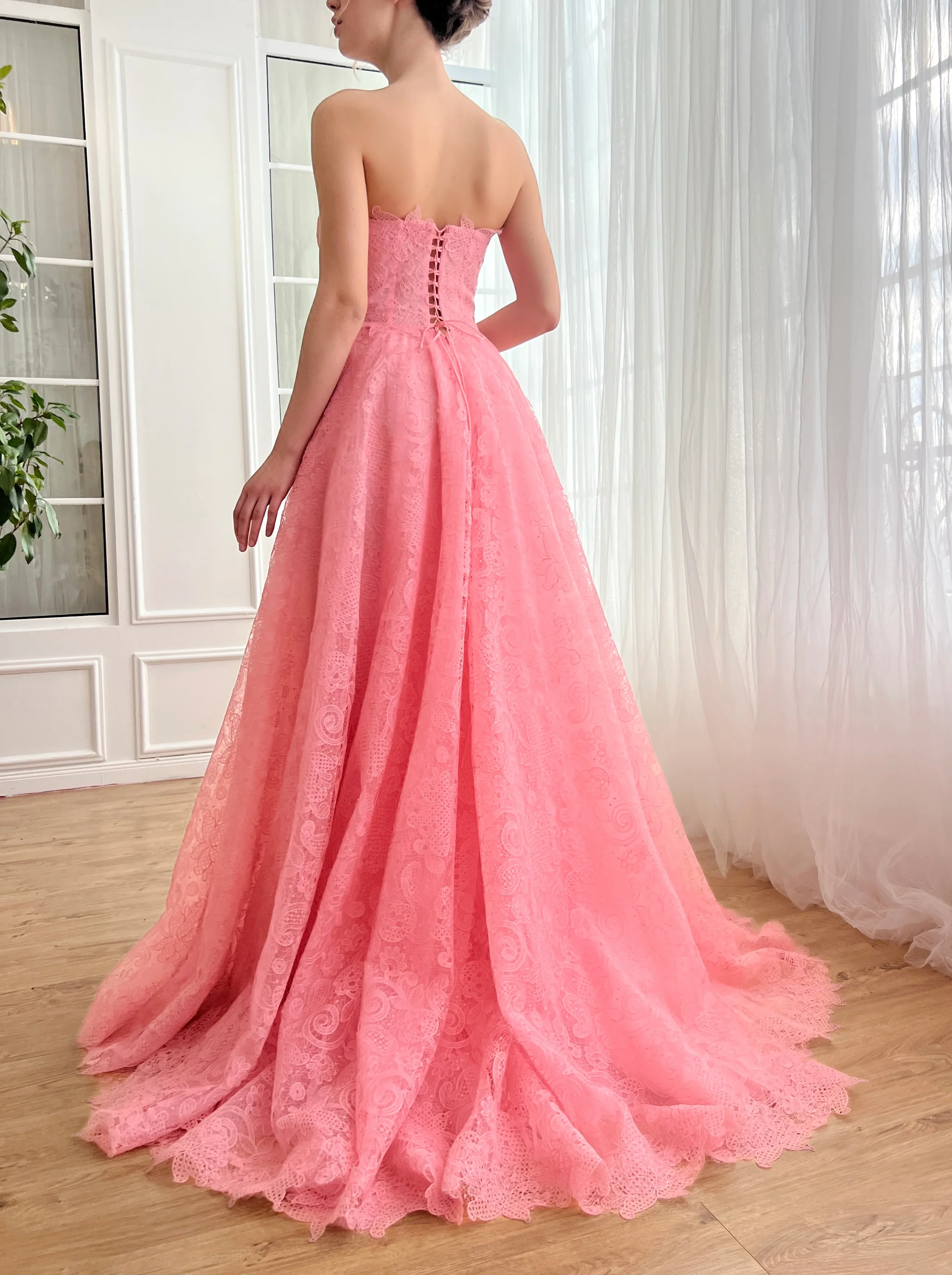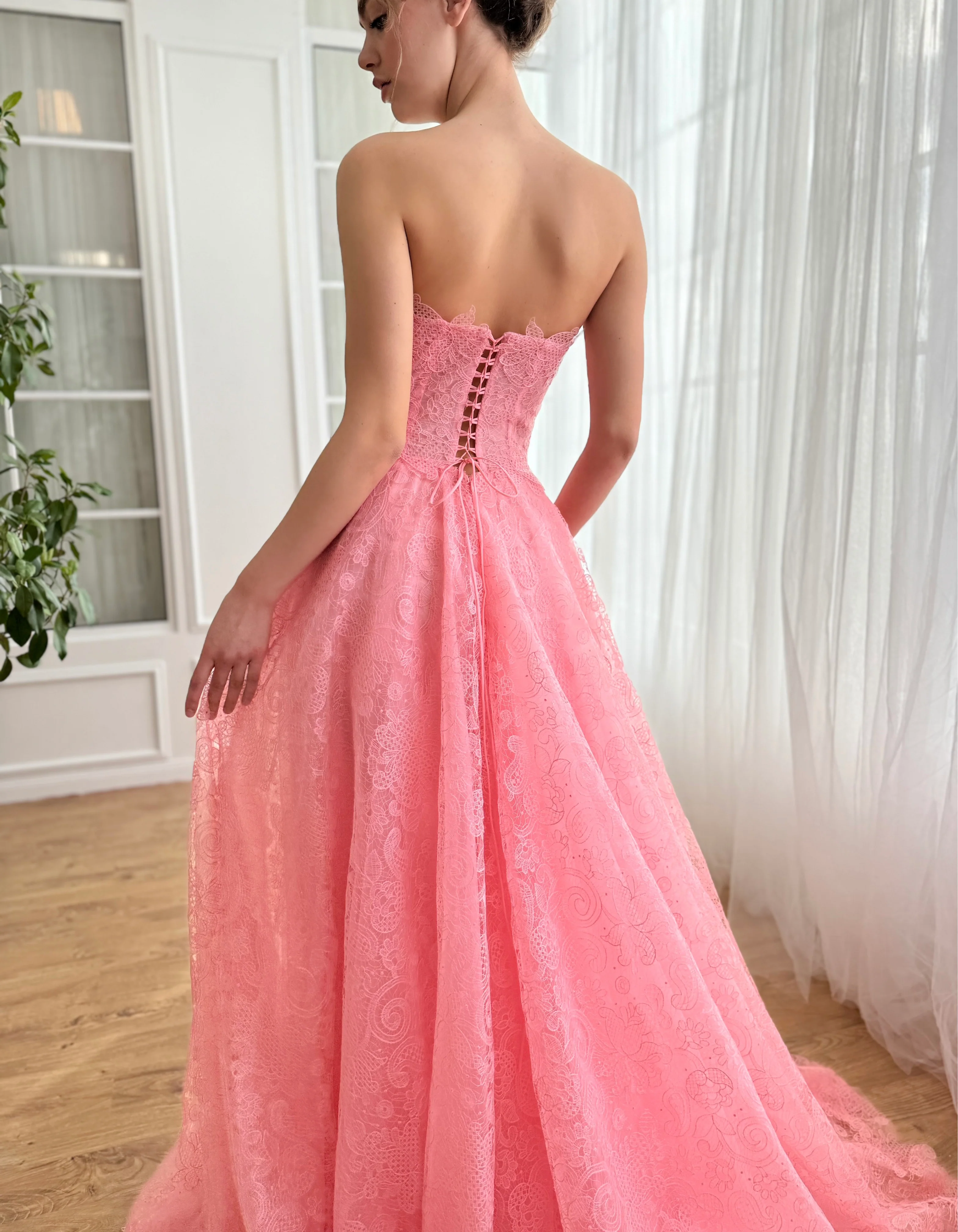Embrace the essence of spring with this enchanting rose pink dress, designed to captivate and charm at every turn. Its sweet yet striking appearance is accentuated by a trio of bow embellishments adorning the bustier top, which is meticulously crafted with built-in pads and boning to ensure a flawless fit. The dress is fashioned from exquisite Leavers lace and soft tulle fabric, featuring a strapless neckline that gracefully highlights the shoulders and a cinched waist that flows into an A-line silhouette, promising a silhouette that’s both elegant and flattering. Practical yet stylish, the dress comes with inseam pockets and a lace-up back for an adjustable fit. Beneath its sophisticated exterior lies a playful secret: tulle layers over a mini-skirt that adds a touch of whimsy. Whether attending a spring wedding, garden party, or any celebratory event, this dress guarantees you'll look and feel your best, making it the perfect choice for any spring celebration.