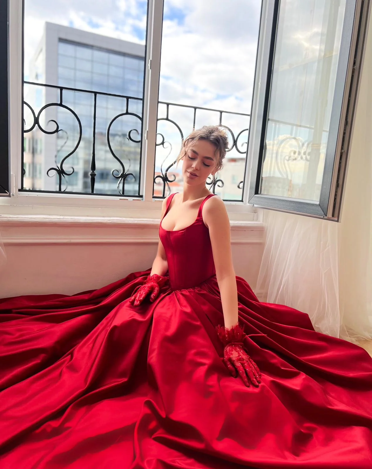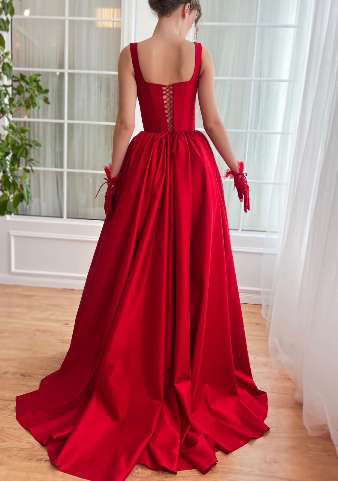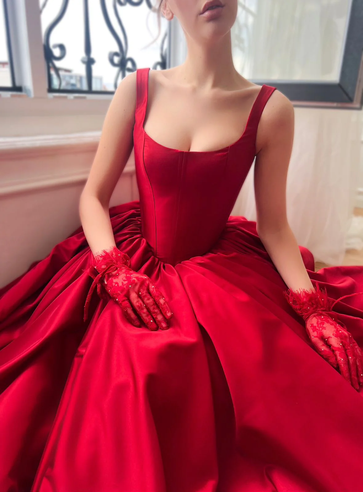Step into a world where timeless elegance meets modern sophistication with this dramatic renaissance-inspired taffeta gown. Drenched in a captivating scarlet red, this gown is designed to make you the undeniable belle of the ball. The gown features a classic round neckline that gracefully transitions into a structured bodice, complete with boning and supportive straps, ensuring a silhouette that’s both flattering and commanding. The A-line shape elegantly flows into a wide, gathered skirt, accented by a tasteful leg slit that adds a touch of allure. The floor-length ensemble is dramatically finished with a sweeping train that promises to leave an unforgettable impression. At the back, a lace-up design adds a vintage touch, while the included embroidered sparkle ruffle bow gloves lend an air of aristocratic charm, making this gown not just a dress, but a statement of unmatched elegance and style.