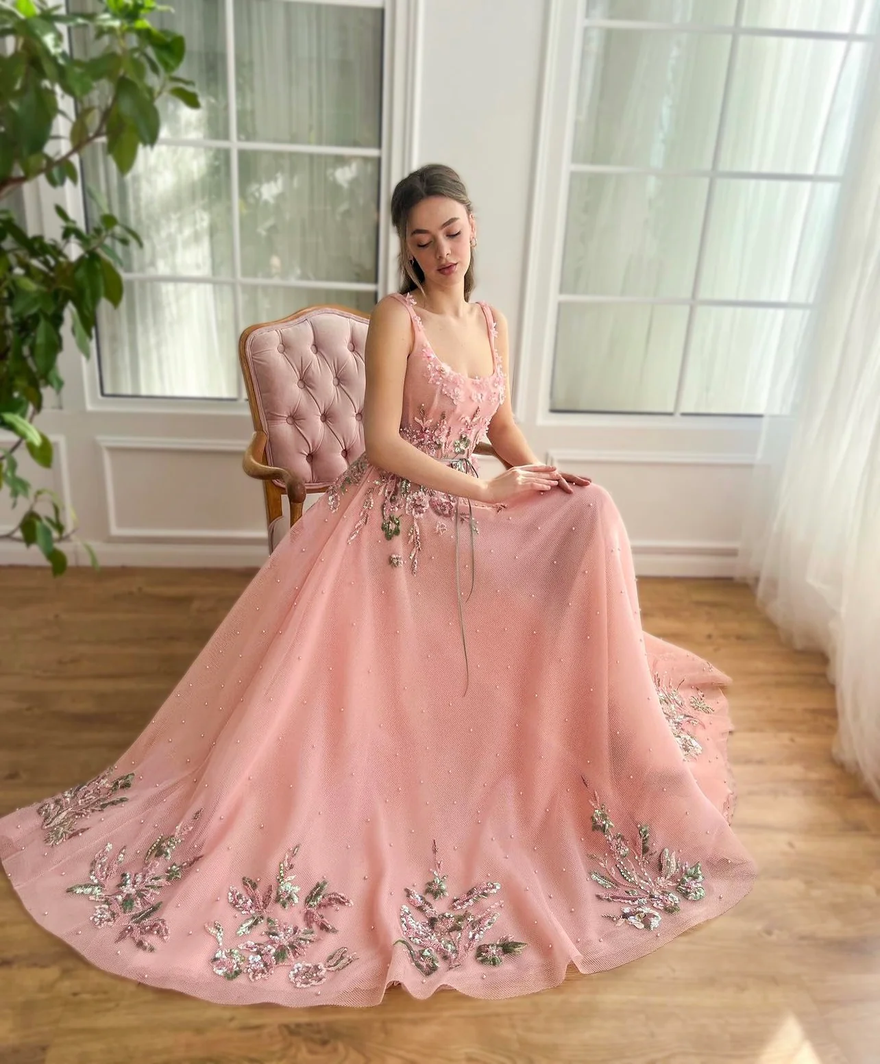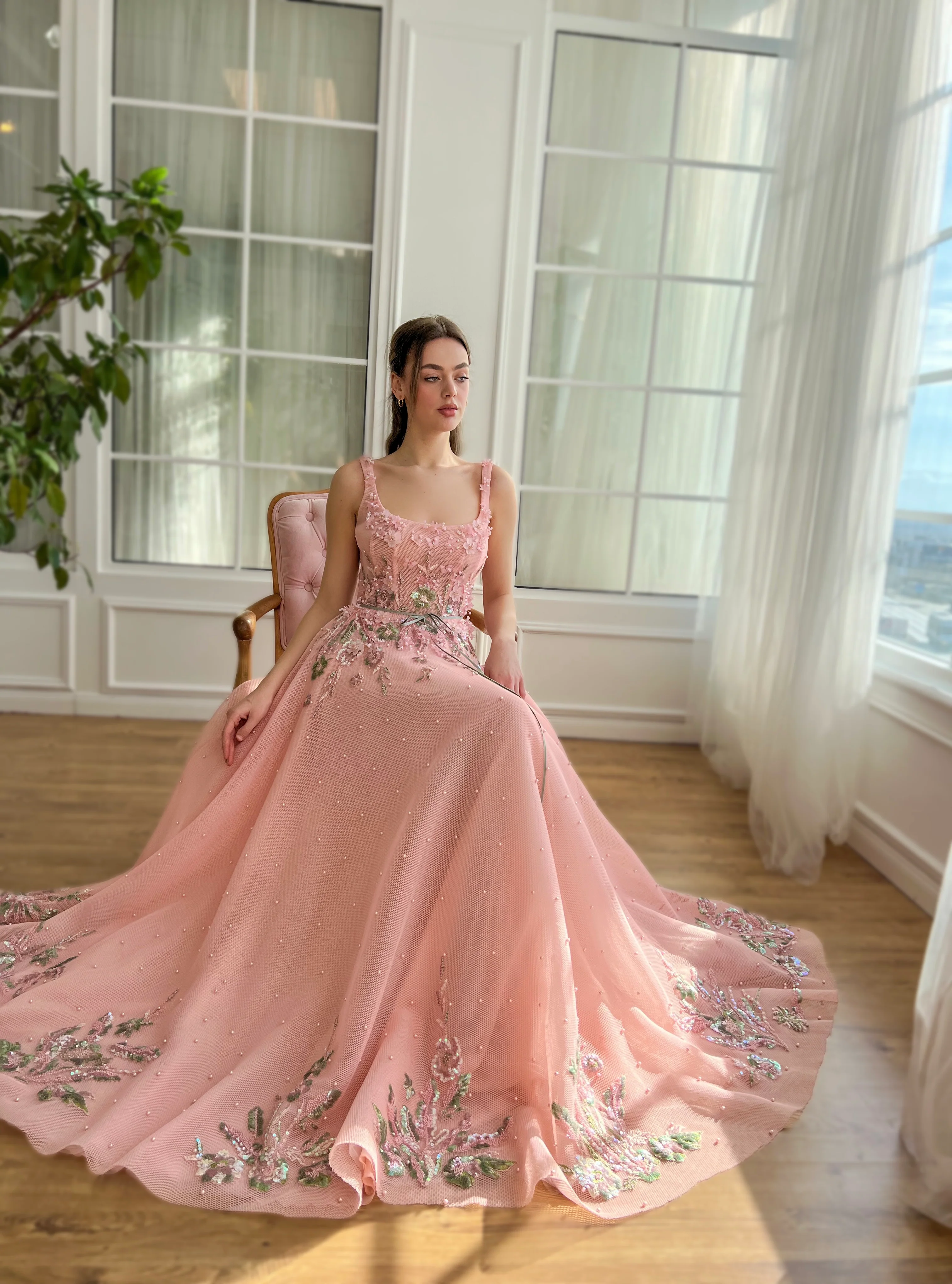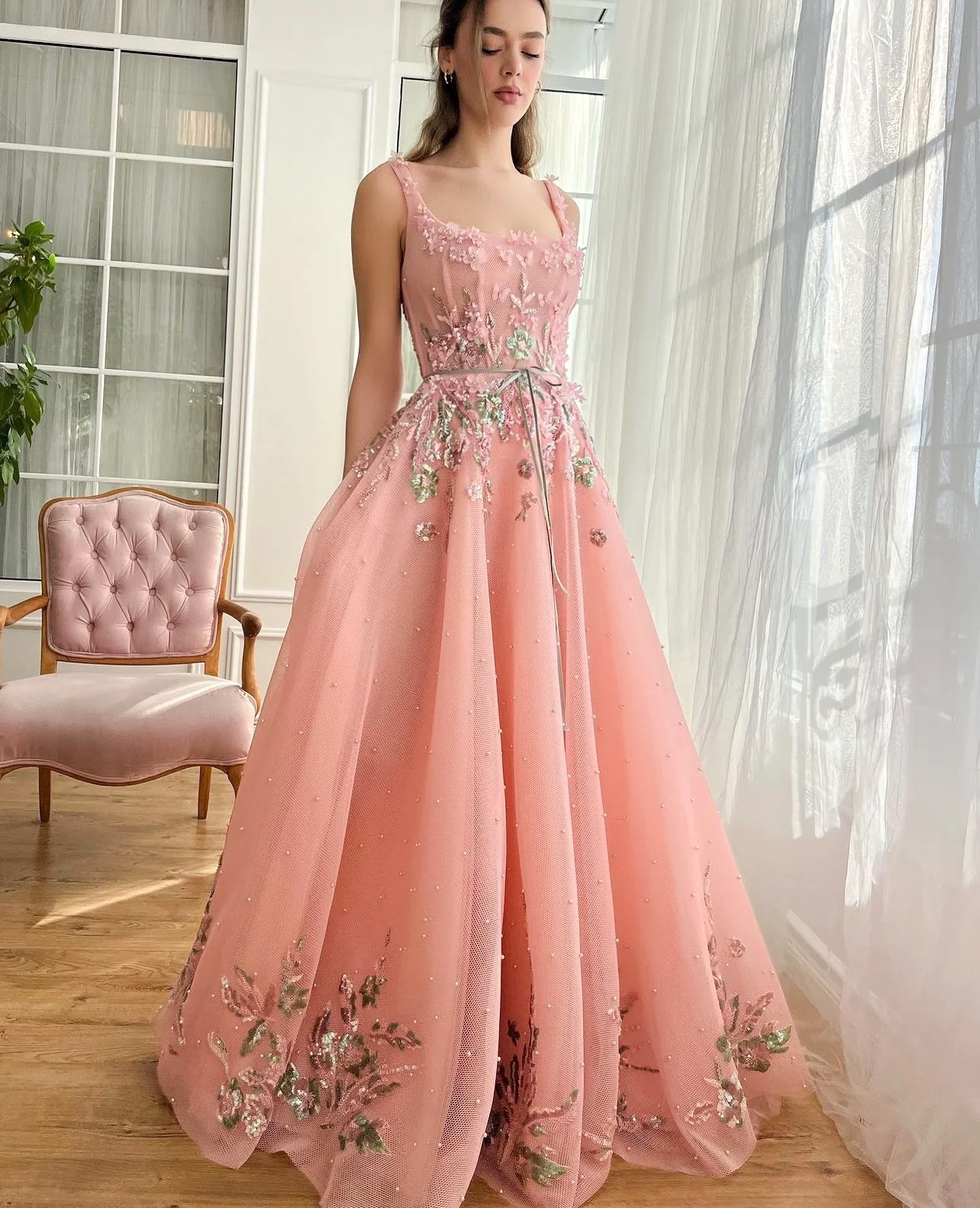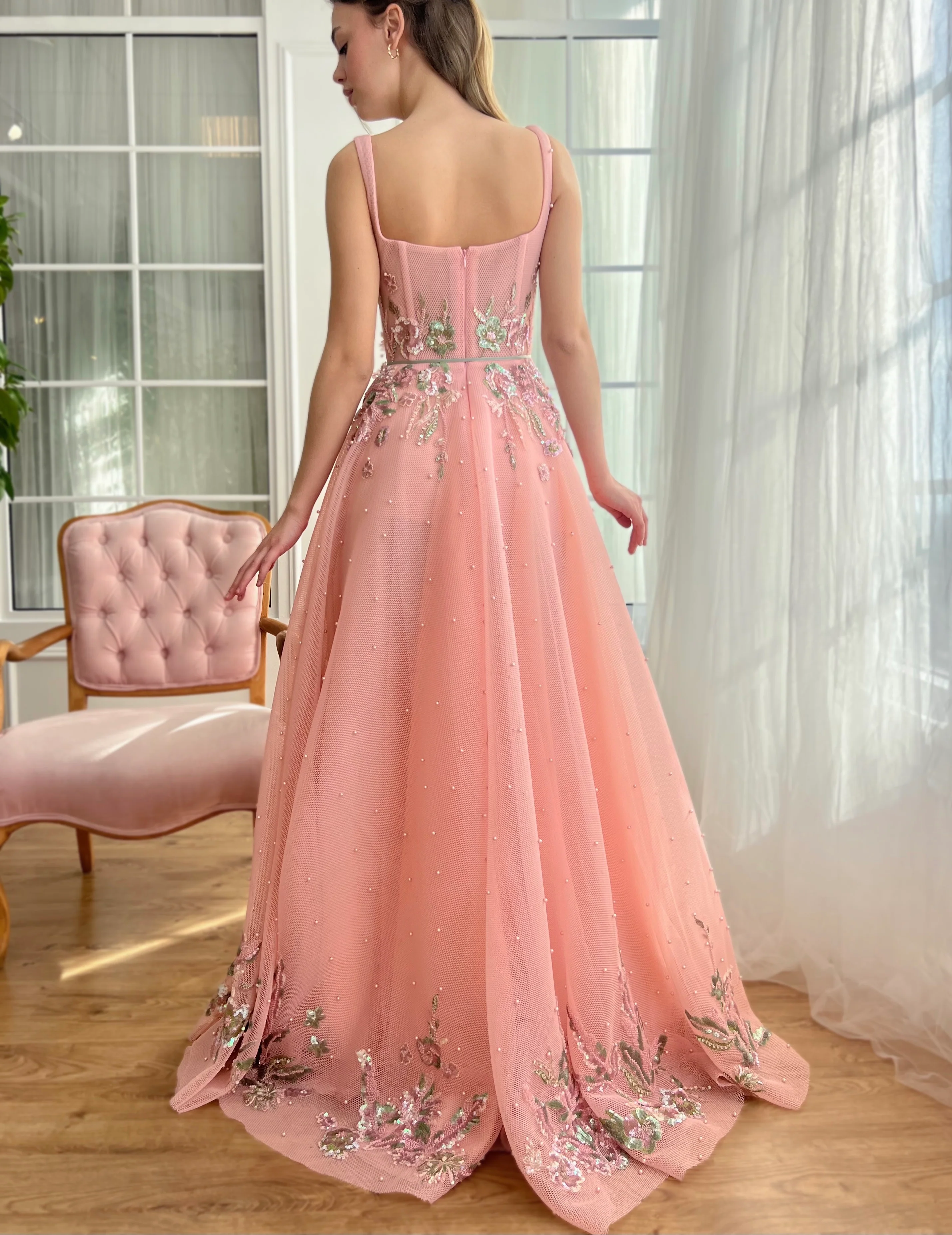 Drape yourself in enchantment with our Rose Pink A-Line Dress, a masterpiece of fashion designed for proms, evening gatherings, and those moments when you wish to stand out. Crafted from luxurious mesh/net fabric adorned with pearls, this dress features a meticulously handmade embroidery of 3D green and pink flowers, paired with delicately embellished powder butterflies to weave a magical allure around you. The dress boasts a round neckline and a structured bodice with boning, ensuring a silhouette that flatters and defines the waist. The A-Line style, enhanced with inseam pockets and a decorative ribbon belt, flows into a beautifully designed bottom skirt, embellished with motifs that add a layer of sophistication. Whether it's the spellbinding details or the practical elegance of the design, this dress promises to make your special occasions unforgettable.