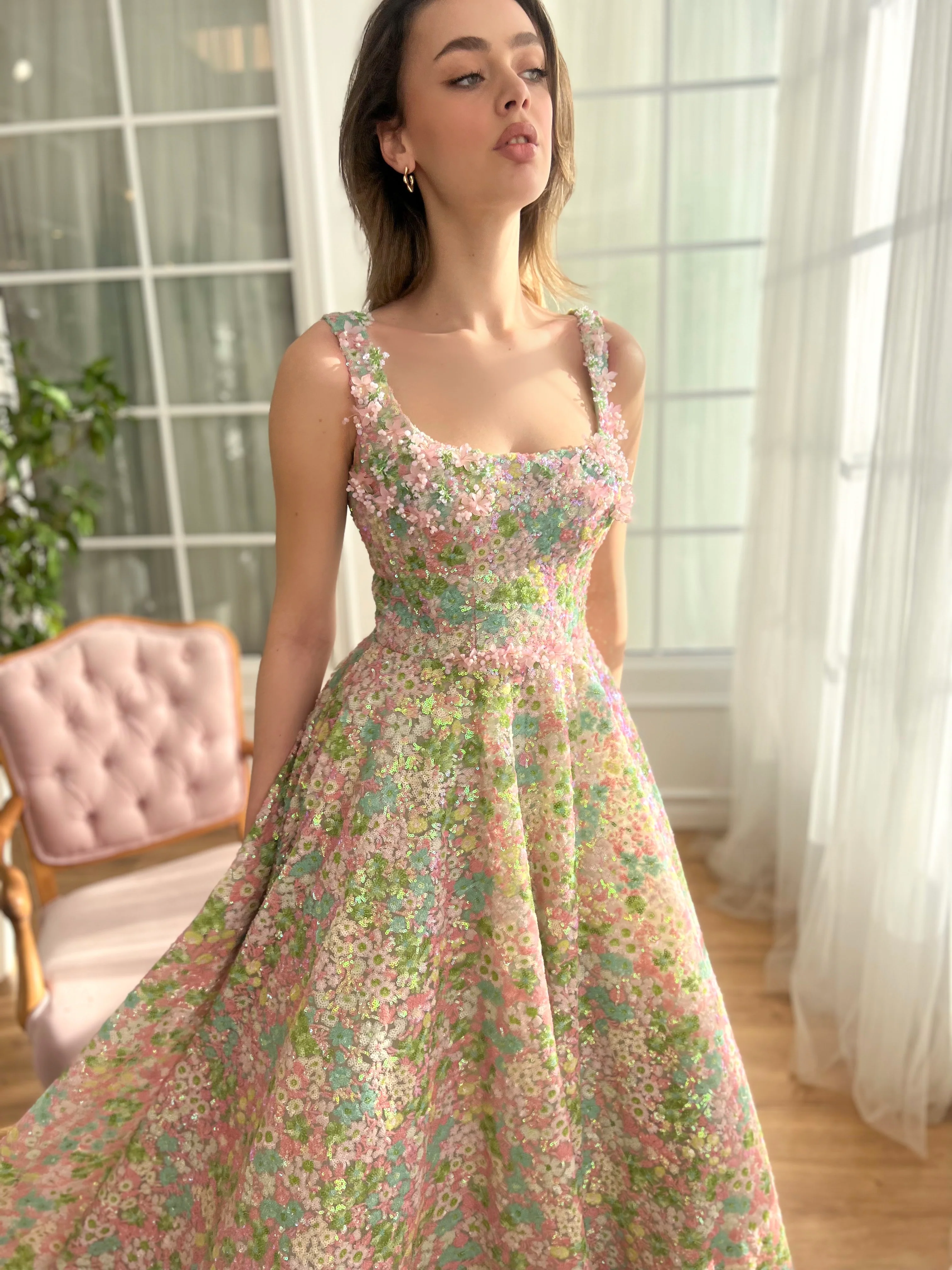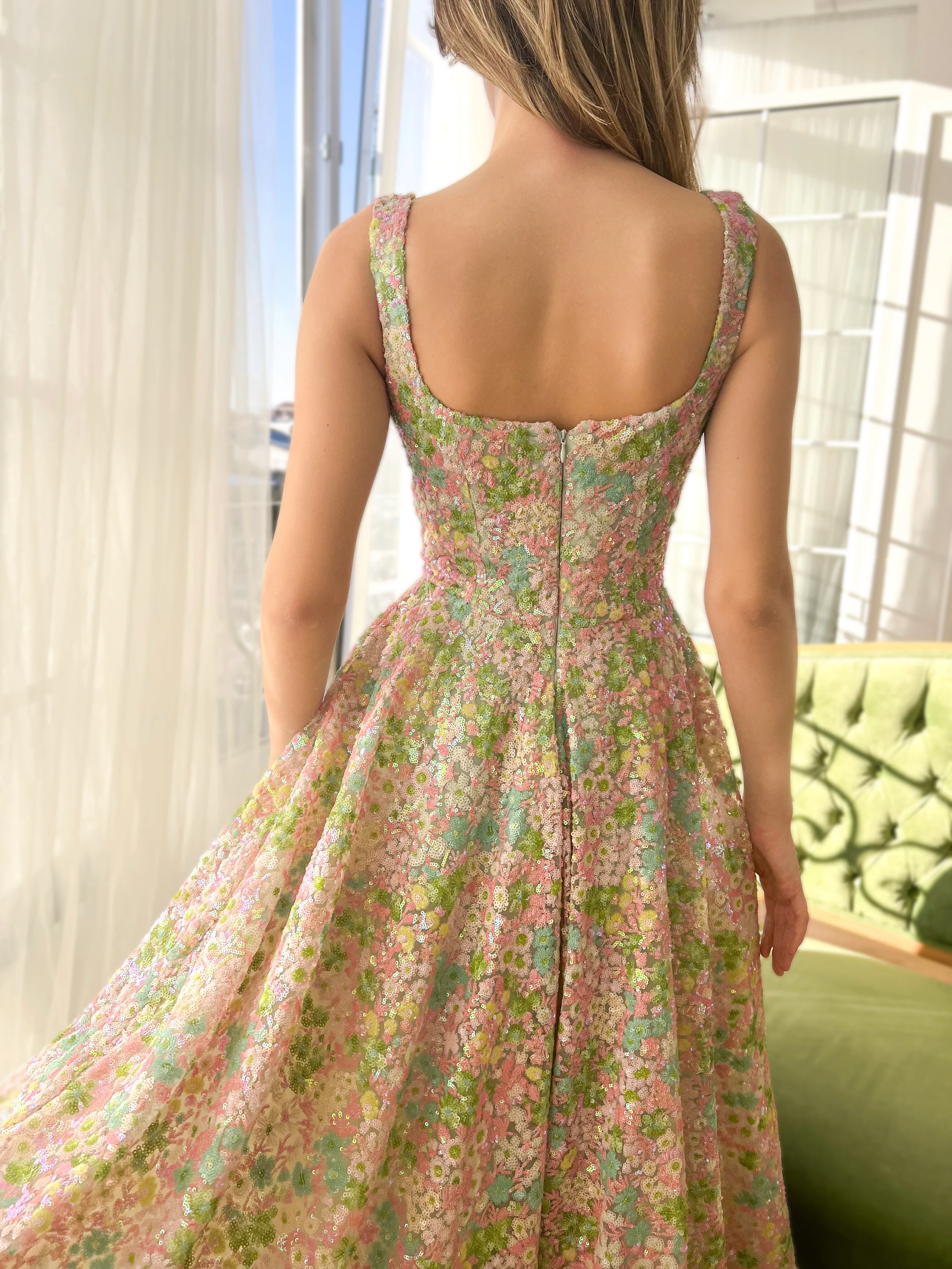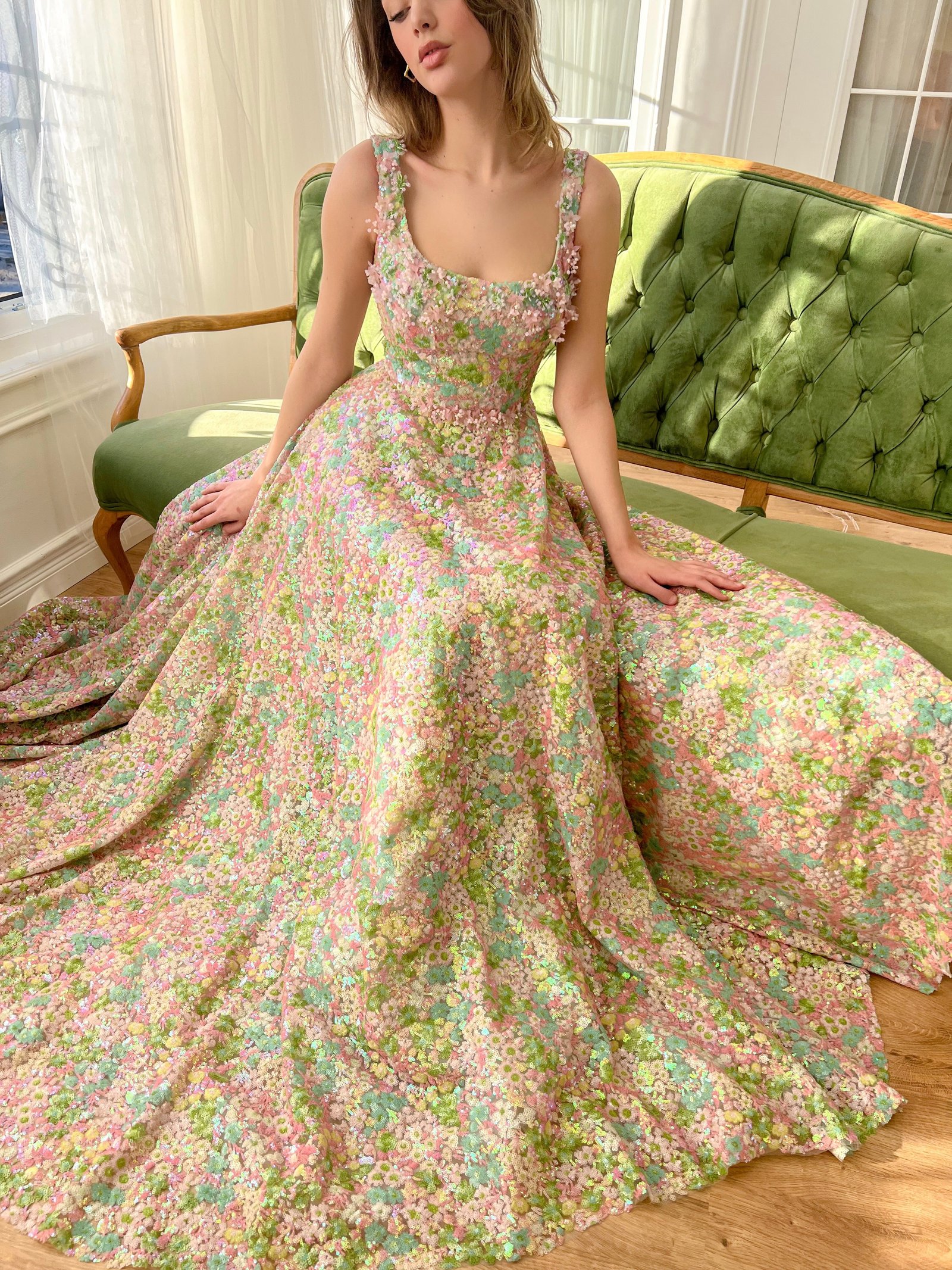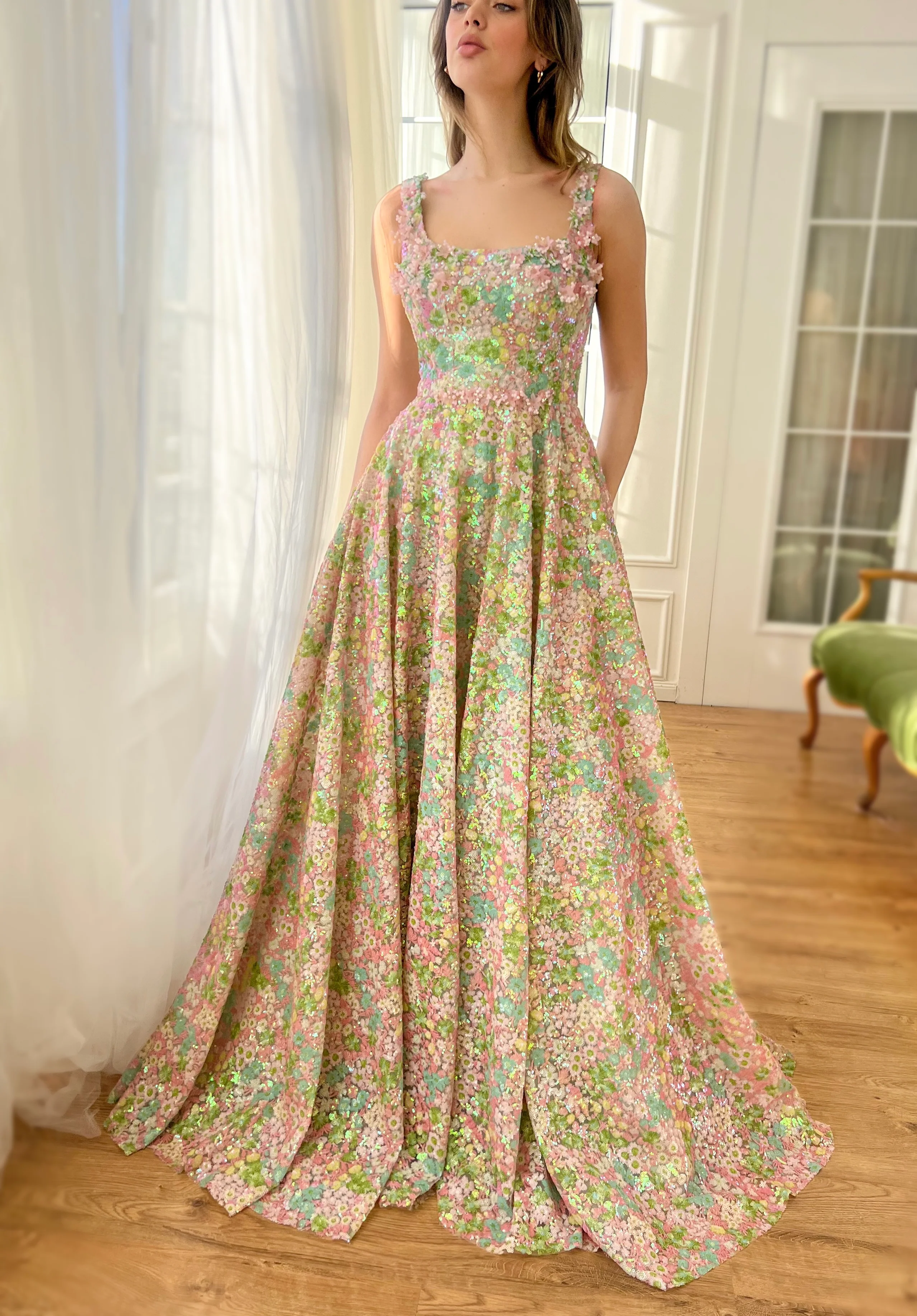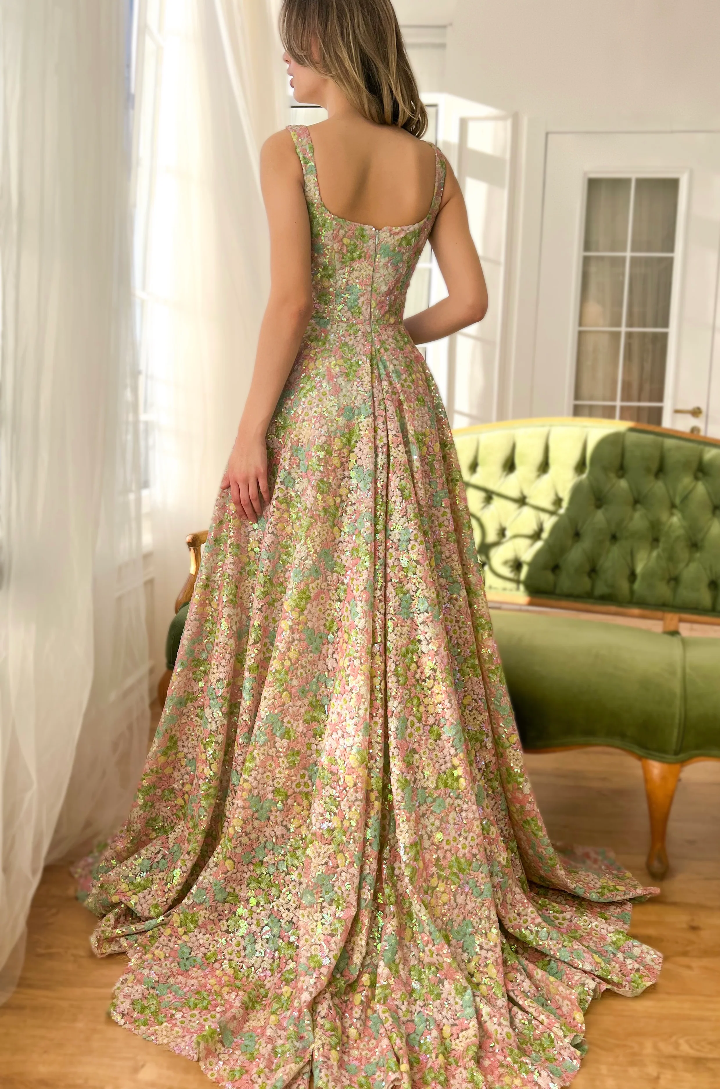 Captivate the room in this exquisite floor-length dress, a symphony of vibrant Coral Rose and Green, adorned with meticulously placed sequined floral patterns. Its round blouse neckline offers a timeless grace, while the A-line silhouette promises to flatter every figure. The dress features a breathtaking train, adding a touch of drama to every step. Practical yet chic, it includes a zipper-back closure and discreet inseam pockets. The design is elevated with embroidered blush pink blossoms, intricately stitched to add depth and dimension. This piece isn't just a dress; it's a masterpiece that brings together elegance, craftsmanship, and a whisper of floral fantasy.