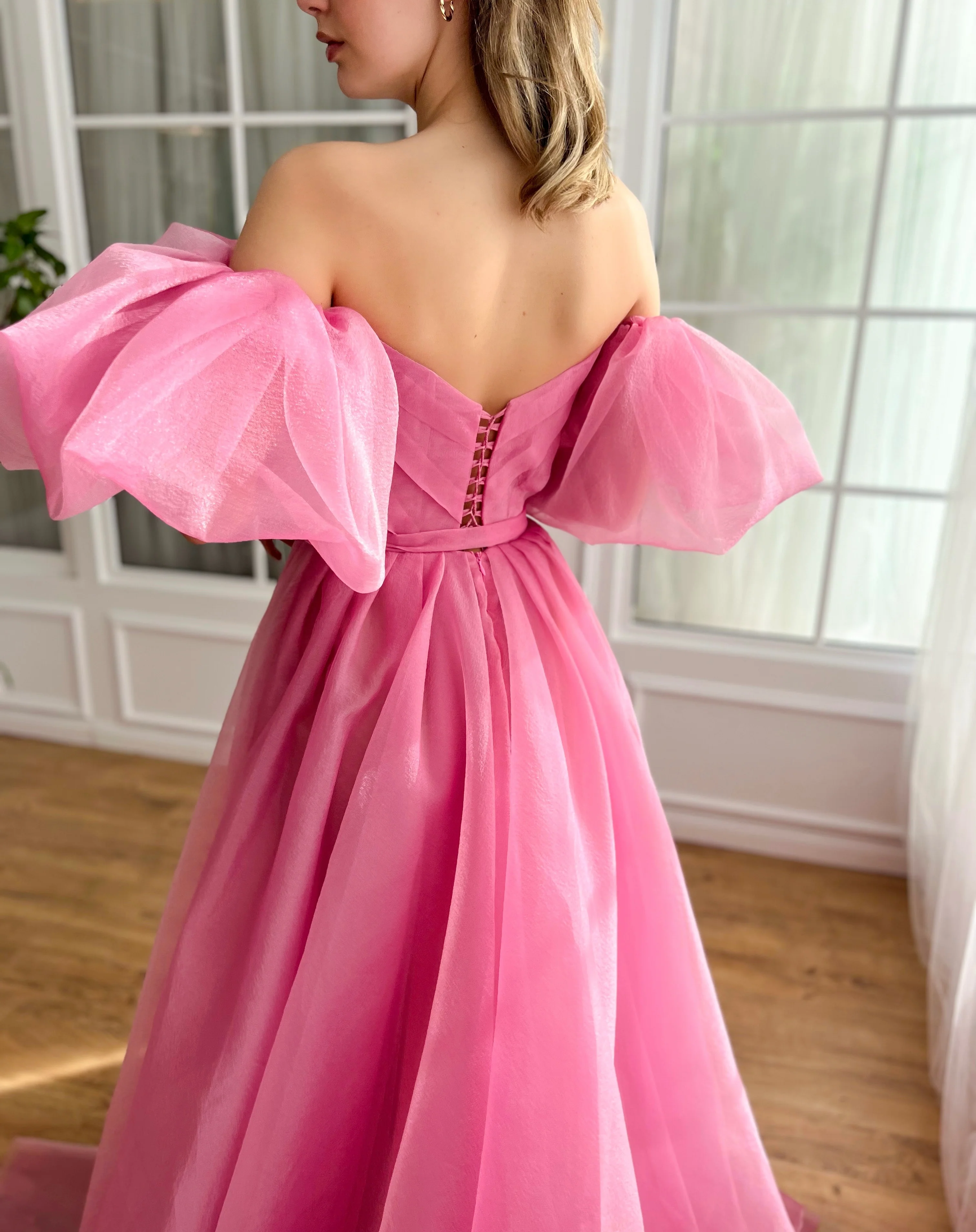 Embrace elegance with our breathtaking floor-length dress, perfectly tinted in a delicate pretty pink hue that captures the essence of femininity. Crafted from sumptuous soft organza fabric, this dress is designed to flatter with a draped wrapped top, complete with boning to enhance your silhouette. The A-line silhouette, paired with medium off-shoulder puffy sleeves, adds a touch of royal grace, while the dramatic train ensures all eyes are on you. Practical yet chic, inseam pockets add a modern twist, and a daring leg slit offers a glimpse of allure. The lace-up back and a captivating bow detail cinching the natural waist elevate this gown to a masterpiece of fashion. Whether you're walking down the aisle or making an entrance at a gala, this dress promises to create unforgettable moments.