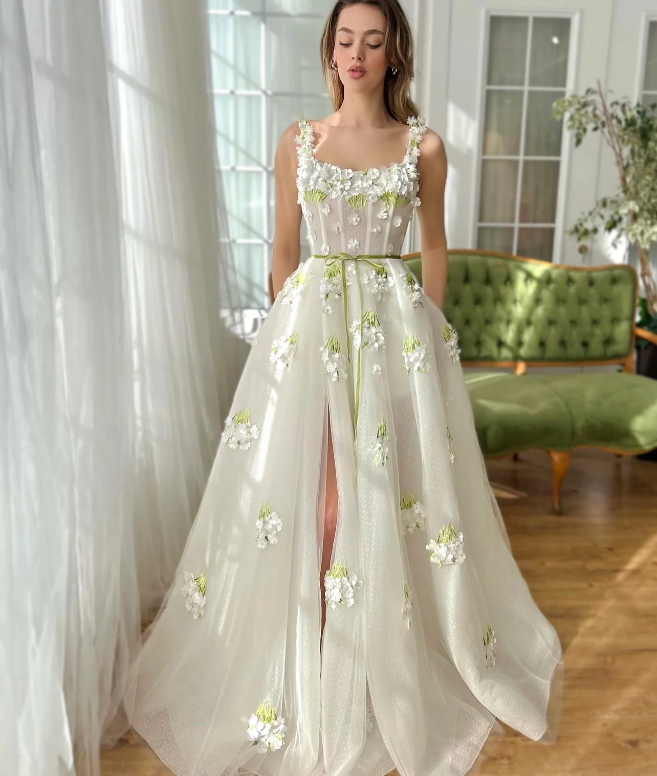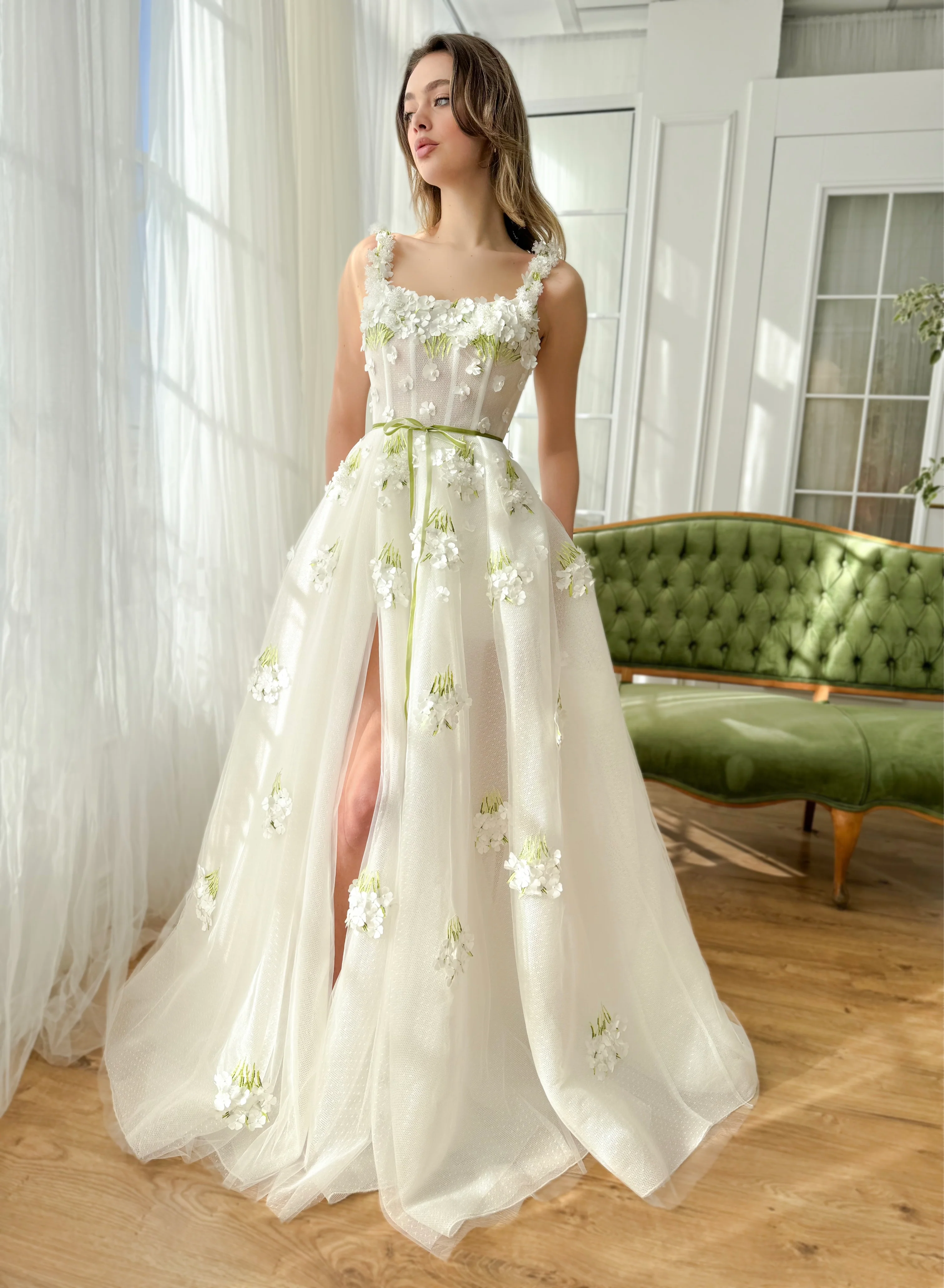 Envelop yourself in the timeless elegance of our ivory white dress, a masterpiece meticulously crafted from delicate mesh/net and dotted tulle fabric, exquisitely adorned with handmade embroidered 3D green and white flowers. This dress features a round neckline, a structured bodice with boning to enhance your silhouette, and an A-Line style that cinches at the waist for definition. Practical yet chic, it comes with inseam pockets and a leg slit for ease of movement. The dress is beautifully finished with a lace-up back and a decorative velvet ribbon belt, adding a touch of sophistication. Underneath, layers of tulle and a mini-skirt provide volume and a playful flair, making this dress perfect for prom, evenings, and any special occasions where making a memorable entrance is a must.
