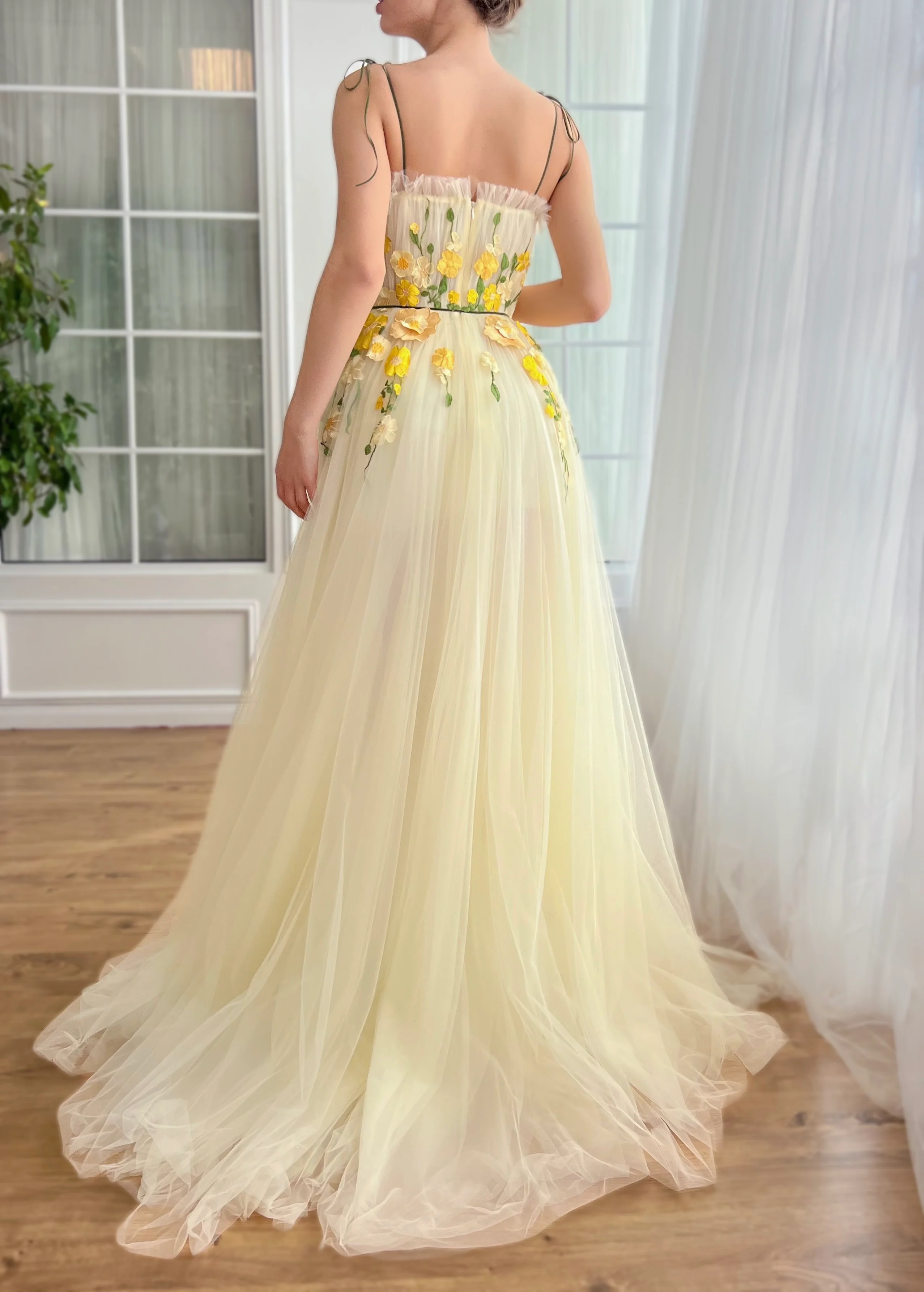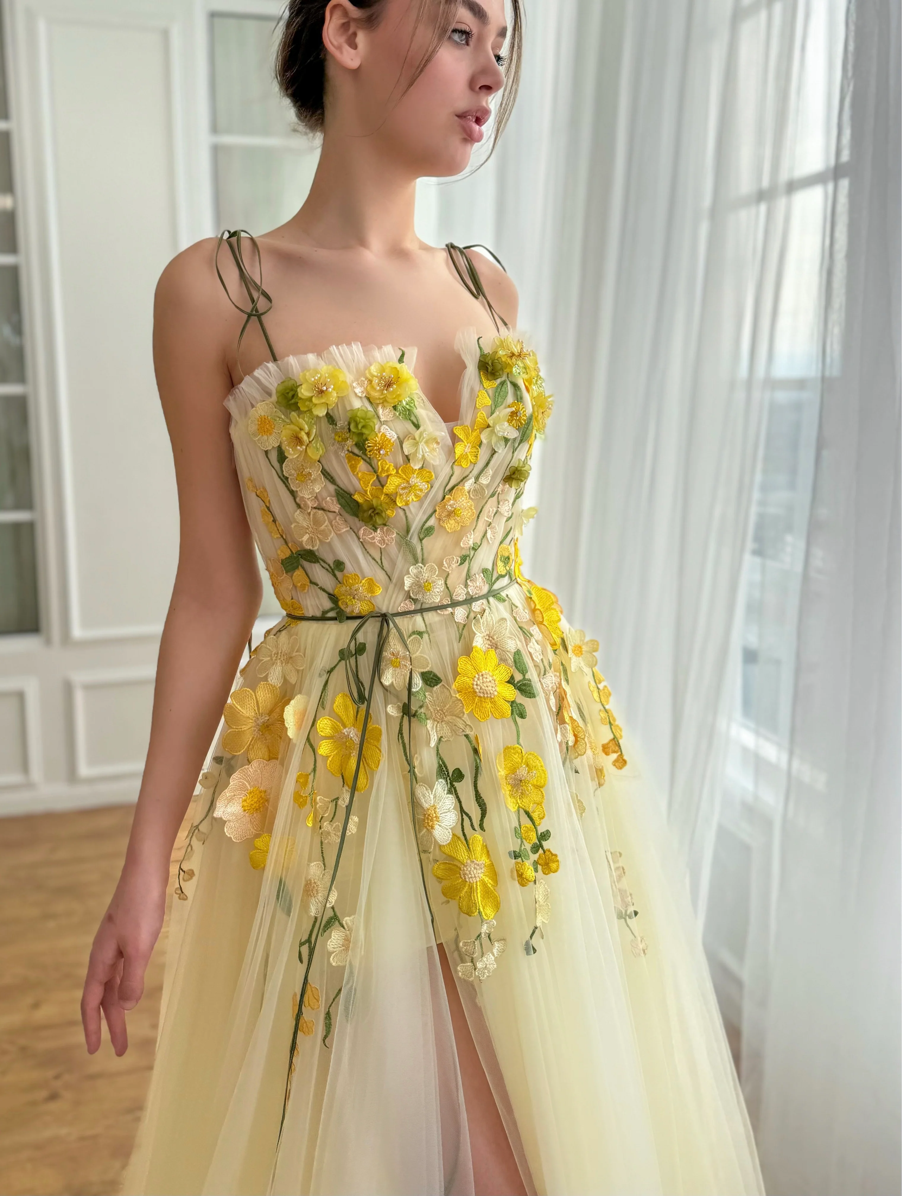 Step into a world of enchantment with our exquisite floral gown, designed for those unforgettable nights of fantasy and whimsy. Cast in a soft light yellow, this dress features intricate embroidered lace adorned with blooming patterns, creating a vision of beauty and elegance. The structured bodice, reinforced with boning, and a cinched waist give way to an A-line silhouette, beautifully complemented by a draped wrap ruffle design that adds a touch of romance. A daring leg slit and practical inseam pockets blend functionality with flair, while the gown's allure is further enhanced by layers of tulle and hidden shorts for added comfort and ease. An invisible zipper secures the dress in place, and the ensemble is completed with decorative matching bow straps and a bow belt, ensuring you look and feel your most enchanting.