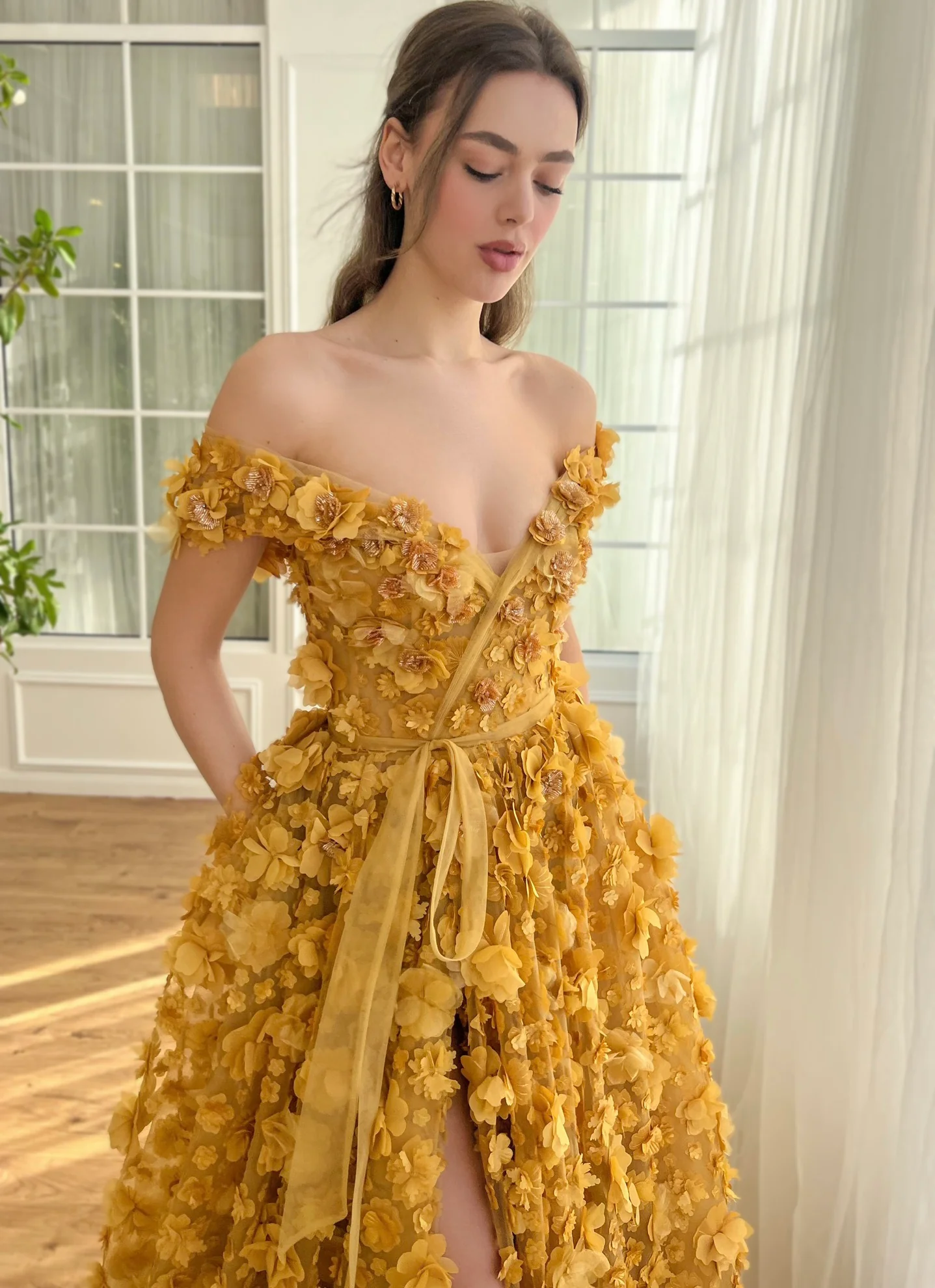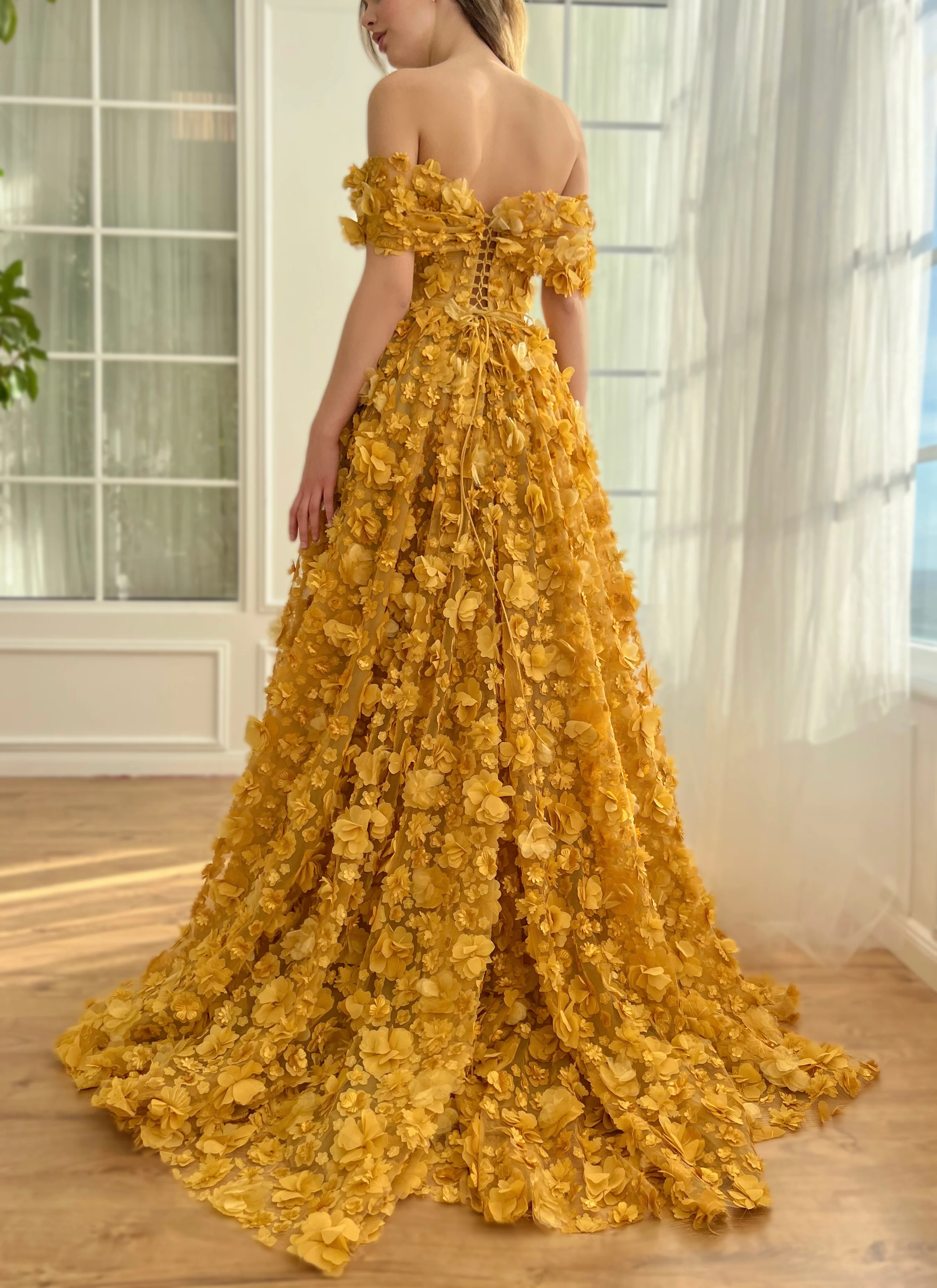 Discover elegance redefined in our honey gold gown, a masterpiece that turns every moment into a whimsical journey. Crafted with exquisitely embroidered lace adorned with embellished flowers, this dress features an off-shoulder neckline and a structured bodice with boning, designed to sculpt and define your silhouette. The A-line shape enhances your waist, flowing into a floor-length skirt with a court train that adds a touch of drama. Thoughtful details like inseam pockets blend functionality with style, while a leg slit and lace-up back infuse a modern allure. Finished with a decorative ribbon belt, this creation is the epitome of beauty and grace.