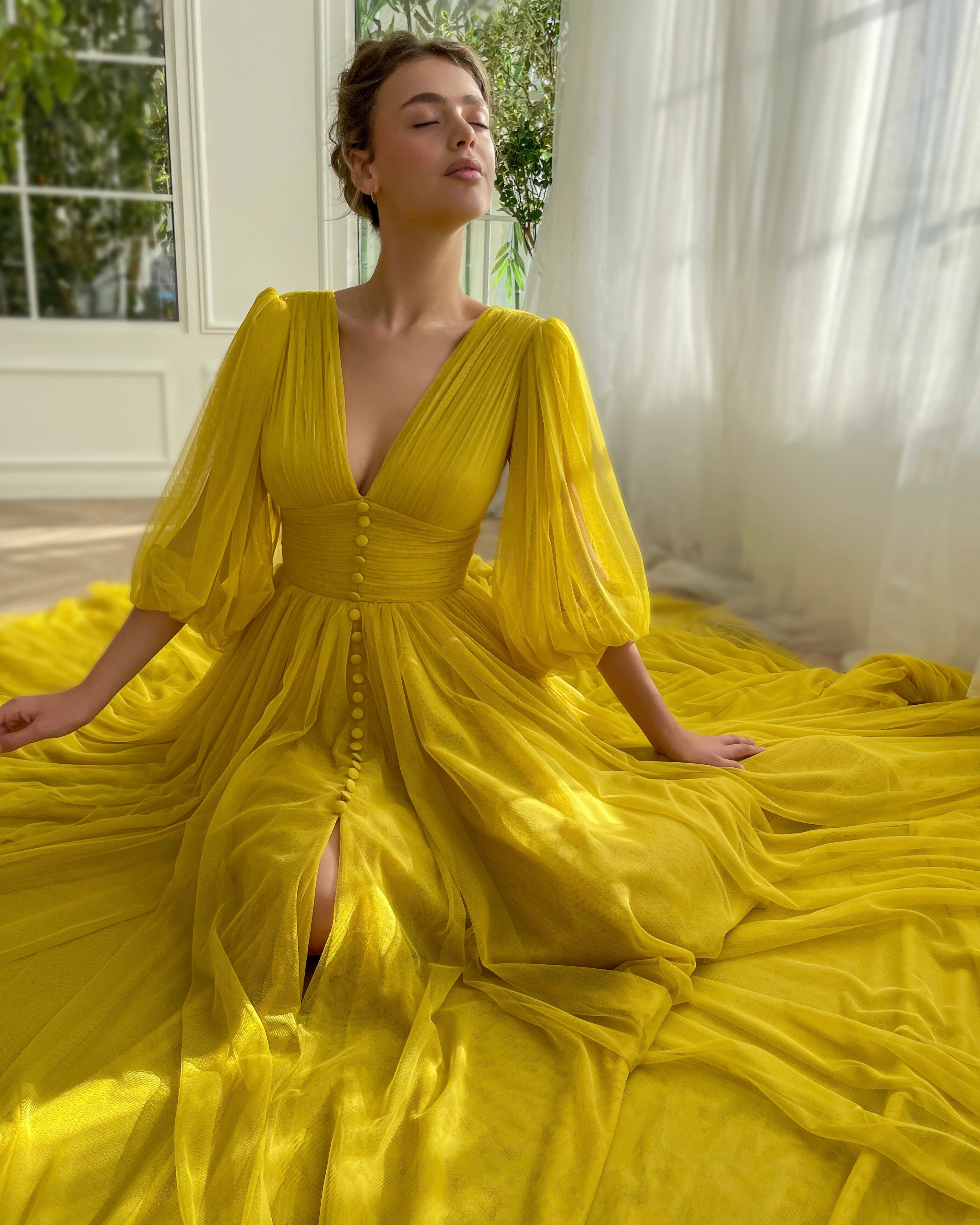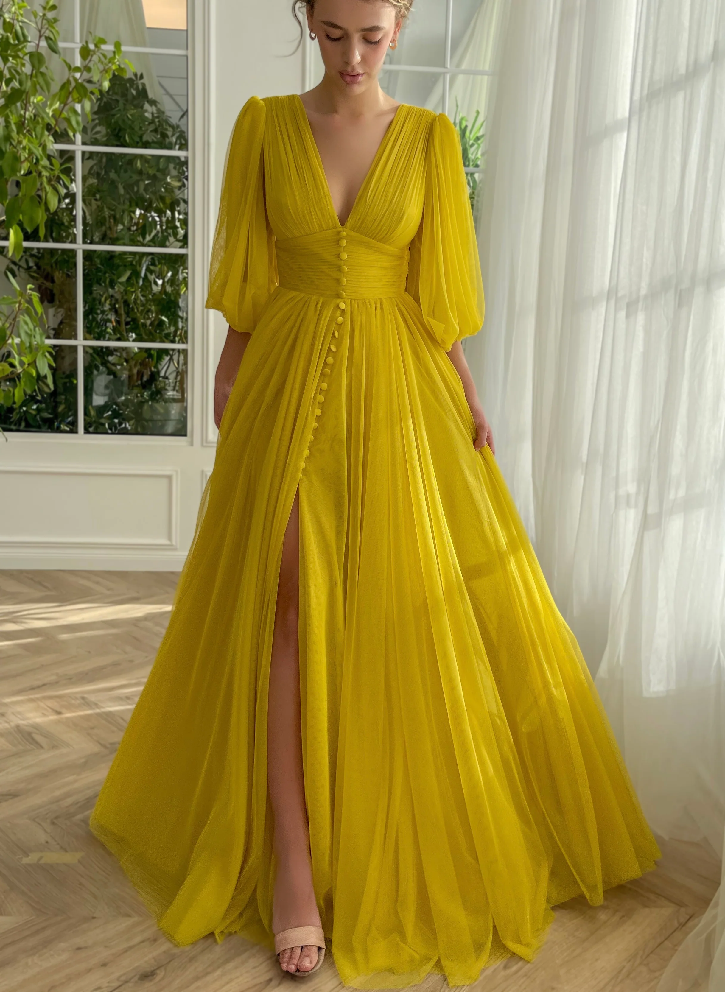 Illuminate your wardrobe with our enchanting dress, dyed in a vibrant Canary Yellow hue that captures the essence of joy and sunshine. Masterfully crafted from luxurious soft lycra tulle fabric, this piece promises both comfort and elegance. The dress features a narrow V-shaped neckline that exudes a touch of grace, while the cinched waist and draped bodice accentuate your figure beautifully. The A-line silhouette is complemented by a tasteful leg slit and decorative buttons, adding a flirtatious flair. Medium puffy sleeves bring a whimsical element, and the practical addition of inseam pockets blends functionality with fashion. A zipper-back closure ensures a seamless fit. Perfect for any occasion, this dress is your go-to for looking effortlessly chic.