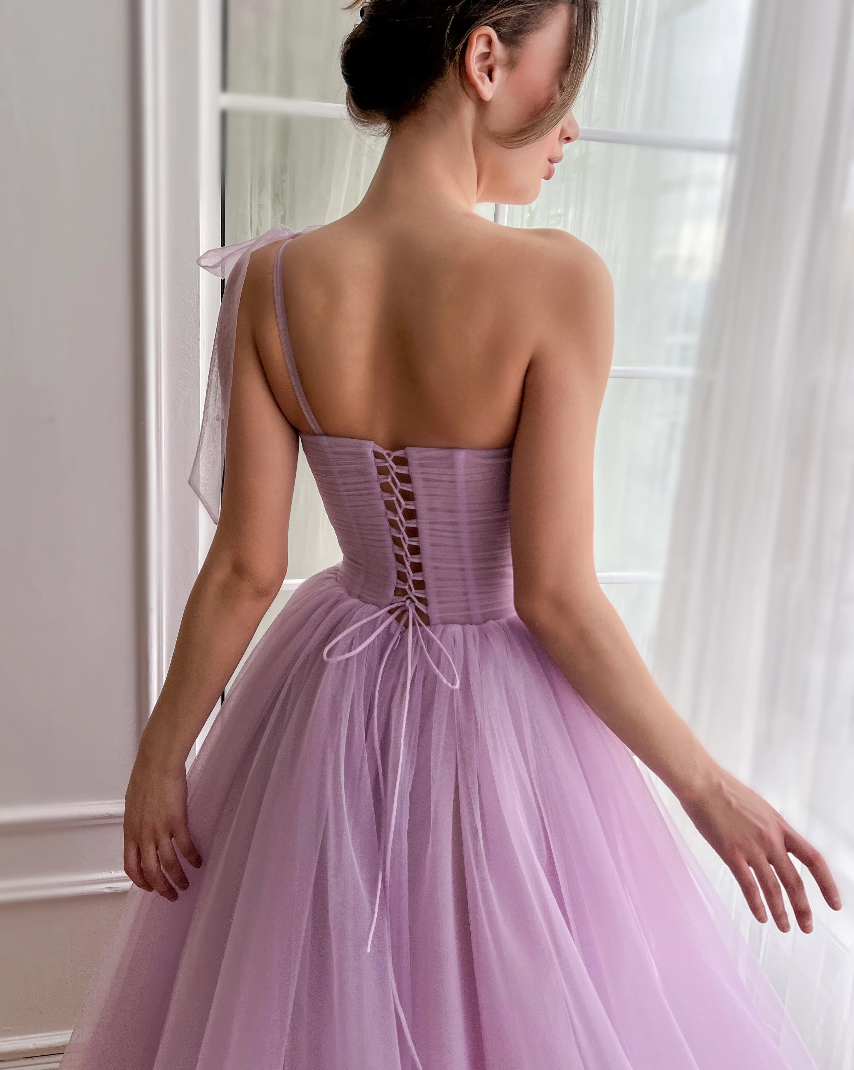 Step into a world of ethereal elegance with our pastel violet midi dress, designed for those who appreciate the fine art of dressing. This masterpiece is crafted from soft tulle, adorned with delicately embroidered crystal flowers in bloom, accented by pale sage green leaves that add a touch of nature's tranquility. The dress features an asymmetric one-shoulder bow strap, a beautifully draped wrap bodice, and a gracefully gathered skirt, all cinching at the waist to sculpt a flattering silhouette. The midi-length style is both timeless and modern, while inseam pockets add a blend of functionality and charm. A lace-up back completes the look, ensuring a perfect fit and adding an element of surprise. Perfect for special occasions or whenever you want to feel extraordinary, this dress is a celebration of beauty and grace.