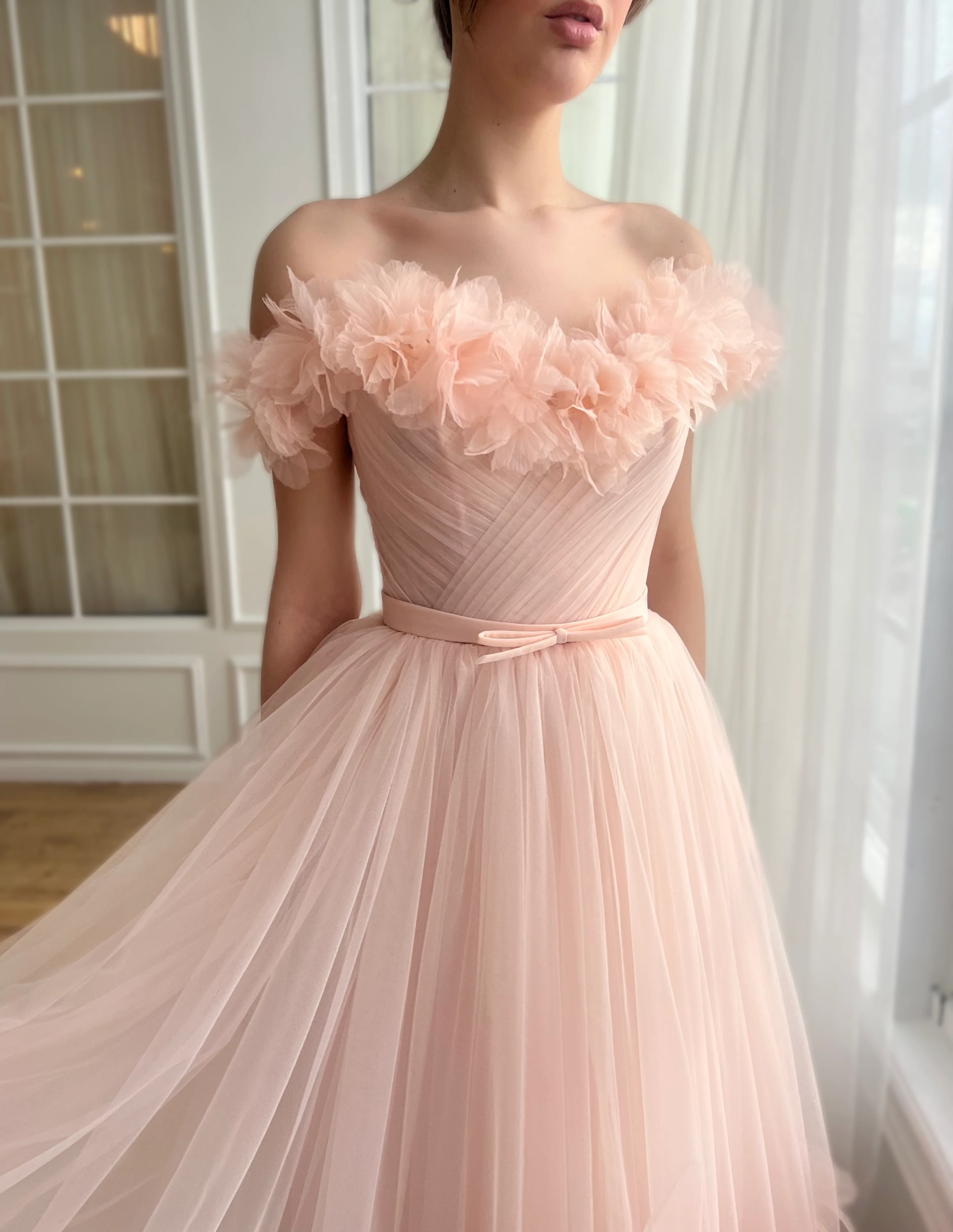 Elevate your occasion wear with our enchanting pale peach tulle midi dress. Crafted to captivate, this dress features an elegant off-shoulder design adorned with delicate handmade embroidered flowers, exuding timeless romance. The draped wrap bodice, enhanced with a structured corset and boning, cinches the waist for a flattering silhouette, while a decorative bow belt adds a touch of charm. With inseam pockets and layers of tulle underneath for volume, this midi-length masterpiece is both practical and enchanting. The lace-up back detail ensures a customized fit, making it a standout choice for special events and cherished celebrations.