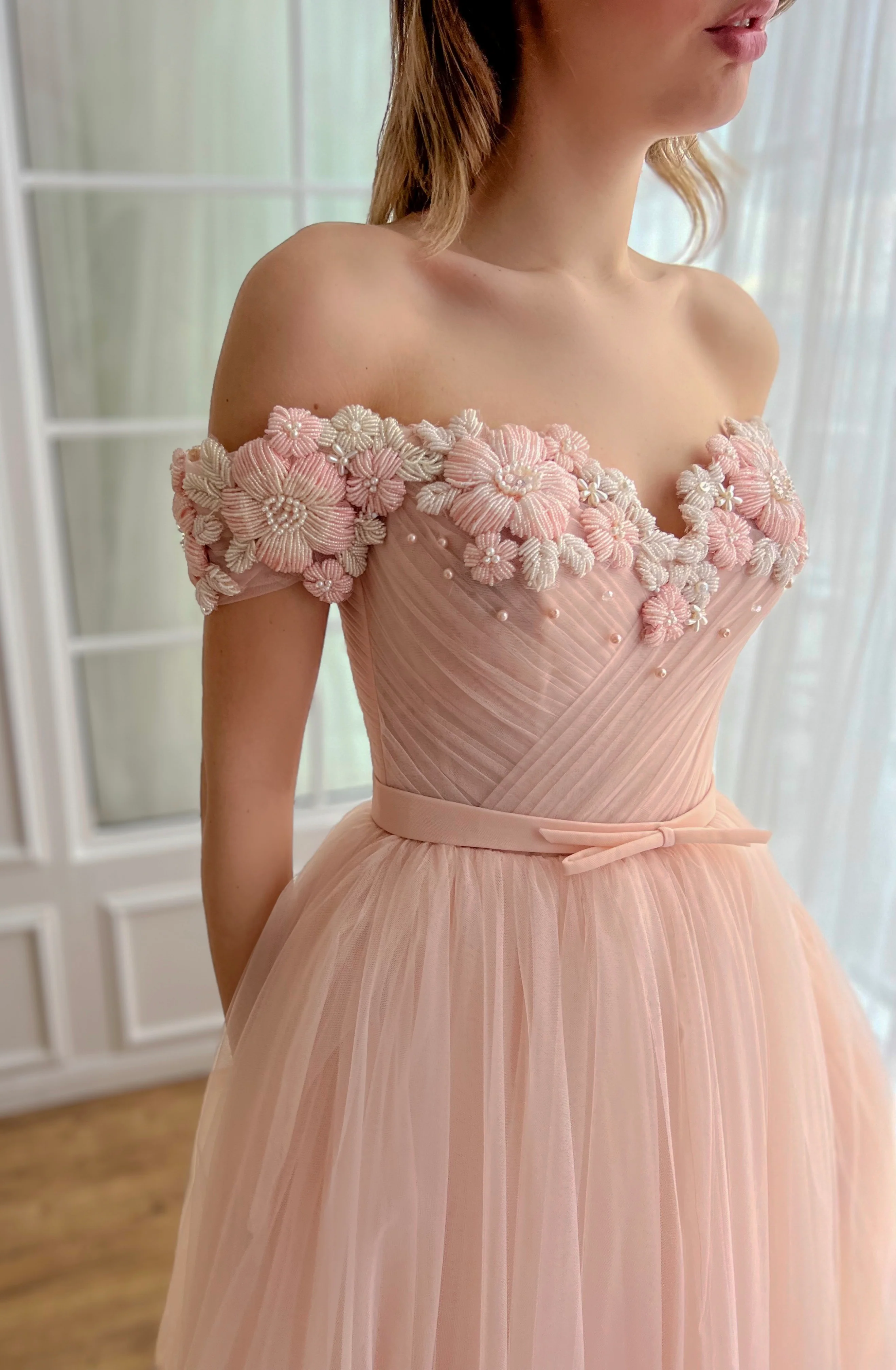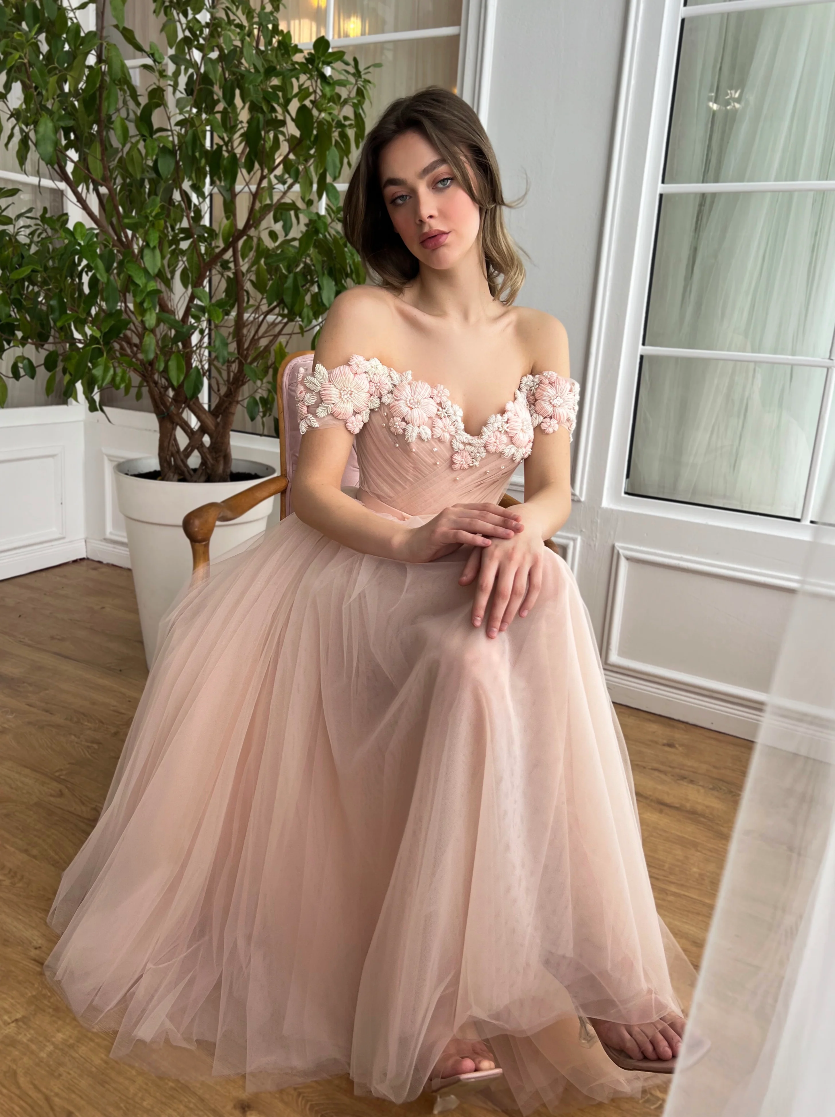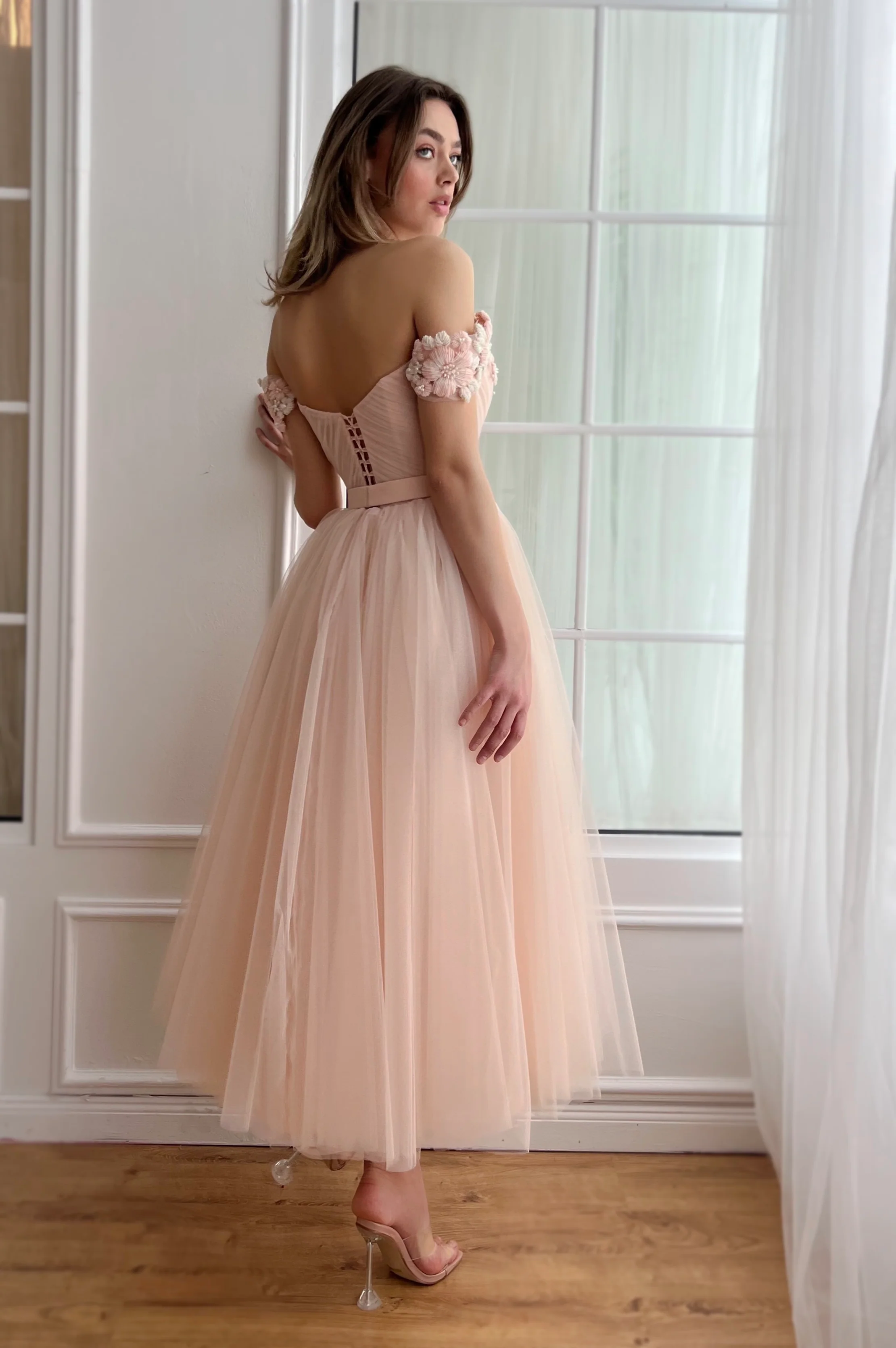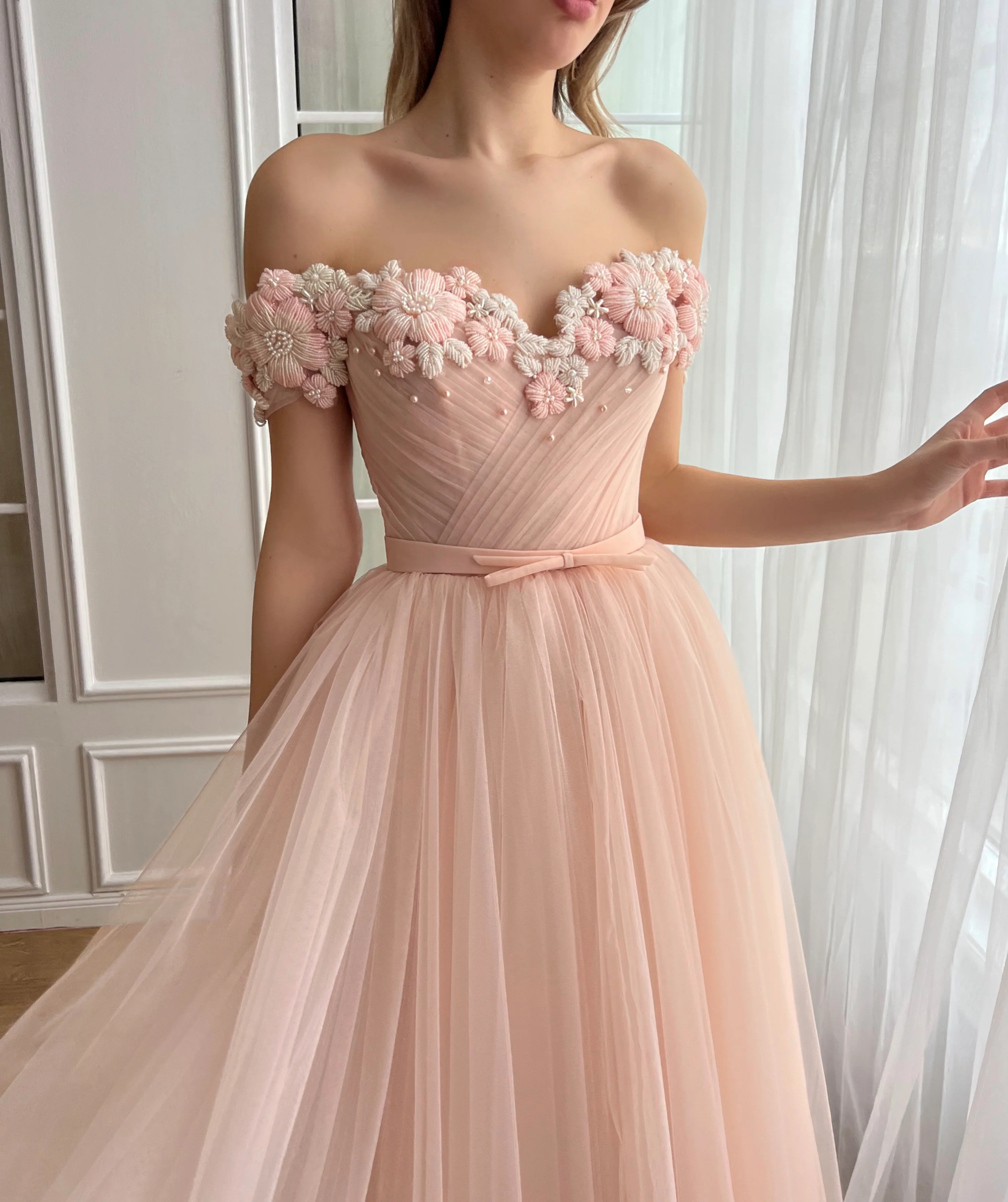 Embrace ethereal elegance with this pale peach tulle midi creation, a testament to delicate sophistication. The off-shoulder silhouette is adorned with intricately embroidered flowers, each petal embellished with tiny pearls, evoking enchanting beauty. Featuring a draped wrap bodice with structured corset and boning, it cinches at the waist, enhanced by a decorative bow belt. Practical yet chic, it includes inseam pockets and is designed in a midi-length style, with layers of tulle underneath for added volume. The lace-up back ensures a flawless fit, making this piece an exquisite choice for special occasions, where its wearer is destined to shine.