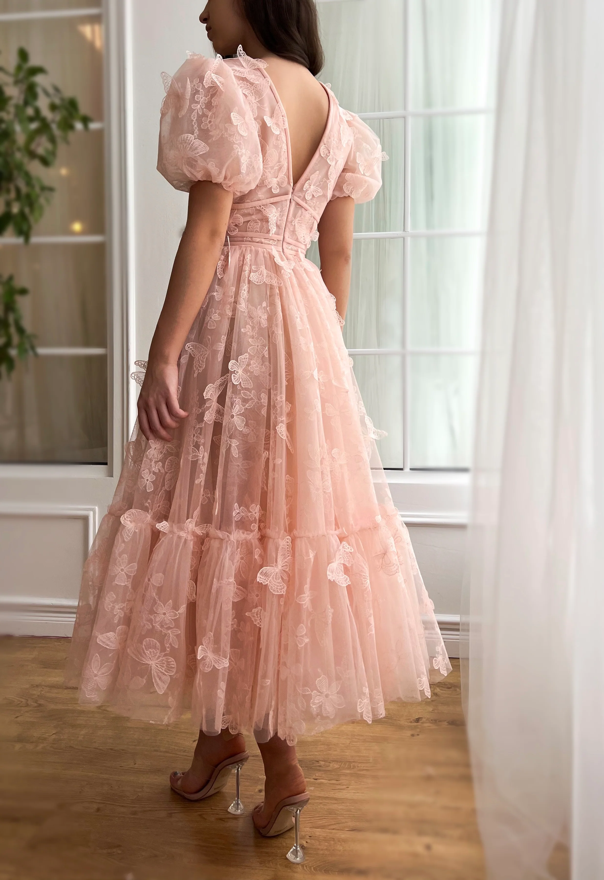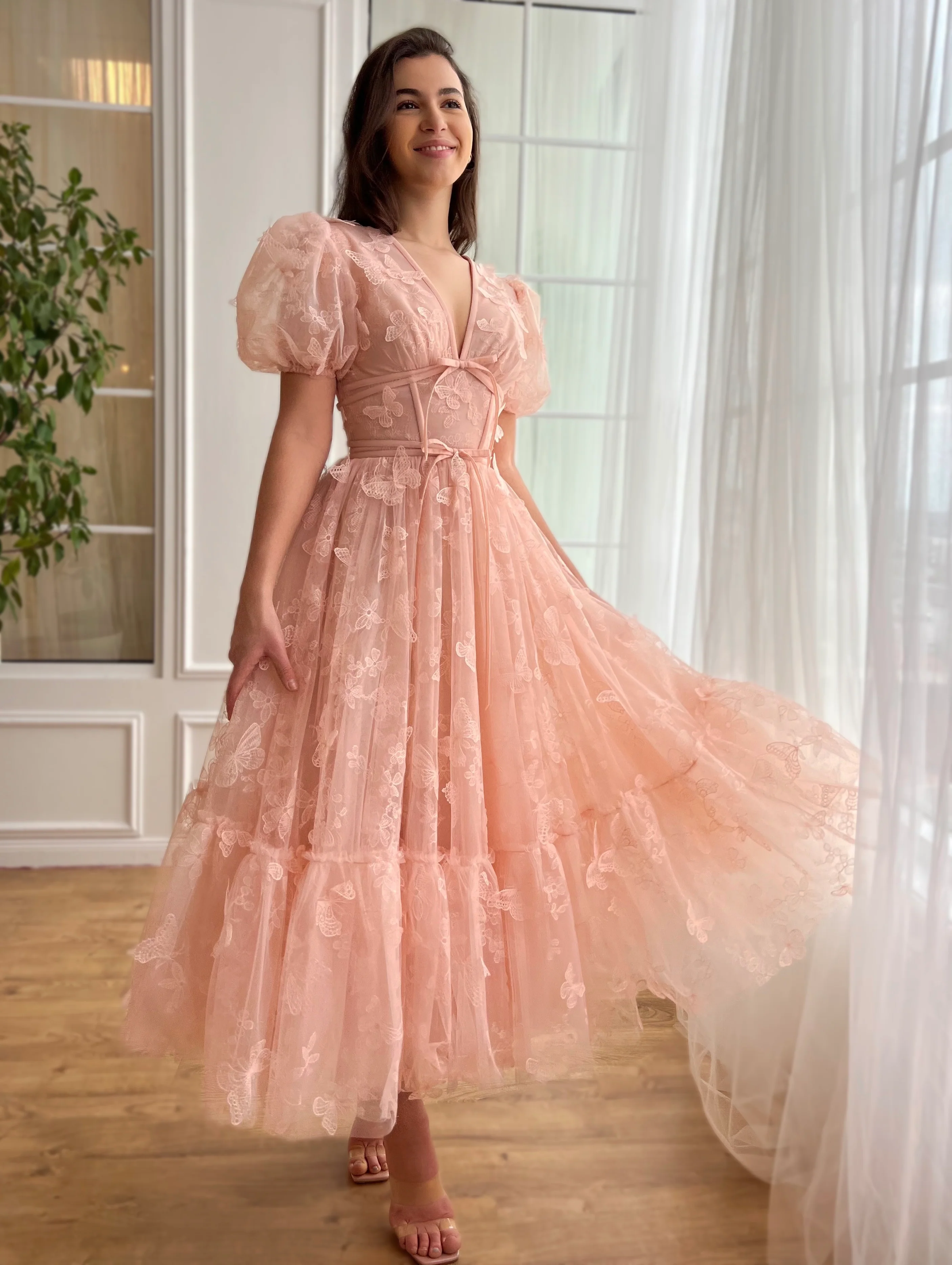 Embrace the essence of spring with our enchanting midi dress, meticulously crafted from the finest rosette lace. This piece dazzles with its intricate butterfly embroidery, offering a vivid three-dimensional allure that adds both texture and depth. Designed with an elegant, narrow V-shaped neckline and a figure-flattering cinched waist, the dress is both sophisticated and feminine. Decorative double bow details and short puffy sleeves enhance its charm, while the gathered hem adds a graceful flow. Practical yet stylish, it features inseam pockets and a convenient zipper-back closure, marrying functionality with high fashion. Perfect for any occasion, this dress is a testament to timeless elegance and artful craftsmanship.