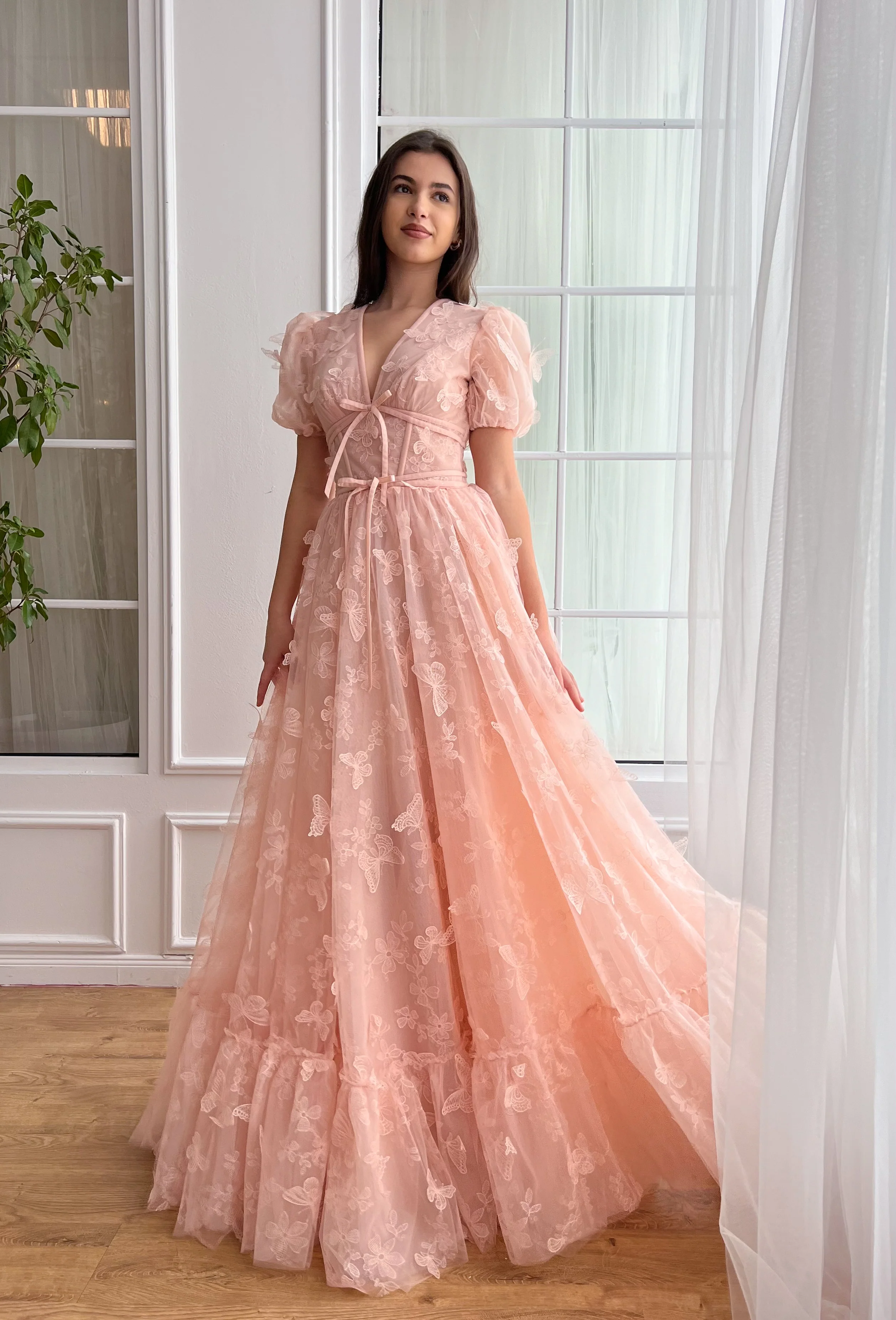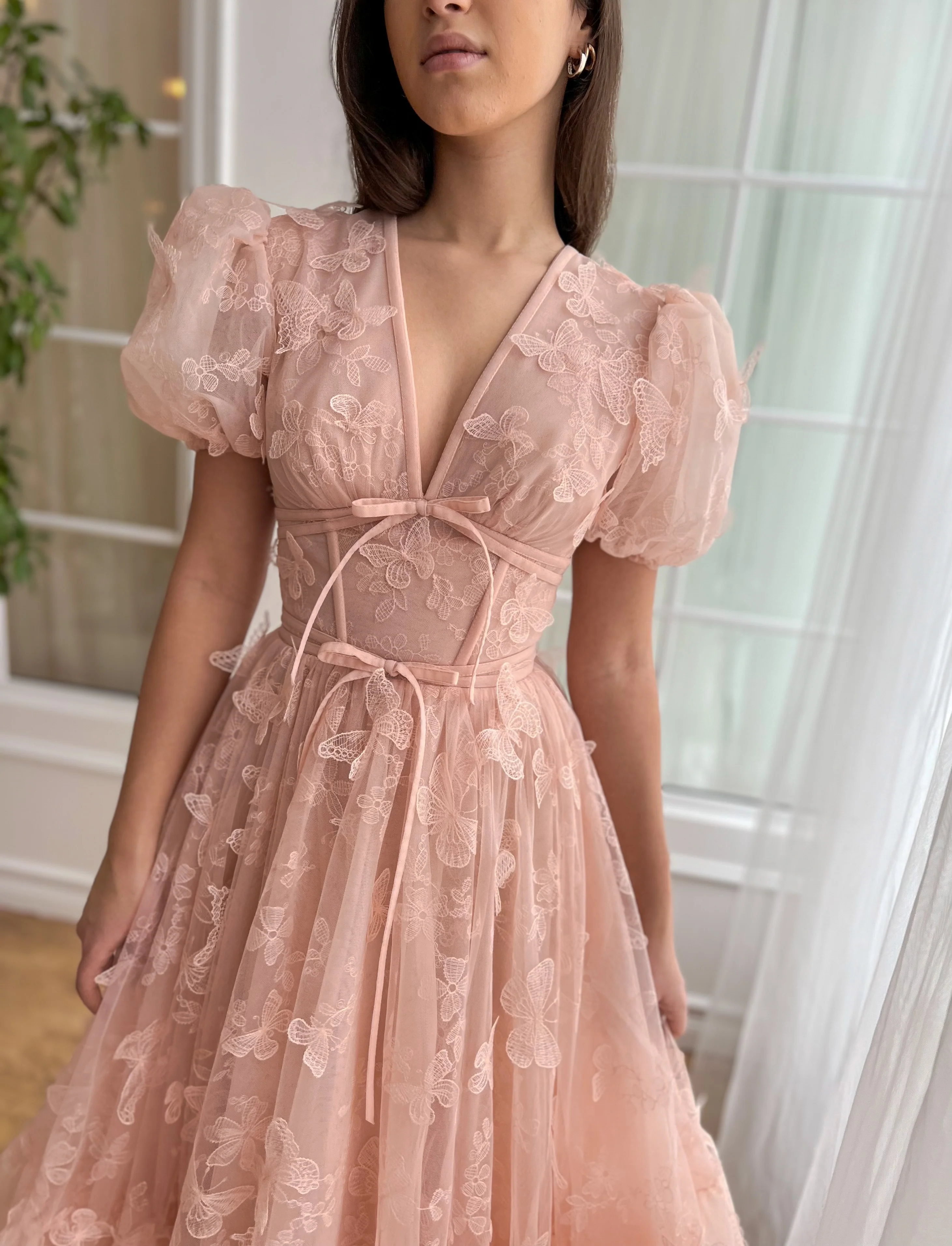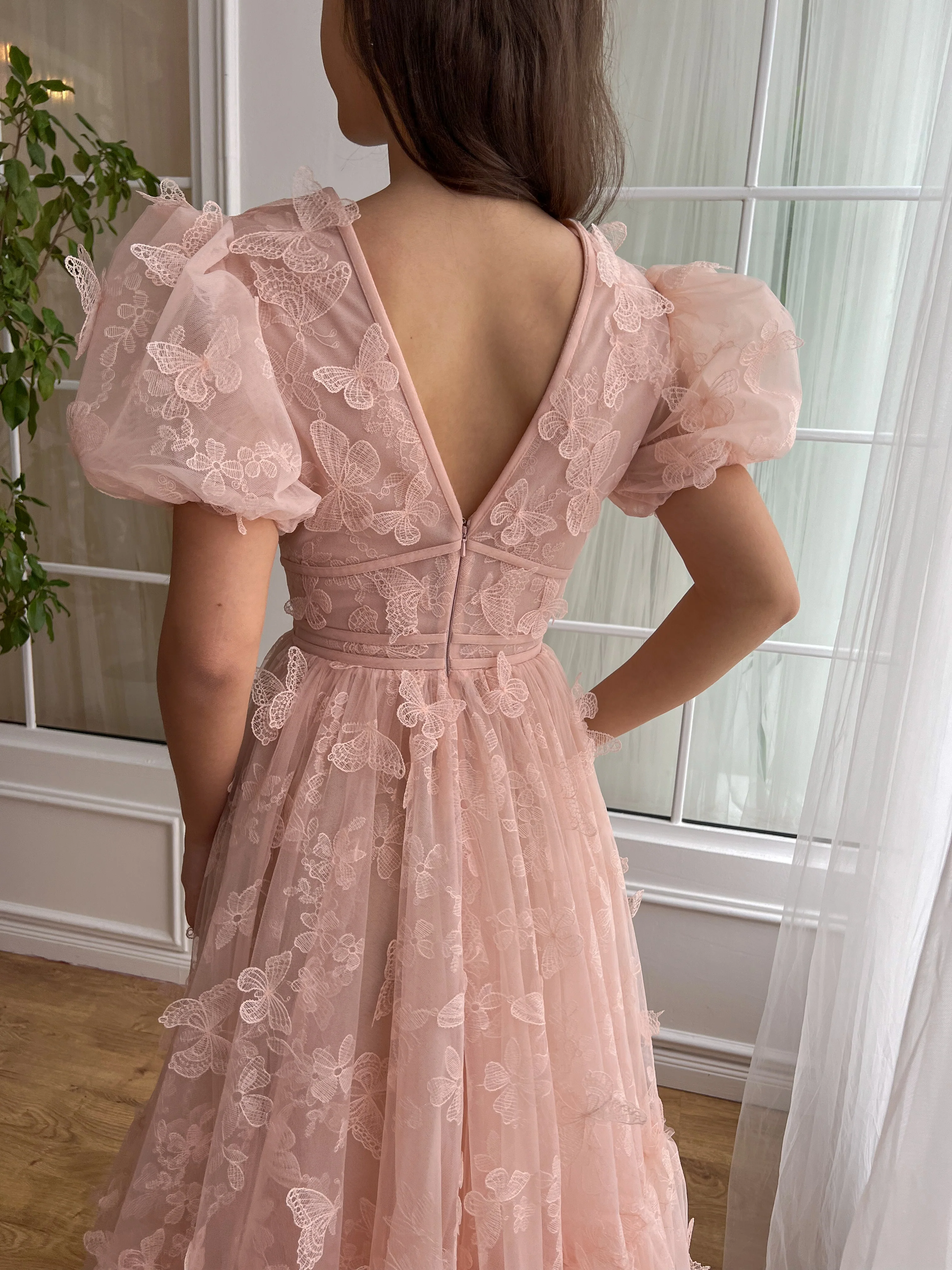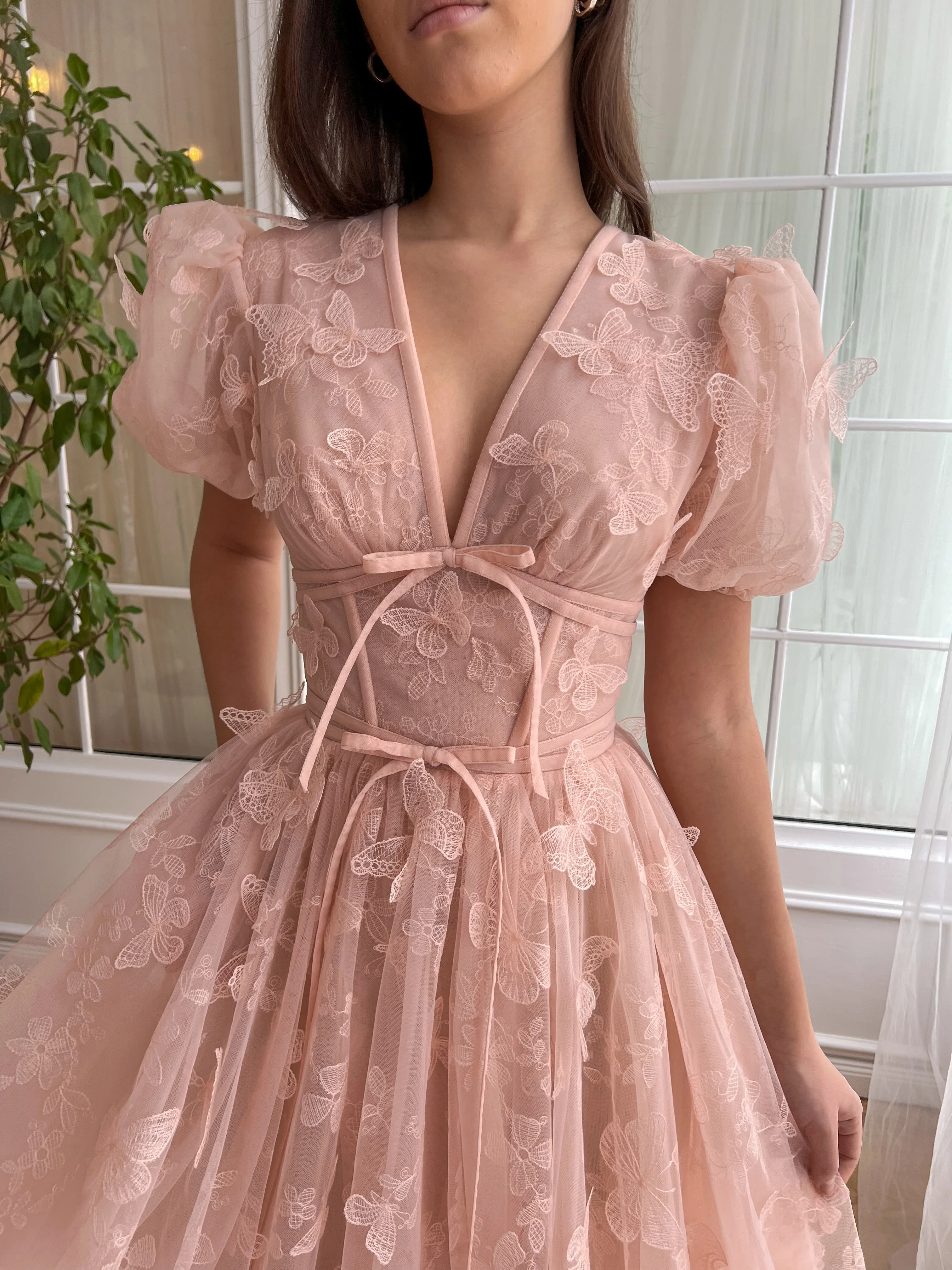 Experience the epitome of spring's rebirth with this exquisite dress, meticulously crafted from the finest rosette lace to embody sheer elegance. Each stitch of its intricate butterfly embroidering adds a three-dimensional allure, offering both texture and a delightful depth that captures the essence of spring. The dress features an elegant, narrow V-shaped neckline and a cinched waistline, accentuated by decorative double bow details, that effortlessly transitions into a flattering A-line silhouette. Short puffy sleeves add a touch of whimsy, while the gathered hem completes the piece with a graceful flow. A discreet zipper-back closure ensures a seamless fit, making this dress a perfect blend of sophistication and charm.