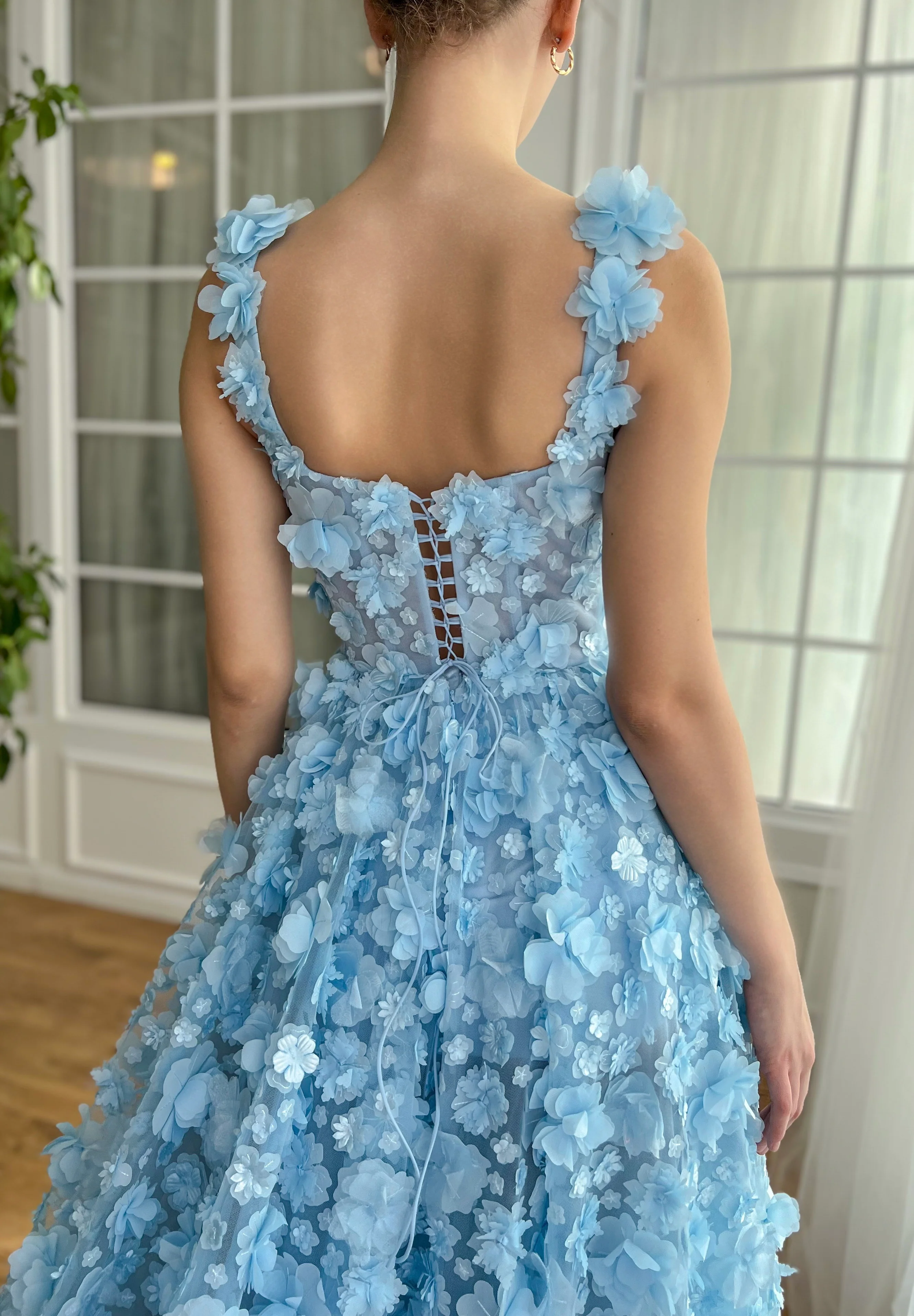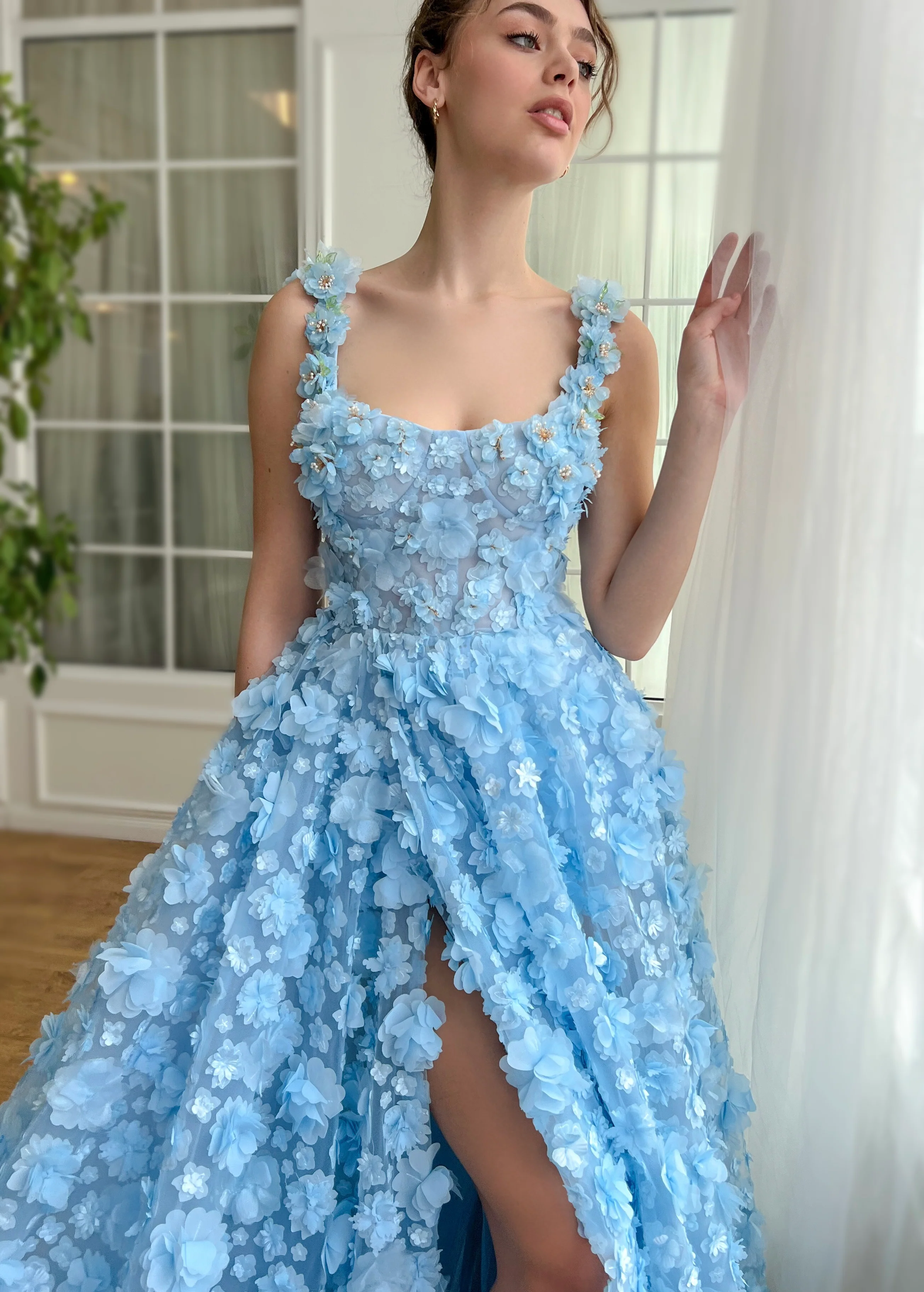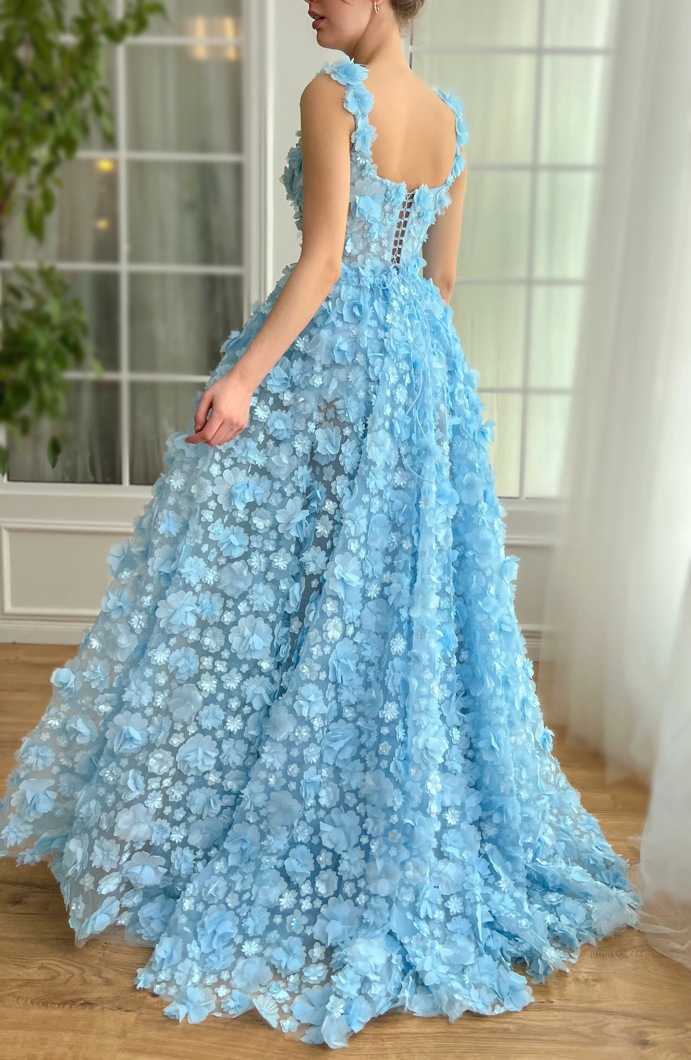 Step into a realm of enchanting elegance with this floor-length dress, draped in a mesmerizing crystal blue hue. Expertly crafted from high-quality fabric, this piece showcases a stunning three-dimensional texture that adds depth and allure. The dress features a romantic sweetheart neckline and a structured bodice equipped with built-in pads and boning, ensuring a flattering and supportive fit. A cinched waist flows into a graceful A-line silhouette, accentuated by a leg slit and a sweeping train for a dramatic flair. Function meets fashion with cleverly hidden inseam pockets and a comfortable pair of shorts beneath layers of billowing tulle. Exquisitely adorned with embellished blossom-shoulder straps, each showcasing delicate floral appliqués, this gown is a true work of art. The finishing touch is a lace-up back detail, adding a hint of classic charm and adjustability. Perfect for those who seek to captivate and enchant at any upscale event, this dress promises a grand entrance and a lasting impression.