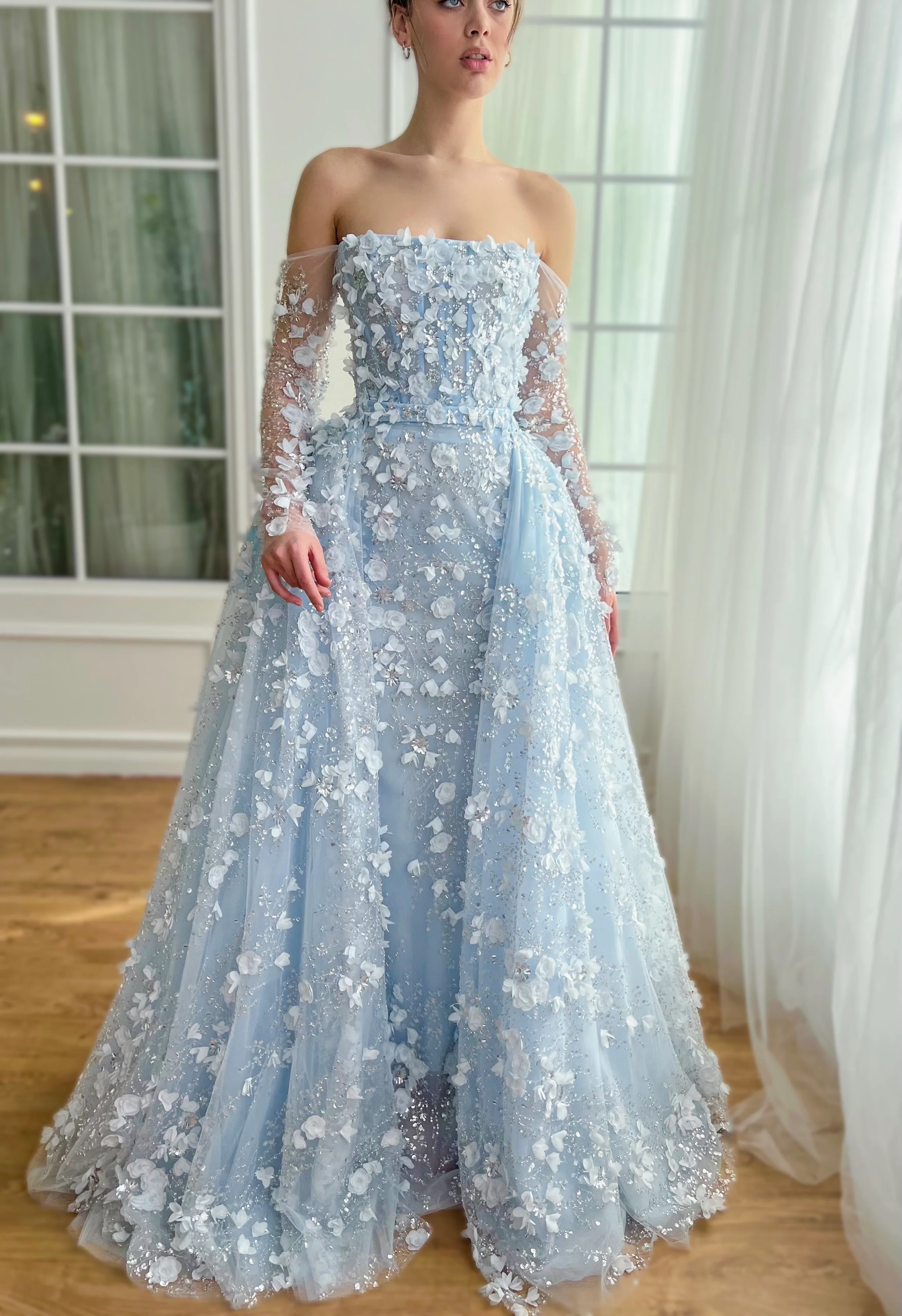Elevate your evening with the enchanting allure of our baby blue dress, meticulously crafted from luxurious embroidered lace that blooms in an intricate floral design. The fitting bodice features expertly placed boning to accentuate your silhouette, leading to an elegant off-shoulder neckline that promises a touch of romance. The cinched waist transitions into a striking mermaid silhouette, complete with a dramatic train and an optional overlay skirt that adds a layer of ethereal charm. This floor-length gown is underlined for comfort and finished with a lace-up back that ensures a perfect fit. Adorned with handmade embroidered flowers, this dress is a masterpiece of design and craftsmanship, ideal for making a memorable entrance at any sophisticated affair.
