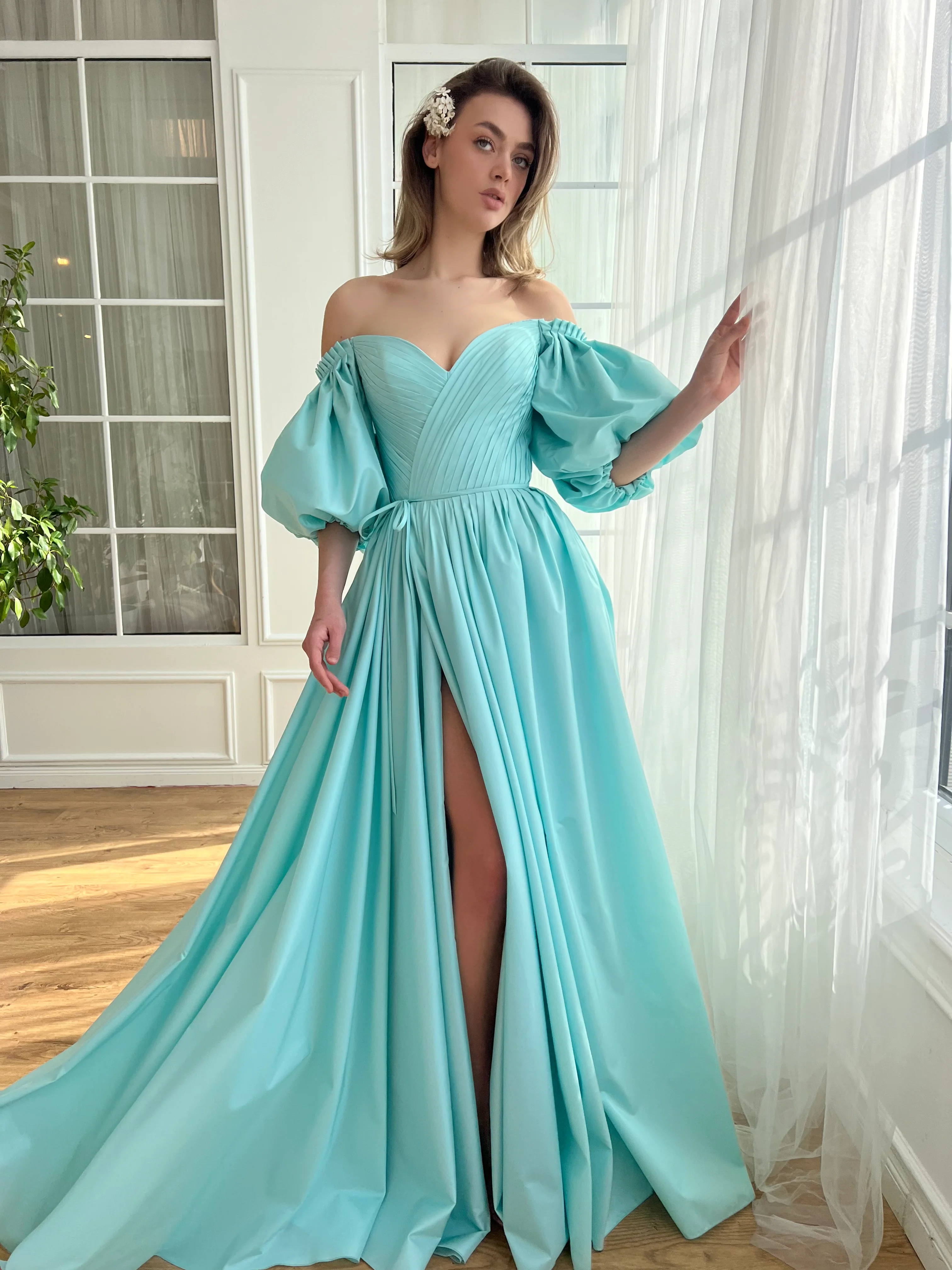 Step into elegance with our Aqua Taffeta Gown, a masterpiece designed to dazzle at any gala or ball. This stunning dress features a sweetheart off-shoulder neckline and a beautifully wrapped top adorned with boning, draping, and intricate pleating, creating a sophisticated and structured look. The A-line silhouette gracefully flows into a dramatic floor-length train, adding a touch of regal flair. For added functionality and a modern twist, the gown includes discreet inseam pockets and a daring leg slit. The lace-up back ensures a perfect fit, while medium pleated puffy sleeves add a romantic touch. A decorative bow at the waist, perfectly aligned with the leg slit, completes this enchanting ensemble, making it a must-have for any luxurious wardrobe.