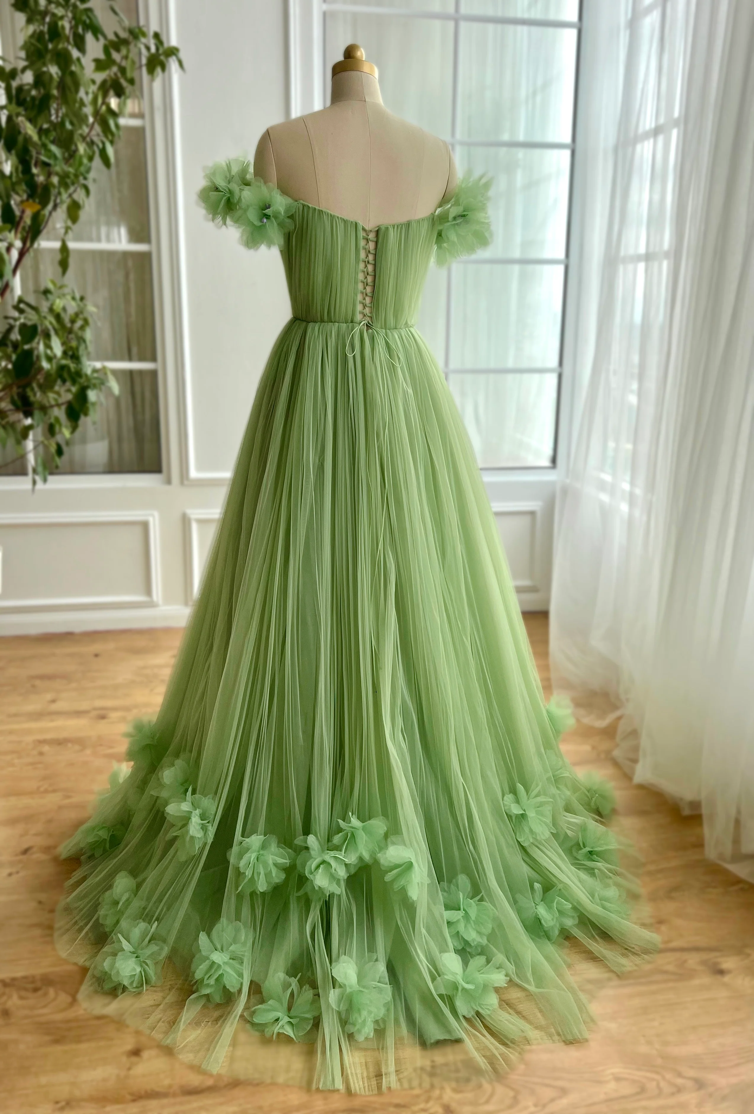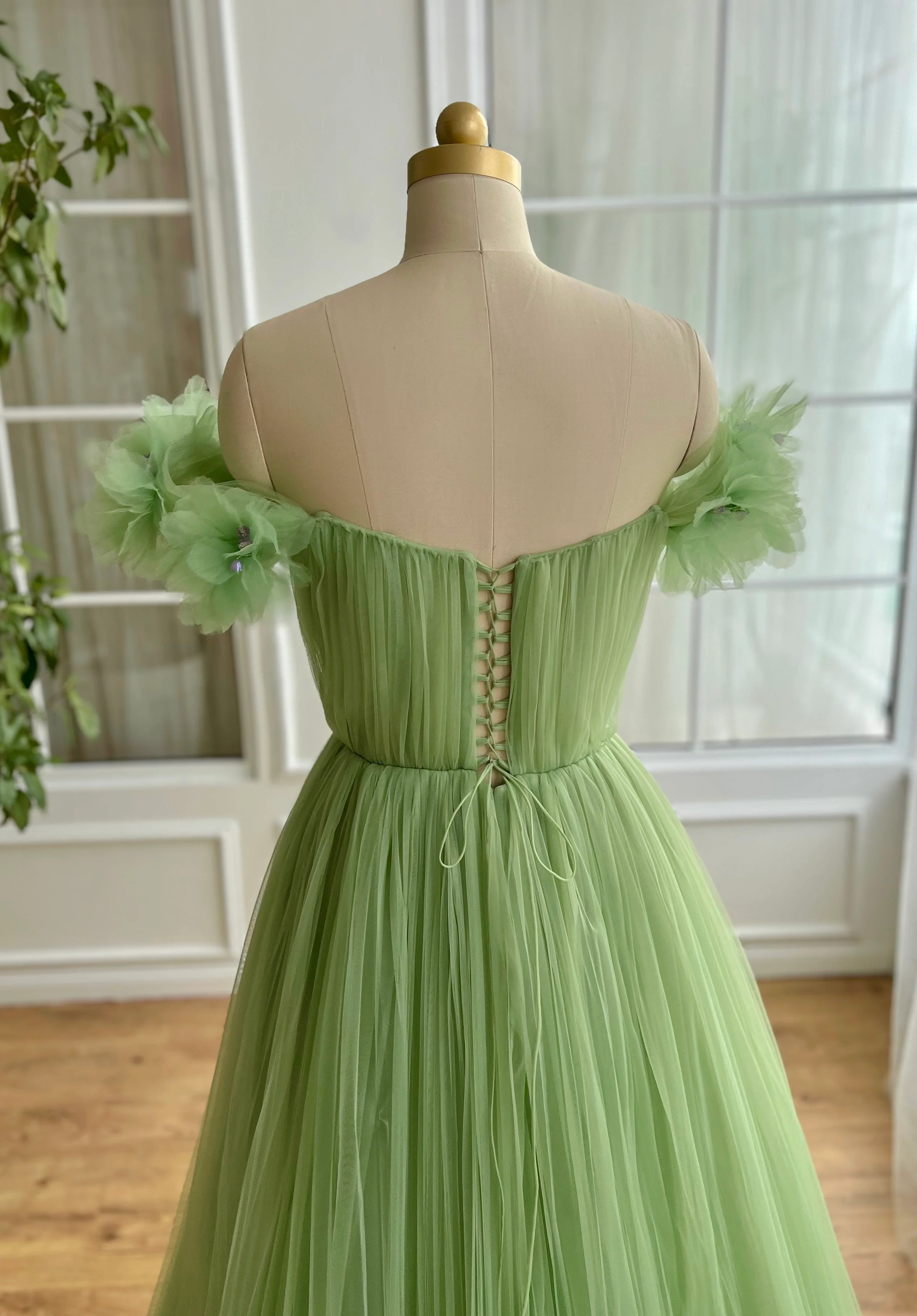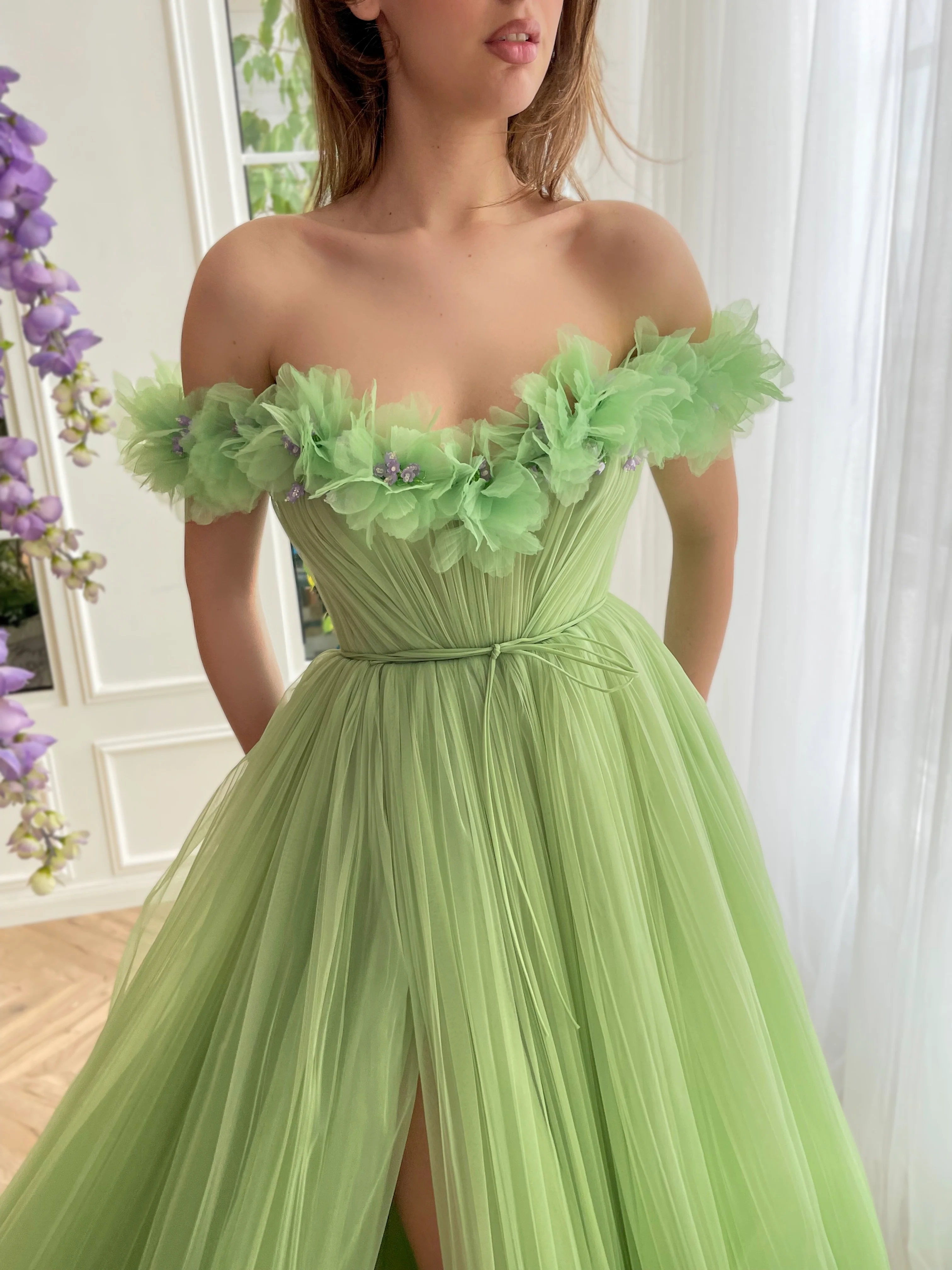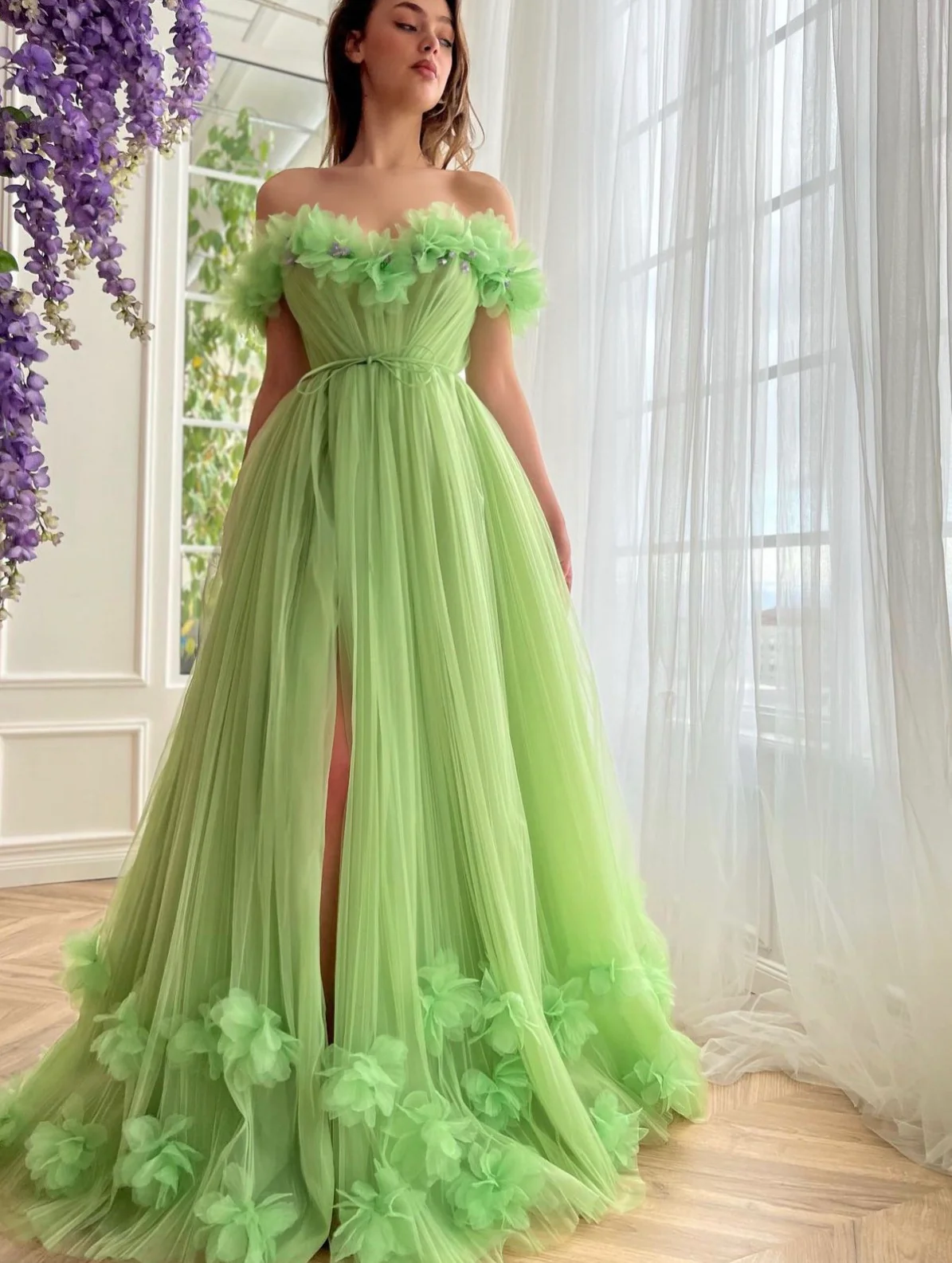 Embrace elegance with this exquisite pastel pea green tulle dress, designed to captivate at any special occasion. Featuring an alluring off-shoulder neckline and a draped bodice, this piece is structured with a fully boned corset for a classic, figure-enhancing silhouette. Delicate handmade embroidered flowers adorned with crystal lavender embellishments add a touch of enchantment. The cinched waist is beautifully accentuated by a decorative double bow belt, leading to a gracefully flowing A-line skirt with a subtly designed bottom and a daring leg slit. Functional inseam pockets add a modern twist. The lace-up back ensures a customizable, perfect fit, making this dress a flawless choice for soirées, proms, and beyond.