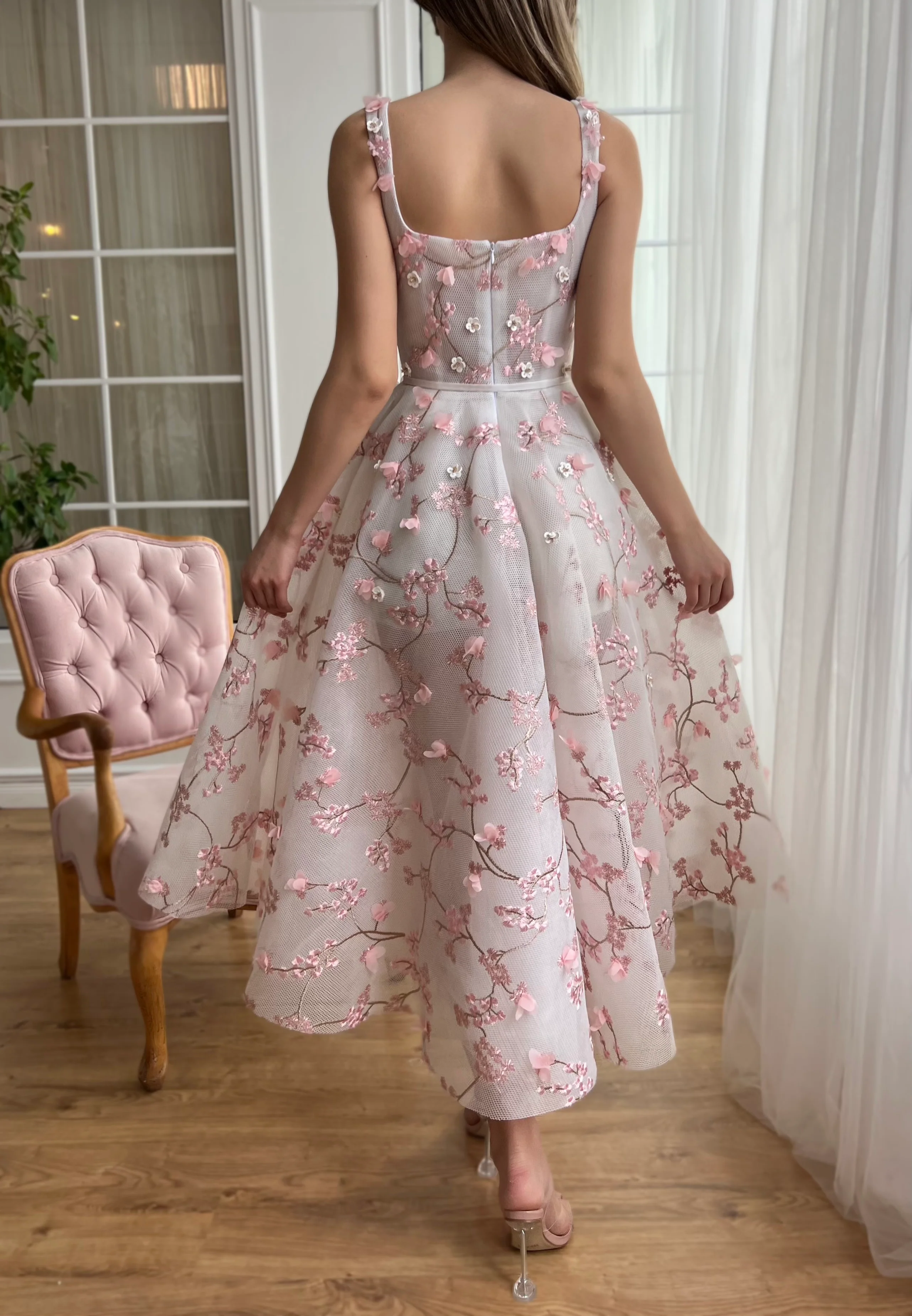 Experience the allure of springtime with our cherry blossom-inspired midi dress. This exquisite piece is crafted from delicate mesh fabric featuring 3D embroidered crystal flowers that capture the fleeting beauty of cherry blossoms. Designed with a flattering round neckline and a cinched waist accented by an elegant ivory bow belt, this dress combines sophistication with whimsy. Practical inseam pockets and a chic mini-skirt lining beneath the midi-length overlay add functionality and a touch of surprise. The zipper-back closure ensures a seamless fit. Ideal for spring weddings, garden parties, or any formal event, this dress is a celebration of both style and the season.
