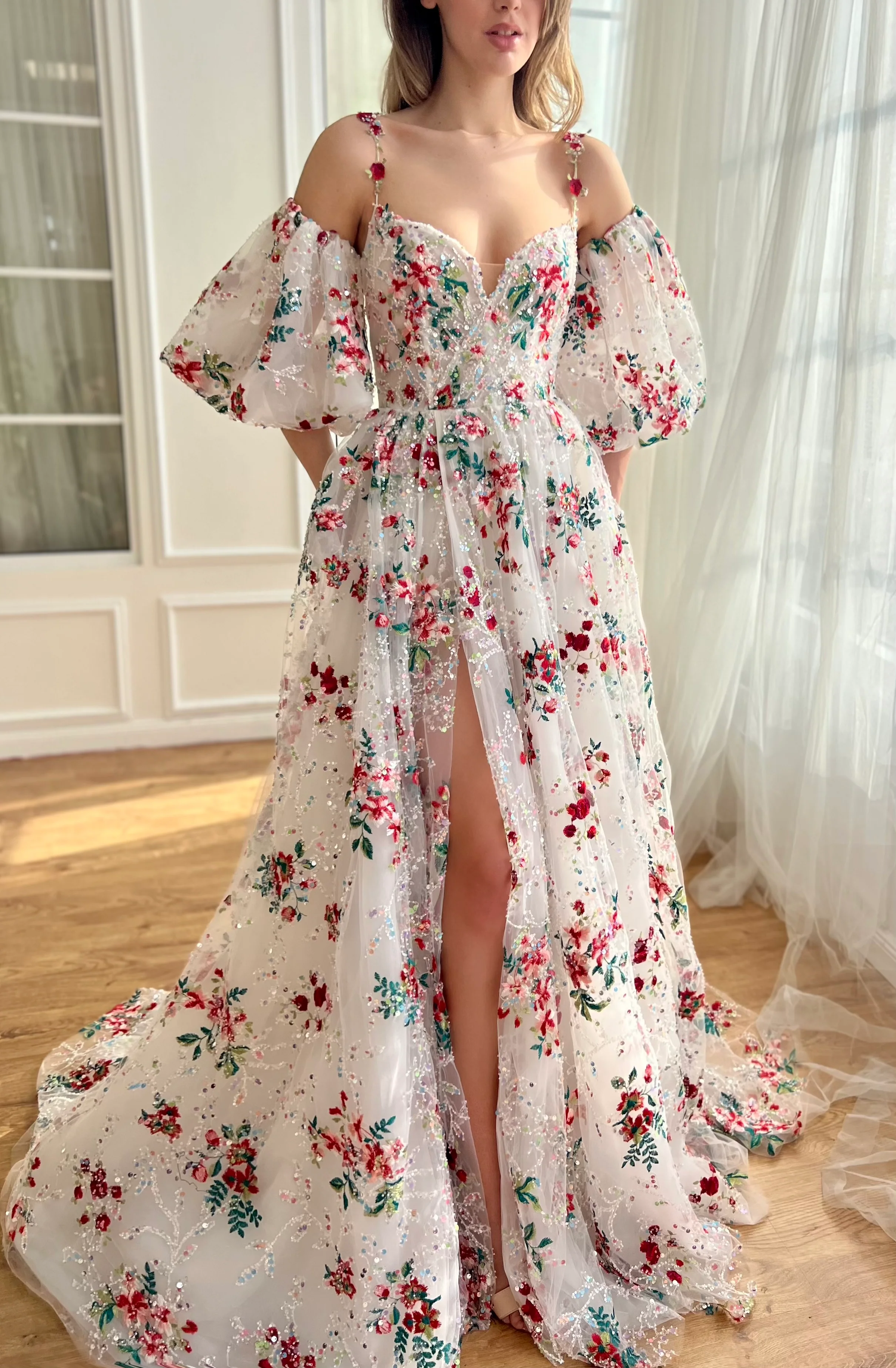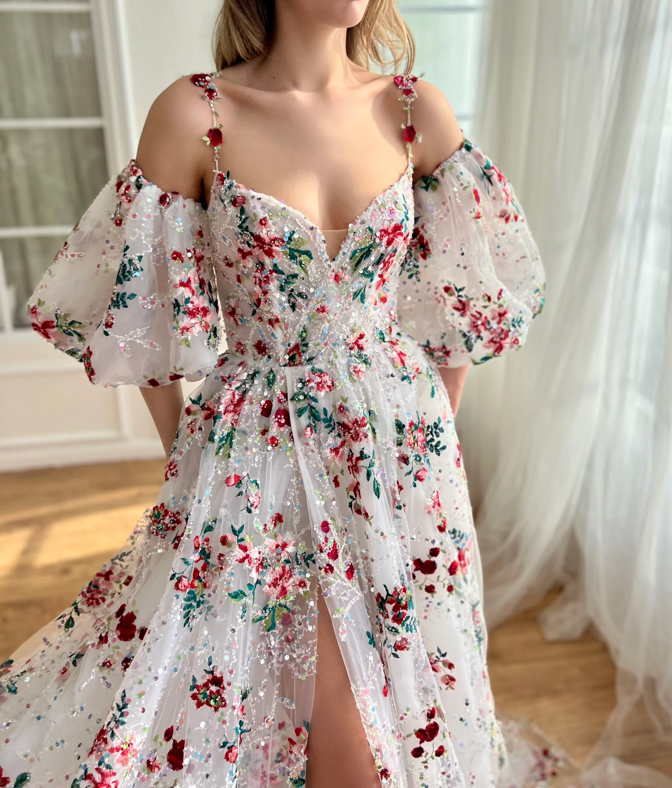 Introducing the epitome of enchanting elegance, our floor-length A-line dress, exquisitely tailored to captivate and charm. This masterpiece begins with a delicate ivory white lace base, intricately embroidered with floral motifs, and dazzling sequined embellishments that sparkle with every step. The sweetheart neckline and boned bodice sculpt a flattering silhouette, while off-shoulder puffy sleeves add a touch of romantic drama. Functional yet chic, the design includes inseam pockets and a stylish leg slit, complemented by a dramatic train that gracefully trails behind. The dress features a lace-up back to ensure a flawless fit, layers of soft tulle, and integrated shorts for comfort and coverage. Embellished blossom-designed straps add a final touch of charm, making this dress a perfect choice for any special occasion where you wish to make a memorable impression.