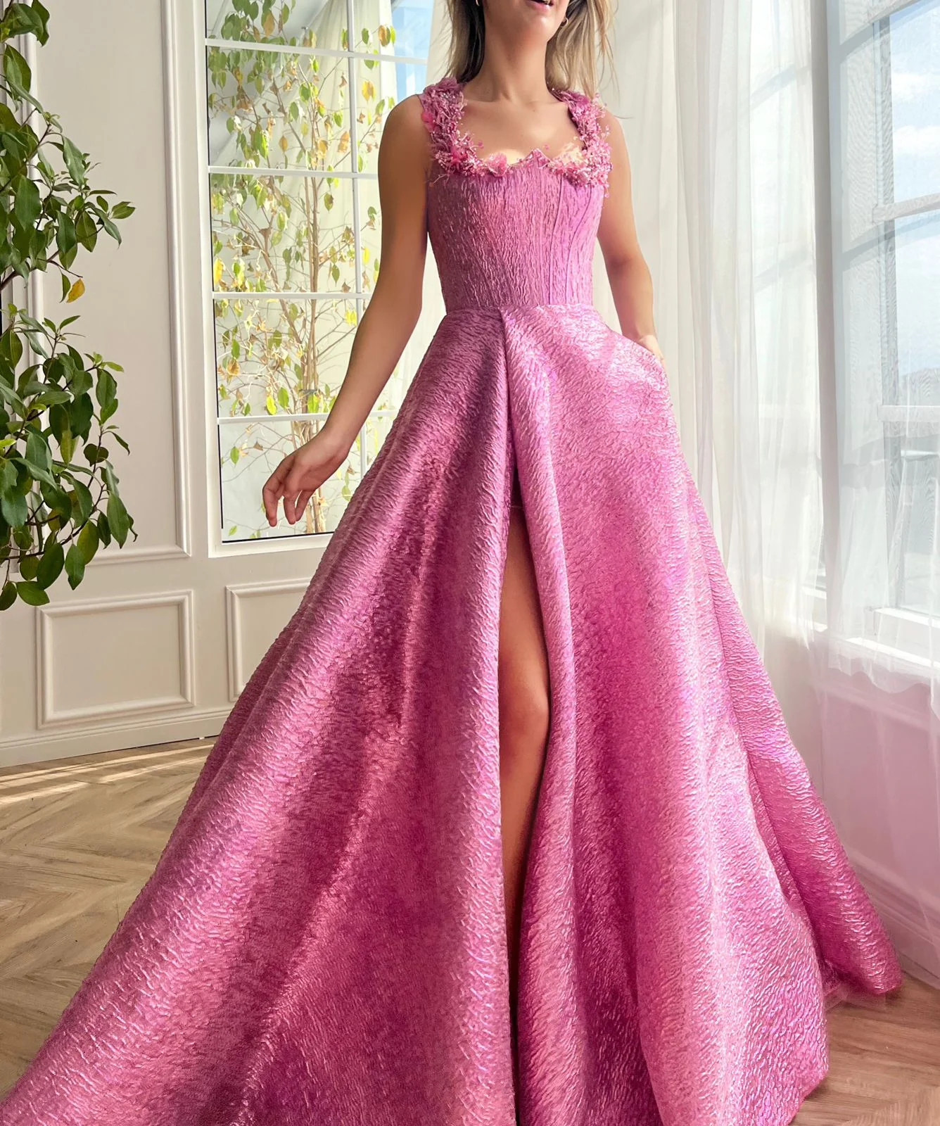 Experience the epitome of elegance in this stunning haute couture gown, designed for those who seek to make a royal statement at any special occasion. Crafted from shimmering rose brocade, the gown features a fully boned corset that enhances your figure, while the A-line silhouette lends a timeless touch of sophistication. A sultry leg slit adds a hint of allure, and the convenience of inseam pockets means you can keep your essentials close. The dress captivates with its upside-down heart back design, while the exquisite handmade embroidery, adorned with beaded floral motifs, showcases the meticulous attention to detail that elevates this gown from simply beautiful to truly extraordinary.
